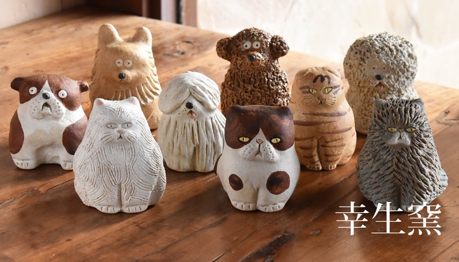 滋賀県の自然豊かな信楽の窯元にて作られる前川幸市さんの小さな動物たち。先代が切り開いた森の中、家族や従業員たちとひとつひとつ手作業にて生み出されています。 ずんぐりむっくり、短い足とふわふわさらさらな長毛が特徴です。ふわふわ猫は甘えん坊で撫でられるのが大好きです。グルグルグル、ゴロゴロゴロ・・・。 サイズ:約縦8.5cm×横7cm×高さ9.5cm ※全ての工程をひとつひとつ手作業で行ってる為、同じ商品でも少しずつ表情が異なります ※土の性質上、石はぜ(乾燥や焼成時に原土の中にあった石が土の表面に出てきた状態)や、黒点(焼成の際に鉄分が反応し黒い点となって現れること)などがみられる場合があります。 ※お品はオリジナル包装紙、オリジナルBOXでお包みしてお送りいたします ※今回入荷分は写真4枚目のA、Bになります