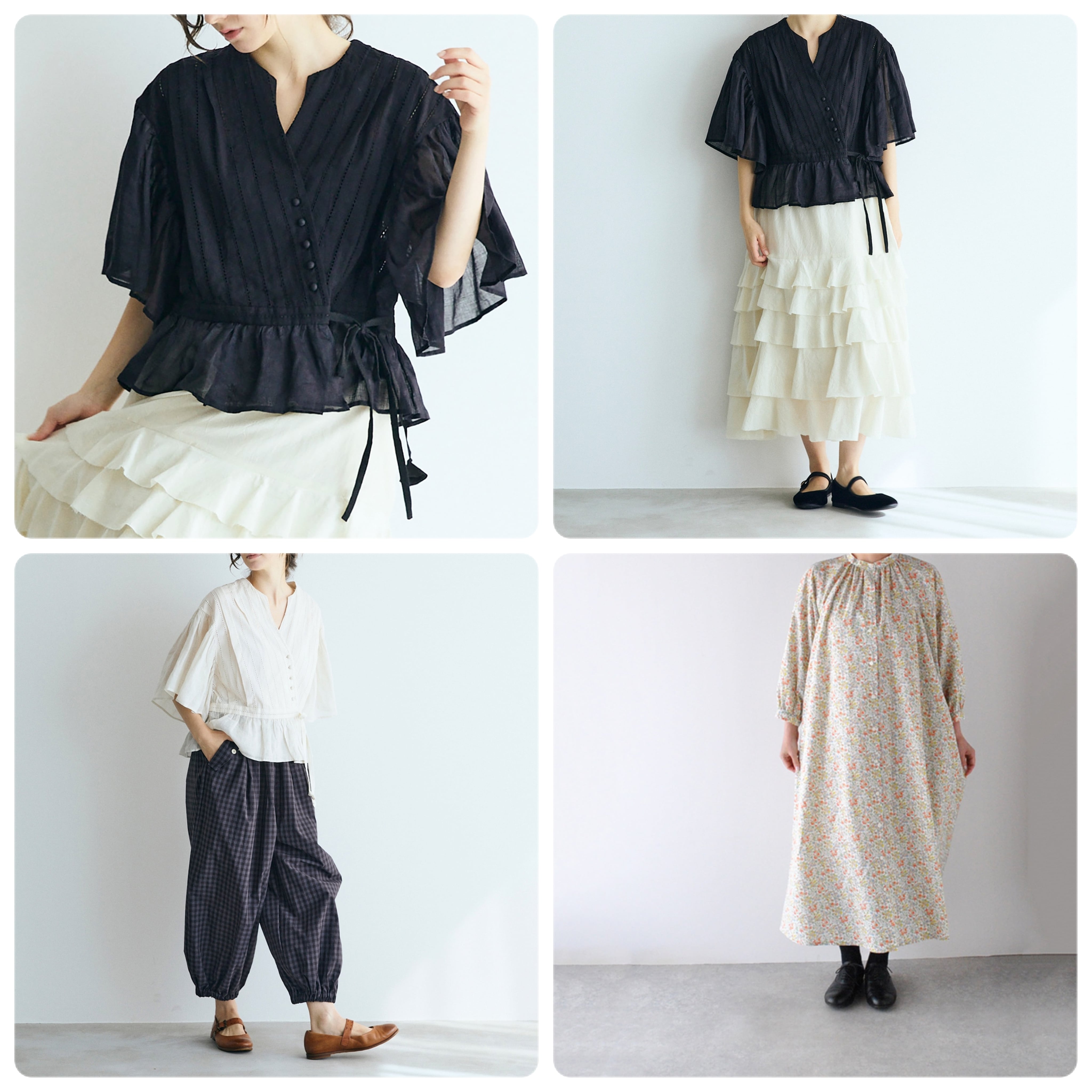 Vent d'ouestからリバティプリントの小花柄がクラシカルなギャザースカートが届きました。2段の切替えを入れたティアードデザインがとても美しく、シンプルなトップスと合わせるだけで上品に女性らしく楽しんで頂ける一枚です。さらりとした肌触りの薄手のタナローンコットンでとっても軽い履き心地。裏地付きなのも安心感がありますね。ちょっとかしこまったシーンにもぴったりなので、一枚あるときっと重宝してくれますよ。ゴムウエスト。 サイズ:38(約ウエスト60~94cm×総丈84cm) 素材:コットン100% 生産国:日本 ※着画の身長は158cmです ※サイズは全て平置きで採寸しています ※シワなどにより多少の誤差がございます