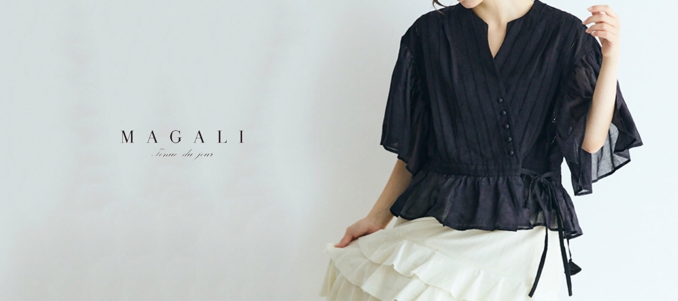 MAGALIから、ウエストのリボンをキュッと結んでカシュクールのようなデザインで楽しめる、コットンレースのブラウスが届きました。繊細なレースの表情と、空気を纏う様な軽やかさが魅力的な一枚です。広い袖にはたっぷりとギャザーを寄せ、動く度にふわりと揺れる姿がとっても美しいです。斜めに並んだクルミボタンも個性的。ブラウスとしてはもちろん、前を開けてワンピースに羽織ったコーディネートもオススメです。 サイズ:F(約肩幅55cm×身幅50cm×袖丈24cm×着丈(前)56cm(後)58cm) 素材:(表地)コットン100%(別布)ラミー100%(付属)クルミボタン ※着画の身長は162cmです ※サイズは全て平置きで採寸しています ※シワなどにより多少の誤差がございます ※表面に織フシやネップがある場合がありますが、天然繊維独特の特徴ですのでご了承ください。 ※タンブラー乾燥はお避け下さい