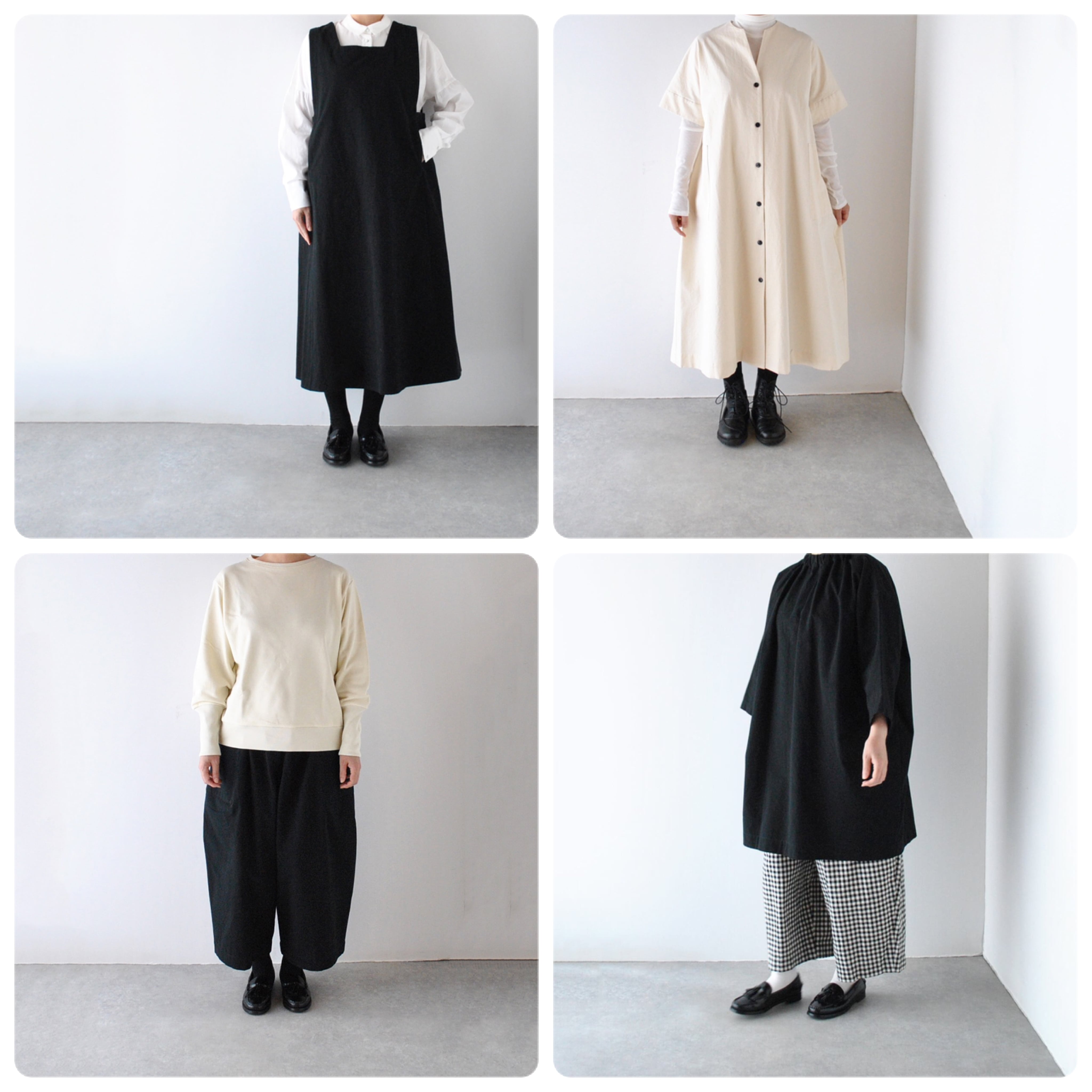 Atelier d'antanから、オリジナルコットンを使用したアトリエシリーズのワンピース「Zola (ゾラ)」が届きました。スッキリとしたキーネックから、バックスタイルに施されたタックによってゆるやかに広がるシルエットが美しく、一度着てみるとその上質で上品な佇まいを感じて頂ける一枚です。ボタンを全て開けて羽織りのように楽しむのもいいですね。肌寒い時期は長袖のインナーとの重ね着を、温かくなれば一枚で、と長いシーズン着用頂けますよ。旧式の織り機でゆっくりと織り上げられたアトリエシリーズの特別なコットンは、時間をかけてつくられる分、生地にふくらみがあり、マットな質感もとても上質な印象です。着こむほどにくたっとアンティークのような風合いに変化していくのも楽しみ。 サイズ:F(約身幅63cm×着丈114cm) 素材:コットン100% 生産国:日本 ※着画の身長は158cmです ※サイズは全て平置きで採寸しています ※シワなどにより多少の誤差がございます