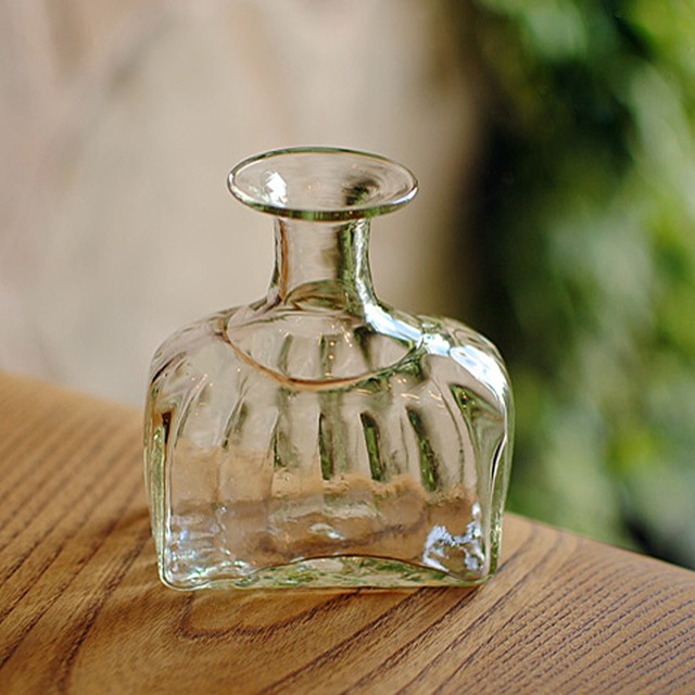 長野県に工房を構えるガラス工房 橙(だいだい)さんの一輪挿しです。くるみの殻を燃やした灰を原料とまぜ溶かして使うことで、ガラスが淡い緑の色になり、懐かしいレトロな風合いが生まれます。 サイズ:約7.5cm×4cm×高さ9cm ※同じ規格で作られるものですが、手作りの為、フォルムや柄のでかたなどにそれぞれ少しずつ個体差がございます。