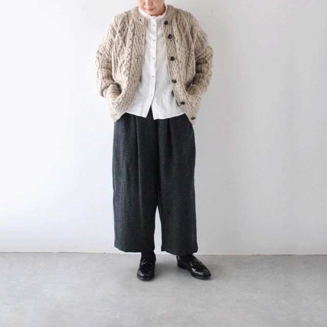 ichi Antiquitésから、ヘリンボン柄に織り上げたウールツィードが雰囲気の良いバギーパンツが届きました。ゆったりぽってりとした優しいシルエットは、見ているだけでほっこり和みますね。これからの季節はたっぷりとしたニットなどと合わせてゆる~いコーディネートで楽しんで頂くのがオススメ。Gジャンやジャケットなどとも相性がいいですよ。ふっくらとした生地感でとても温か。裏地付きなのも安心。ヒモ調節可能なゴムウエスト。ベルトループ有。 サイズ:F(約ウエスト66~104cm✕股上39cm×股下60cm×わたり幅39cm×総丈93cm) 素材:ウール100% made in Vietnam ※着画の身長は158cmです ※サイズは全て平置きで採寸しています ※シワなどにより多少の誤差がございます