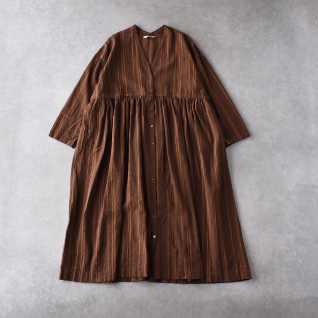 ichi Antiquités コットンリネンストライプ Vネックギャザーワンピース (ブラウン) 1100616