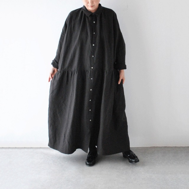 Gauze# から、ガーゼの様にふっくらと織り上げたリネン×ウールの素材感が心地よいワンピースが届きました。生地をたっぷりと贅沢に使用し、ウエストの両サイドにギャザーを寄せた、立体的で動きのあるシルエットがとても美しい一枚ですよ。2枚仕立てに仕立てた襟はぷっくりとしていて、くるっとロールしても、立てたままでもOK。ゆったりとした着用感と軽い着心地も嬉しいですね。一枚で主役として楽しめる、特別感のある冬のワンピースです。 サイズ:F(約肩幅53cm×身幅60cm×袖丈47cm×着丈122cm) 素材:リネン58%、ウール42% ※着画の身長は158cmです ※サイズは全て平置きで採寸しています ※シワなどにより多少の誤差がございます