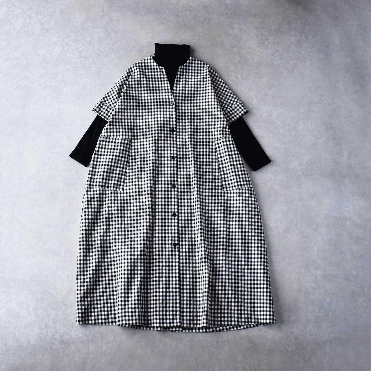 Atelier d'antanから、イタリア産の特別なギンガムチェックコットンで仕立てたワンピース「Zola(ゾラ)」が届きました。上質でナチュラルな風合いのオーガニックコットンは、程よい厚みがありながら、とても軽い着心地で楽しんで頂けます。スッキリとしたキーネックから、バックスタイルに施されたタックによってゆるやかに広がるシルエットが美しく、一度着てみるとその上質で上品な佇まいを感じて頂ける一枚です。ボタンを全て開けて羽織りのように楽しむのもいいですね。肌寒い時期は長袖のインナーとの重ね着を、温かくなれば一枚で、と長いシーズン着用頂けますよ。