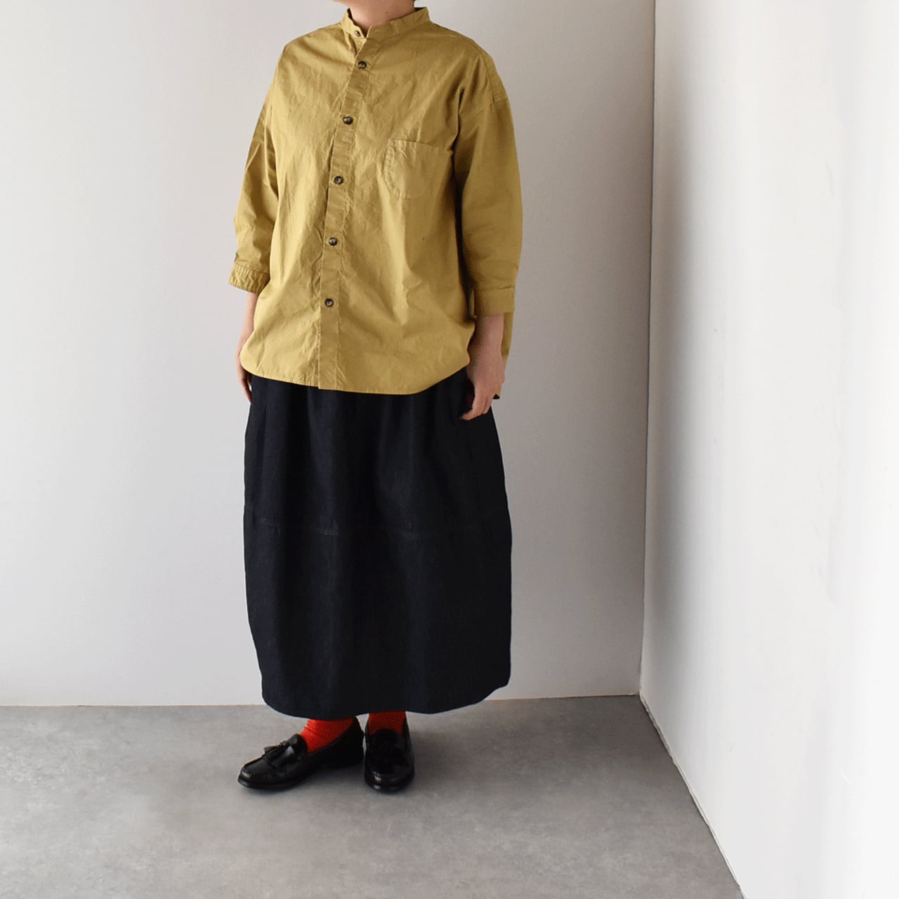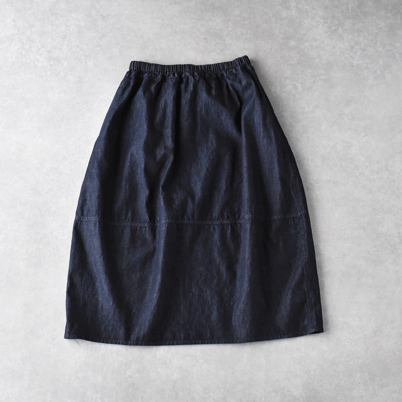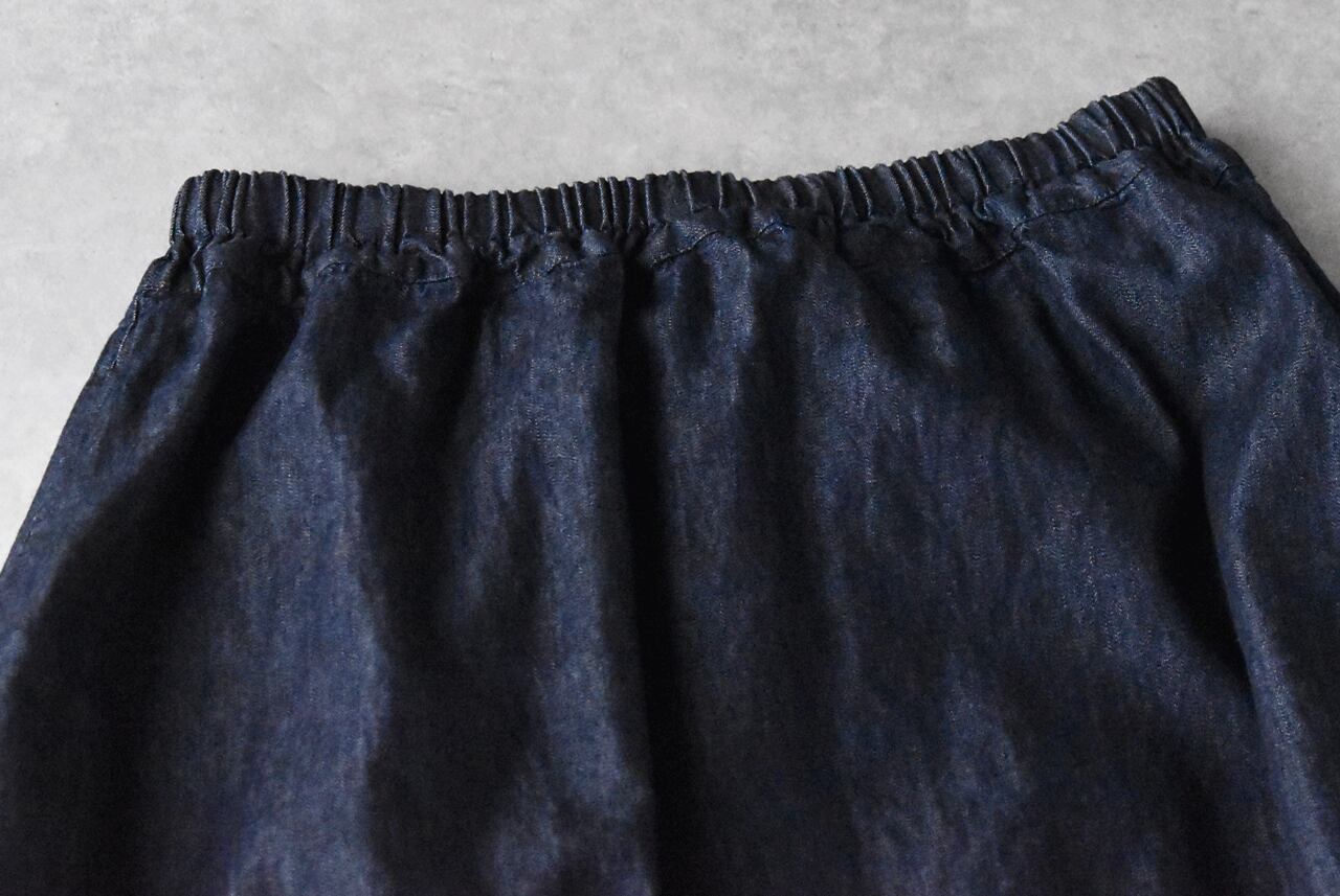 pritから、6オンスのライトウェイトデニムを使用した人気のコクーンスカートが届きました。何と言ってもこの丸みを帯びたコクーンシルエットが愛らしく、シンプルなトップスを合わせるだけでとってもバランスの良いコーディネートに仕上げてくれる頼もしい一枚。デニムなのに重さや堅さのないとてもしなやかな生地感で、しっかりとコクーンフォルムをキープしてくれます。履き心地も軽く透け感もないので、本当に使いやすいですよ。春の着こなしに一枚あるととっても重宝するオススメアイテムです。ヒモ調節可能なゴムウエスト。