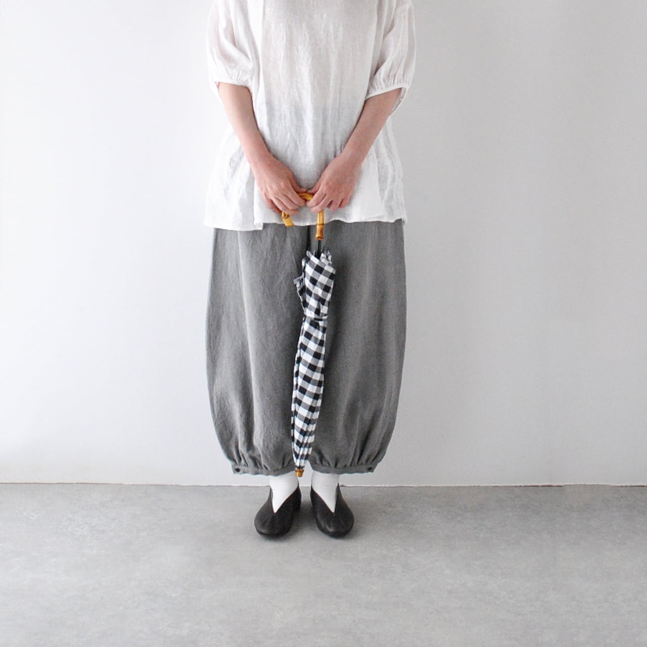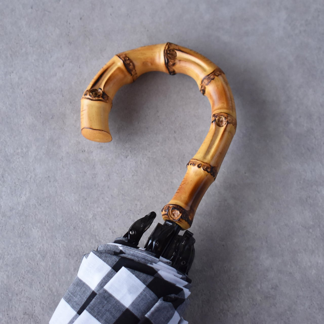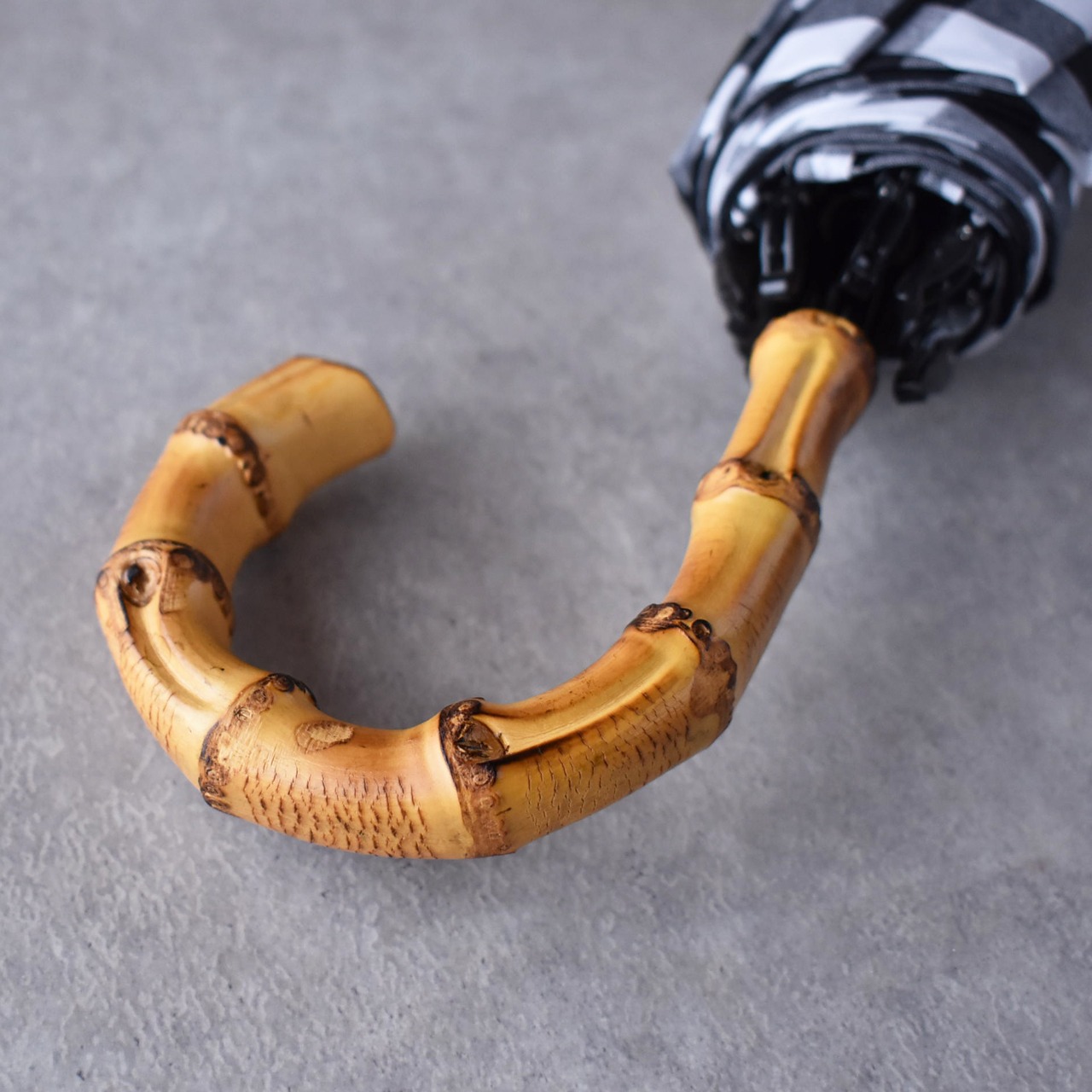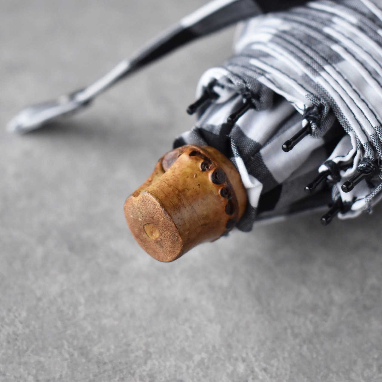 東京・吉祥寺で北欧やイギリスの雑貨を販売されているCINQ(サンク)さんがオリジナルで製作されている日傘です。こちらは携帯に便利な折りたたみタイプです。竹の持ち手がクラシックな雰囲気で、軽くするために骨の内側は樹脂で仕上げられています。生地はUV95%カット・撥水加工を施した張りのあるコットンで、日傘としてはもちろん、雨傘としても使える晴雨兼用。ベルトが内外両側に付いているので、傘を伸ばした状態で長傘のようにして持ち歩く事が出来るなど、とても良く考えてデザインされているのも嬉しいです。