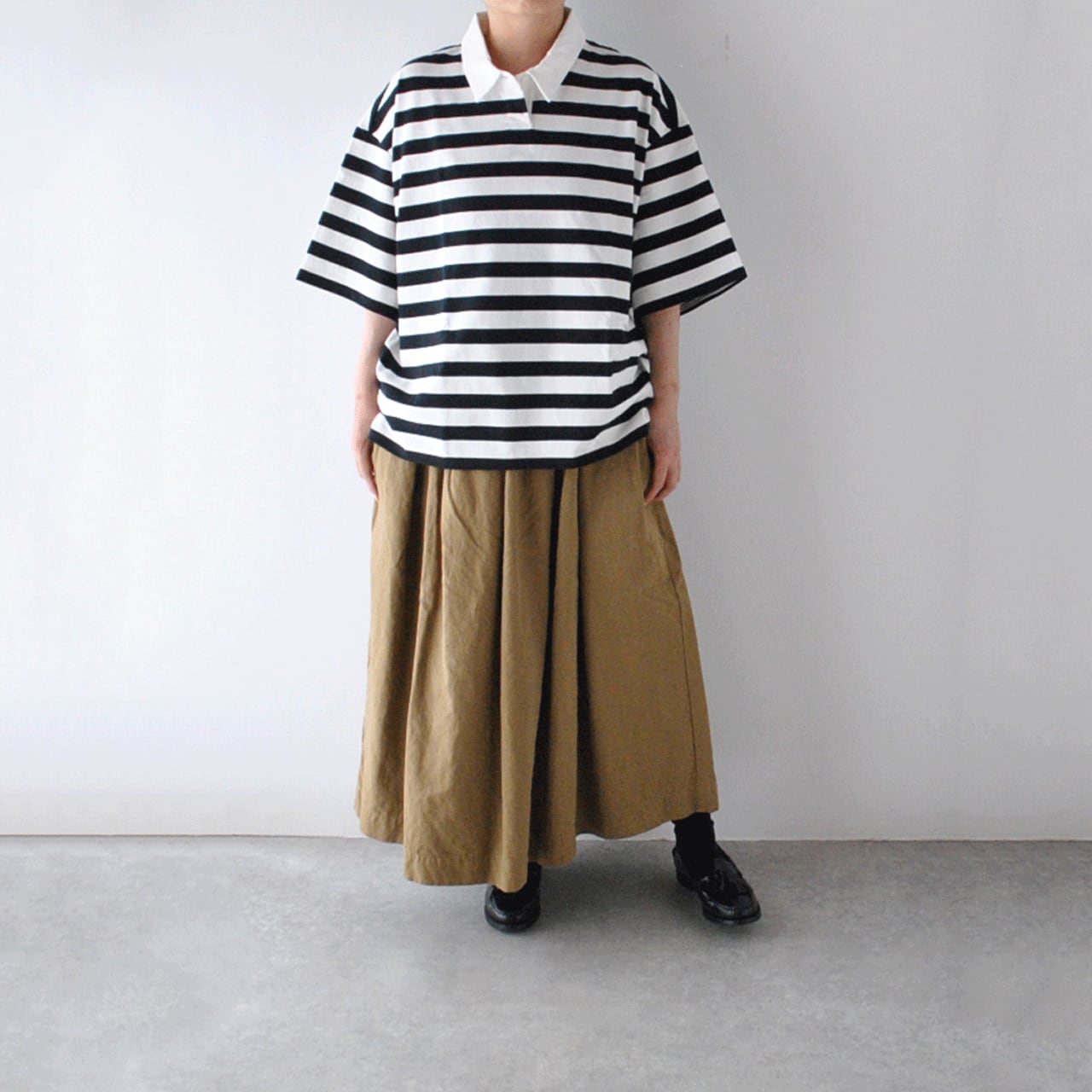 ichiから、ゆったりとしたビッグシルエットが可愛いバスクコットンのラガーシャツが届きました。ゆったりのサイズ感ですが、襟周りがコンパクトなので女性らしく楽しんで頂ける一枚。しっかりとした肉感のコットンですが、しなやかな生地感でとても着心地がいいですよ。ボトムにインした着こなしもオススメ。