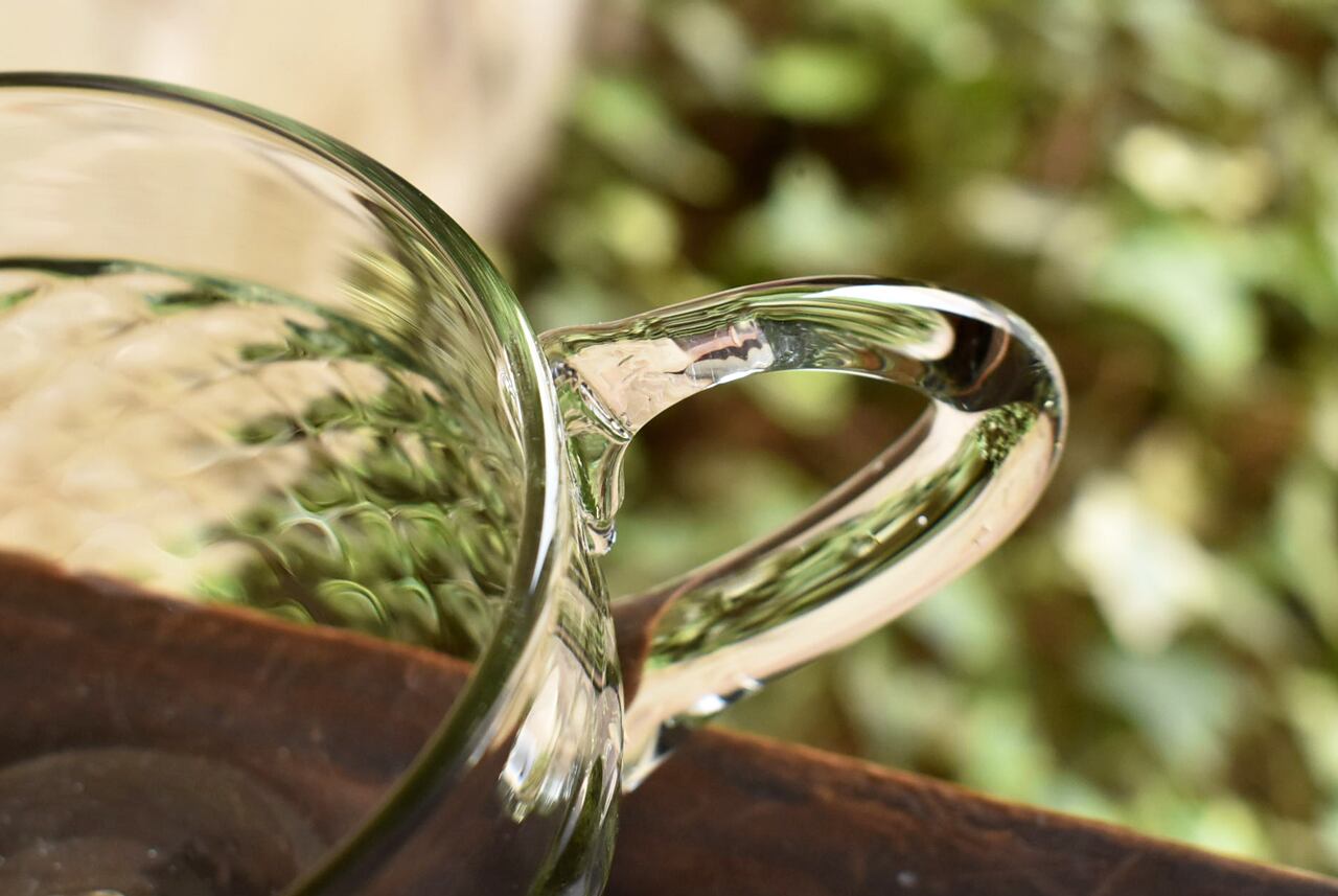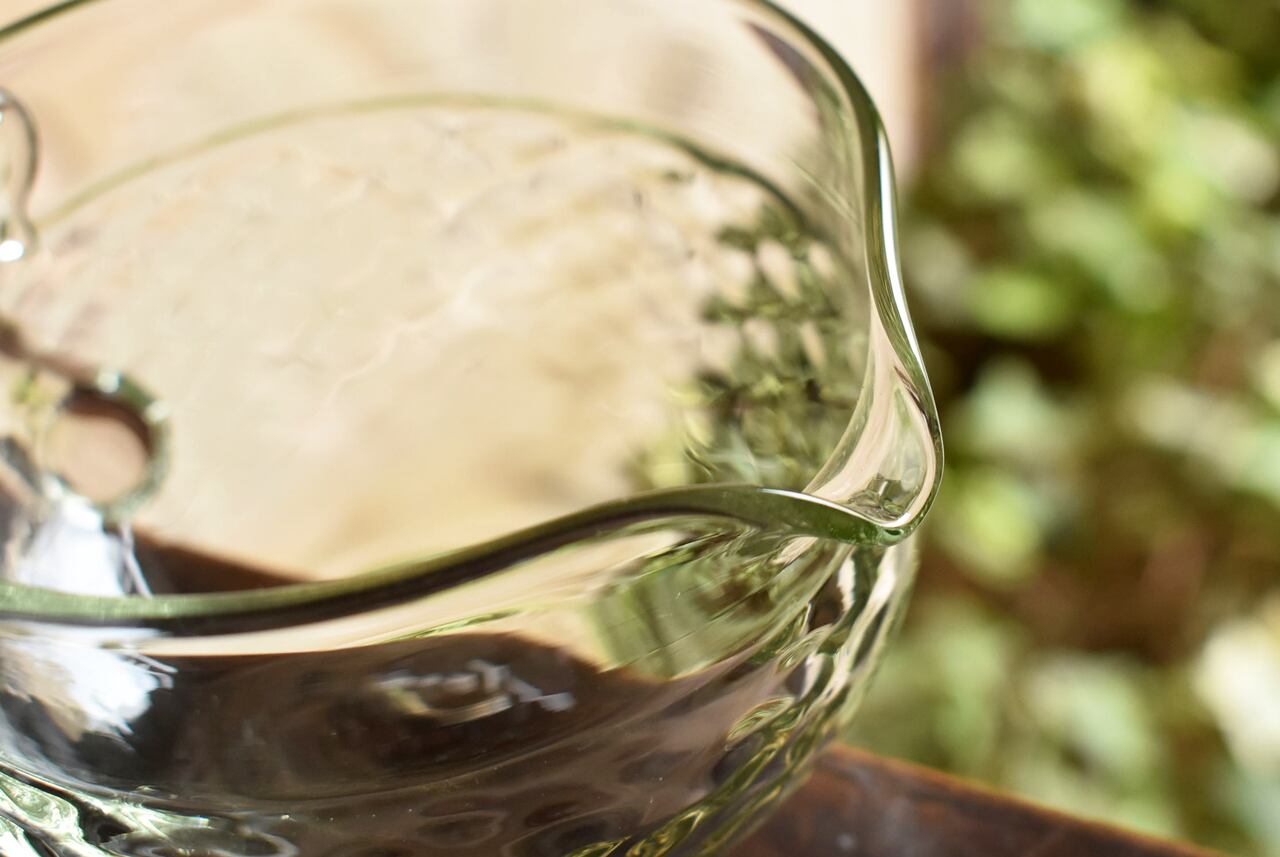 長野県に工房を構えるガラス工房 橙(だいだい)さんのドレッシングピッチャーです。コロンとした小ぶりな丸型のフォルムがとても愛らしく、ドレッシングはもちろん、ミルクや色んなソースを入れてとても便利に使って頂けます。くるみの殻を燃やした灰を原料とまぜ溶かして使うことで、ガラスが淡い緑の色になり、懐かしいレトロな風合いが生まれます。