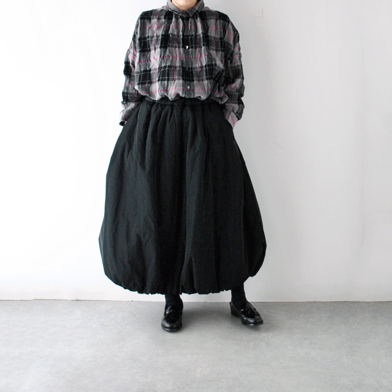 Gauze# から、中綿素材でとっても温かく履いて頂けるスカートが届きました。SUNSTATEと呼ばれるハイテク素材は、同じ厚みのダウンと比べて2倍の保温力を誇る優れもの。唯一無二の存在感を放つコクーンフォルムもとっても可愛いですよ。裏地に使用した箔加工を施したコットンもポイント。見た目の印象よりも全然軽く履いて頂けます。上半身をコンパクトに見せてくれるので、とってもスタイル良く見せてくれますよ。