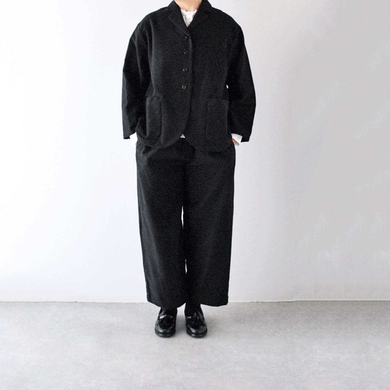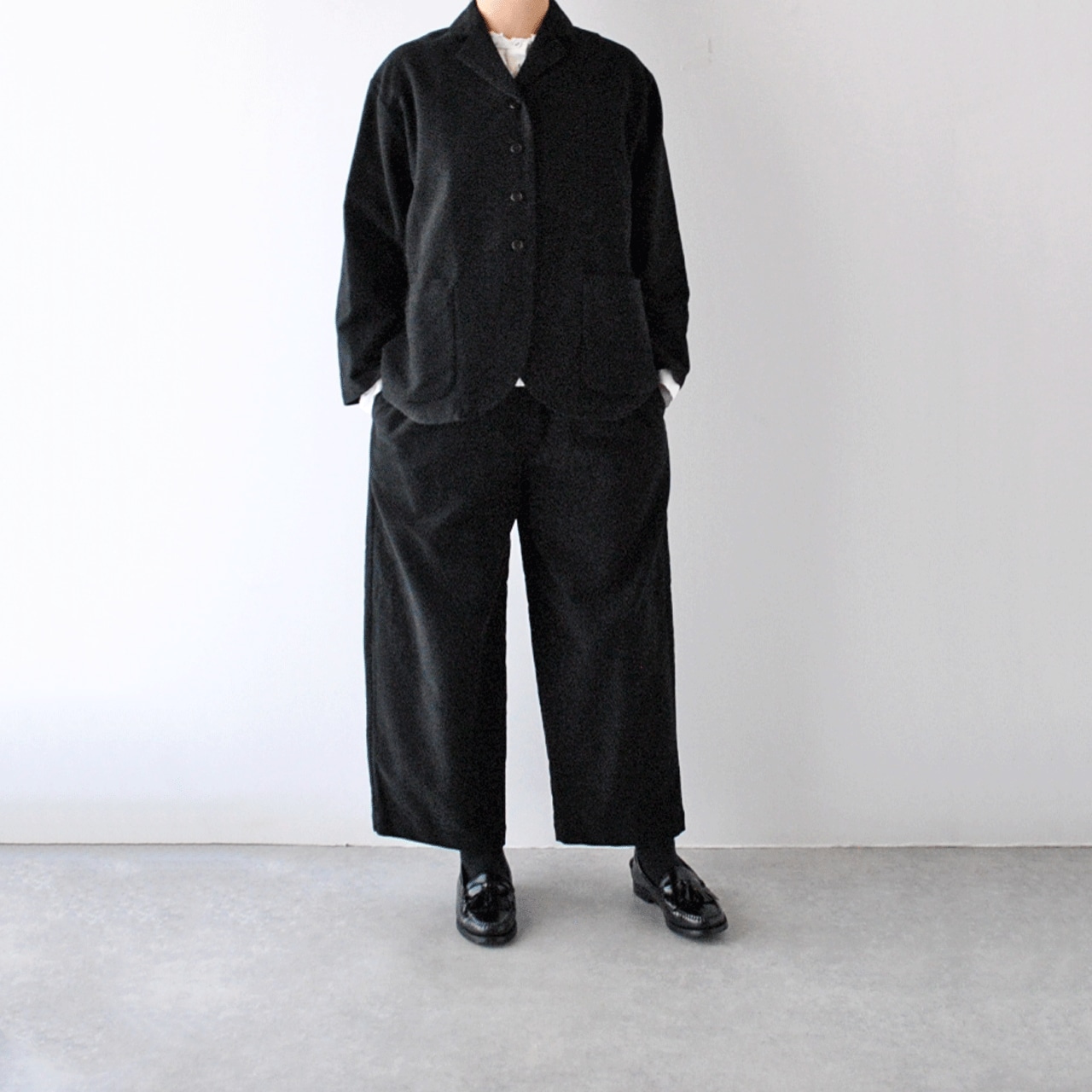 Atelier d'antanから、モールスキンコットンで仕立てたテーパードパンツ「シャンボン」が入荷しました。ベルベットのような滑らかな肌触りと軽い履き心地がAtelier d'antanらしい上質な一枚。ゆったりとした腰周りから裾にかけて緩やかにテーパードした丸みのあるシルエットとアンクル丈のバランスが絶妙で、シンプルなトップスと合わせるだけで本当に雰囲気よく仕上げてくれますよ。ヒモ調節出来るゴムウエストで、前開きファスナー仕様ですので、とってもラクチン。同素材のジャケット「ティケ」とのセットアップもめちゃくちゃ素敵ですよ。