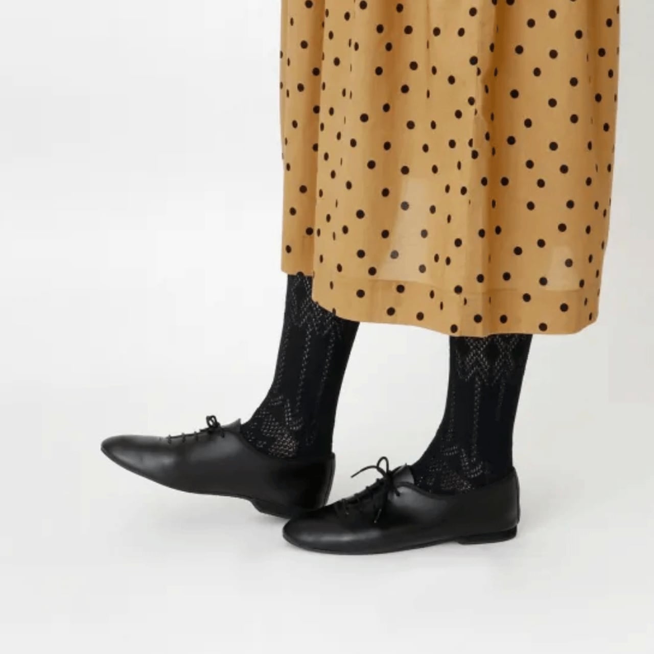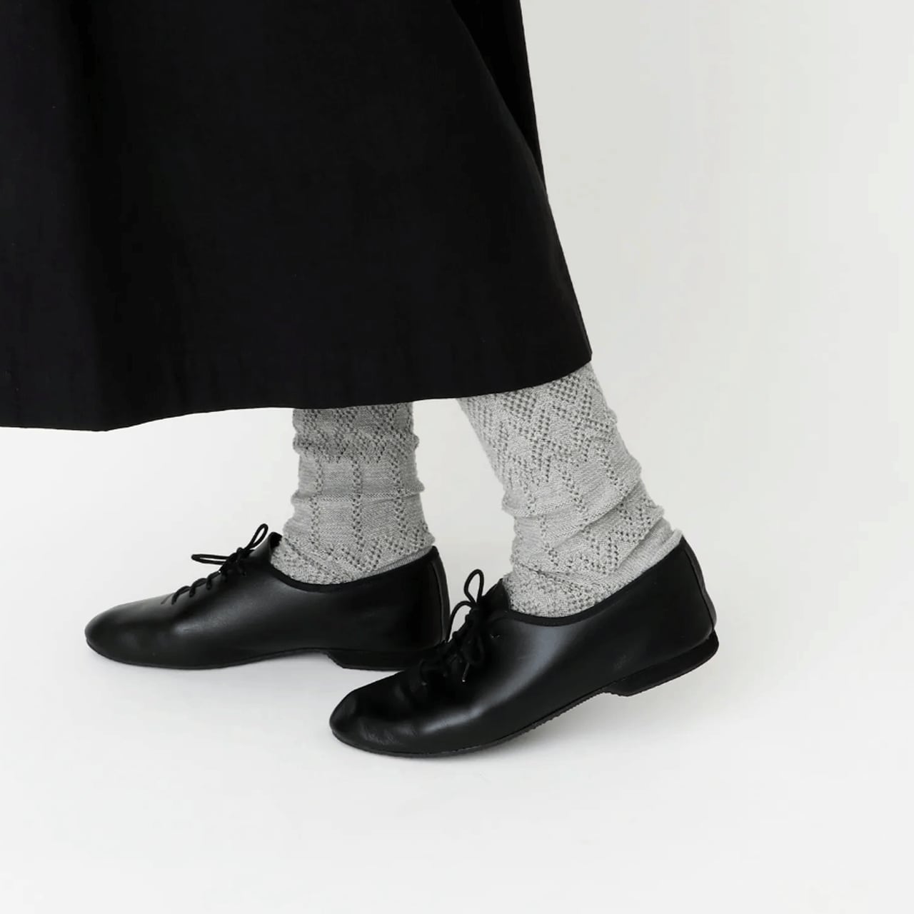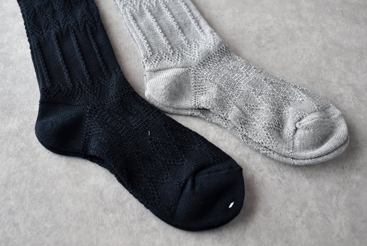 French Bullから、秋冬向けの新作ソックスが届きました。繊細なメッシュ編み柄が女性らしい印象のロング丈のハイソックスです。柔らかな綿糸で程よい厚みに編み上げているので伸びがよく、タイツのようにスカートやワンピースに合わせると素敵ですよ。クシュッとさせて足元にボリュームをもたせるのもいいですね。お洋服に合わせてコーディネートを楽しめる一足です。
