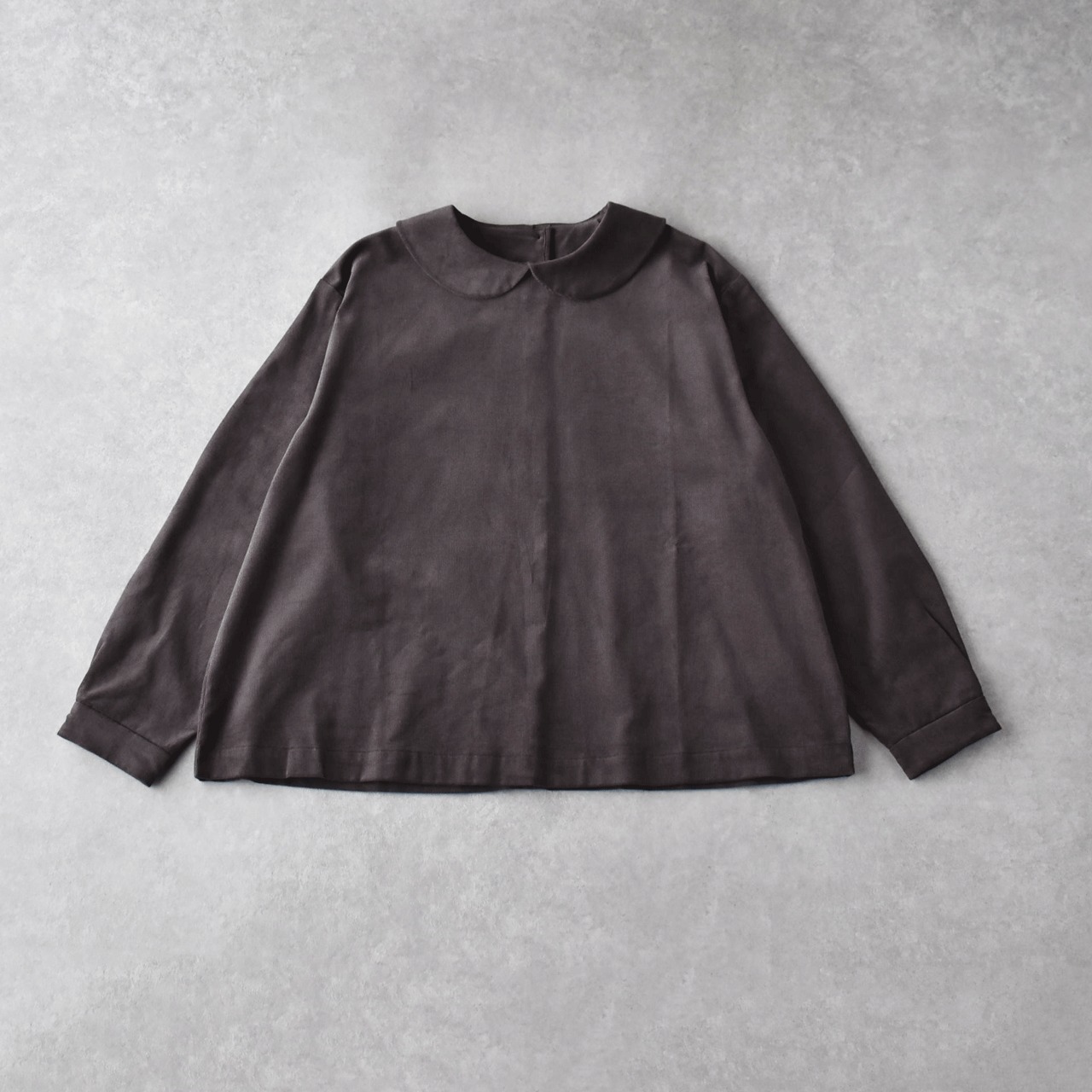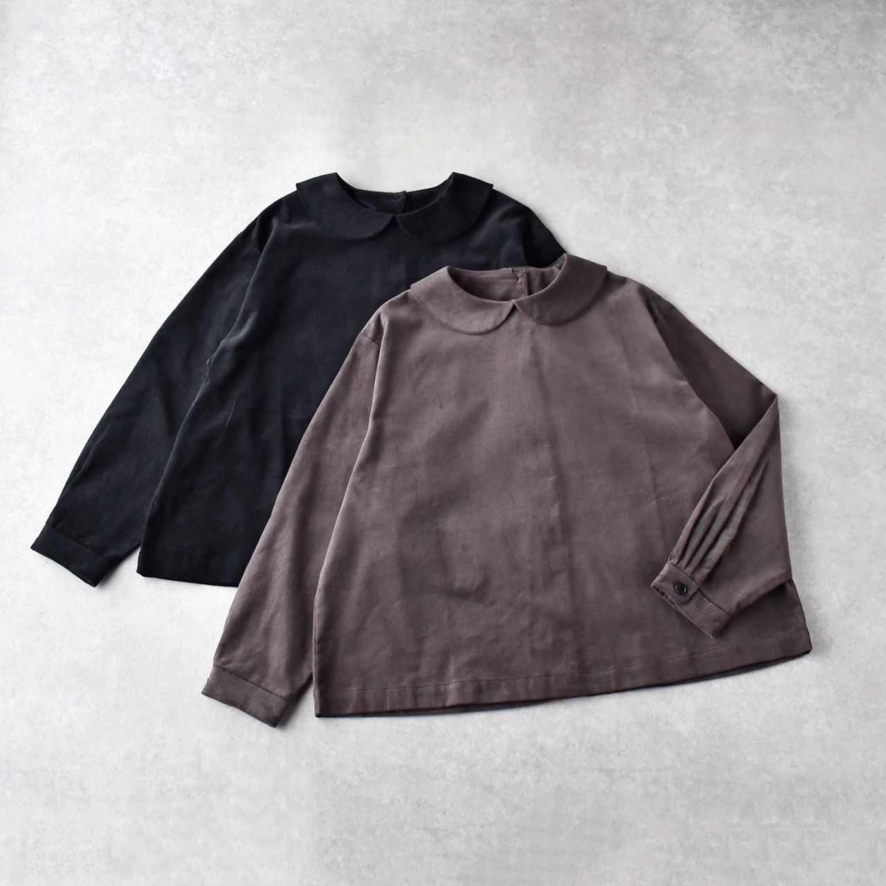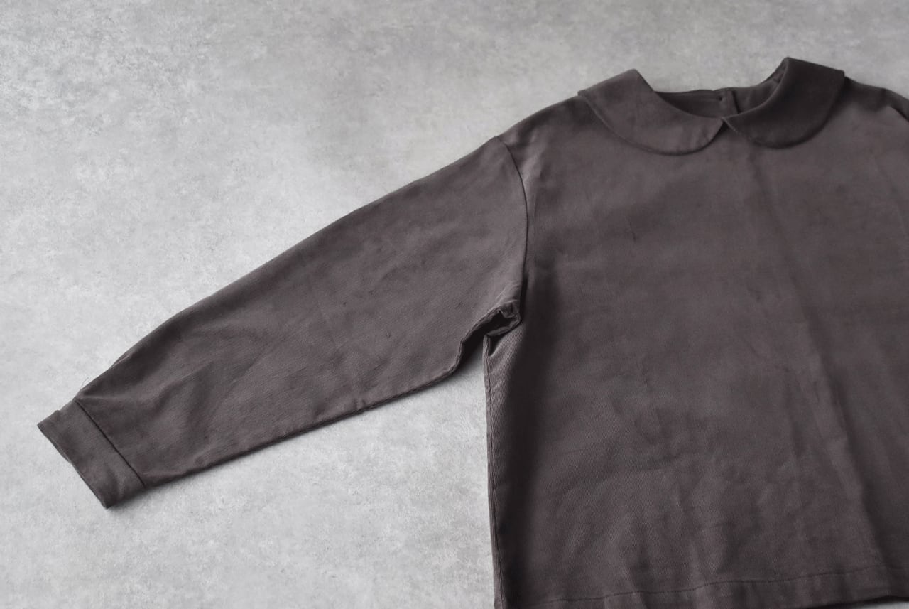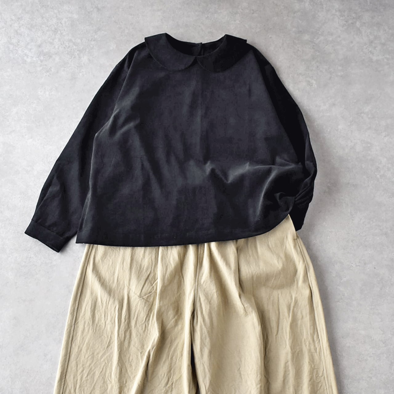 Cionからピッチの細かな細ウネのコーデュロイで仕立てたプルオーバーブラウスが届きました。コーデュロイにありがちな堅さがなく、程よい厚みのあるとってもしなやかな生地感ですよ。愛らしい丸襟もシックな色味で仕上げることで落ち着いた上品な印象。様々なボトムとシンプルに楽しんで頂ける一枚です。