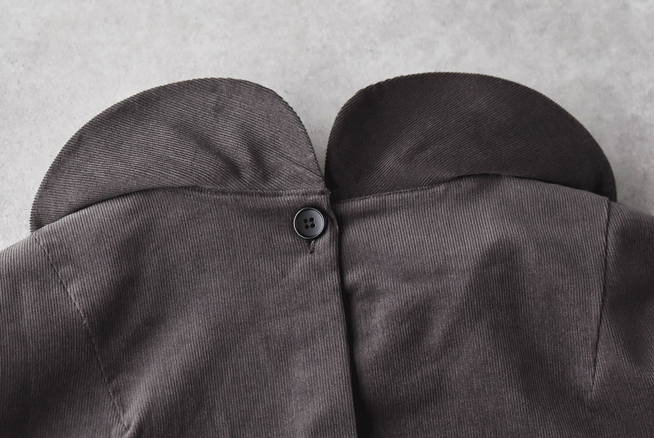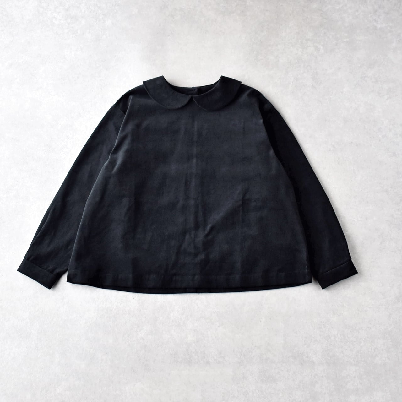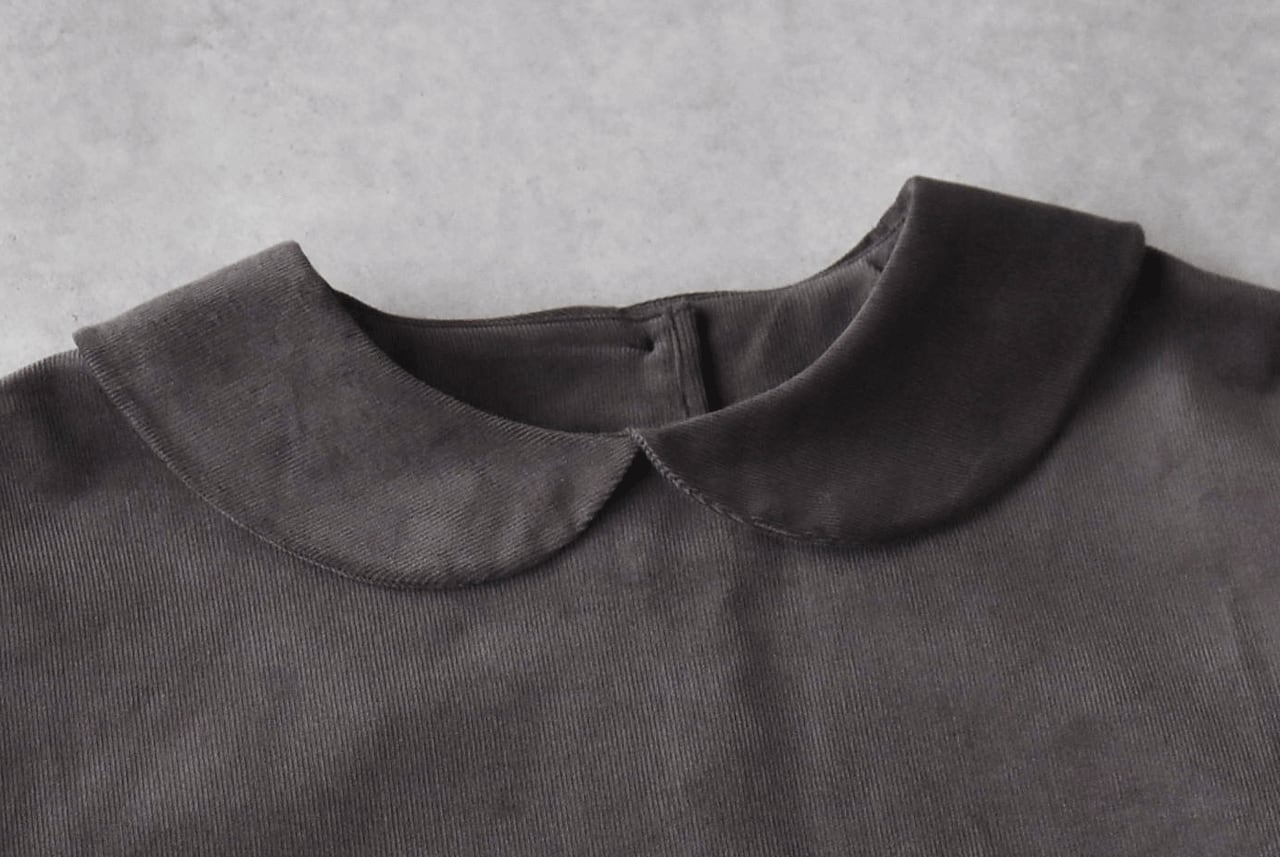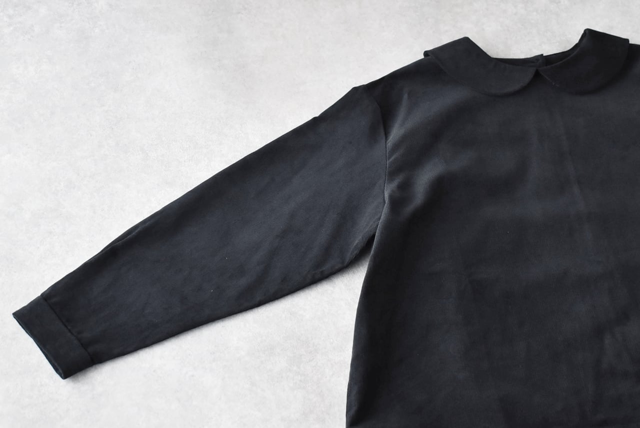 Cionからピッチの細かな細ウネのコーデュロイで仕立てたプルオーバーブラウスが届きました。コーデュロイにありがちな堅さがなく、程よい厚みのあるとってもしなやかな生地感ですよ。愛らしい丸襟もシックな色味で仕上げることで落ち着いた上品な印象。様々なボトムとシンプルに楽しんで頂ける一枚です。