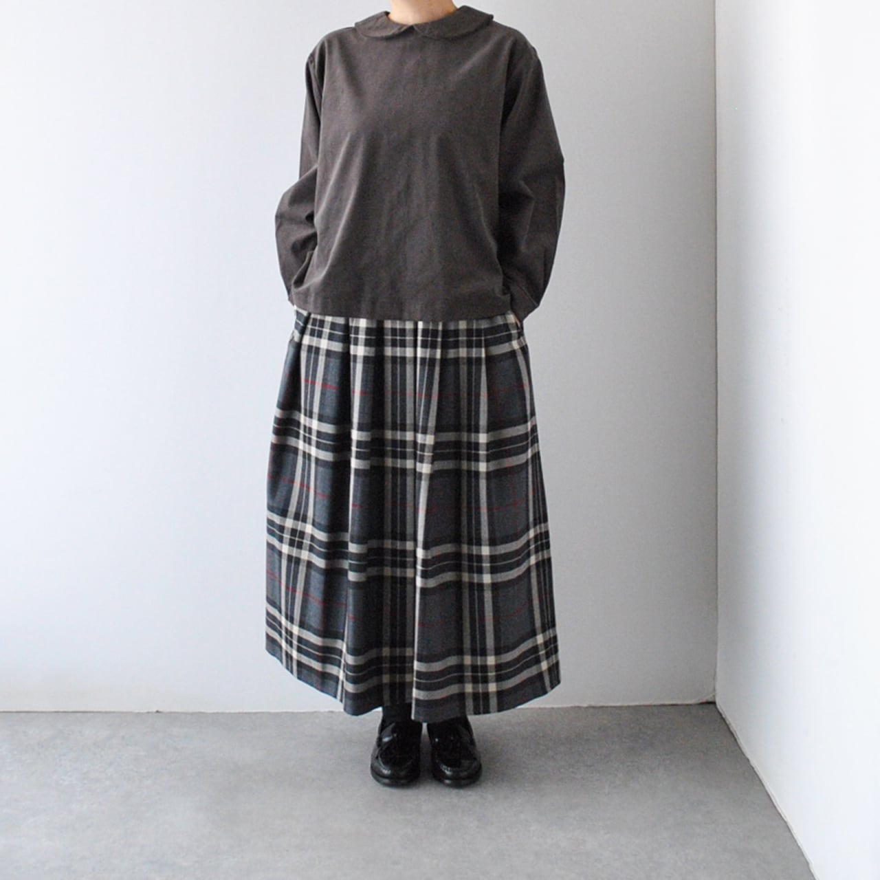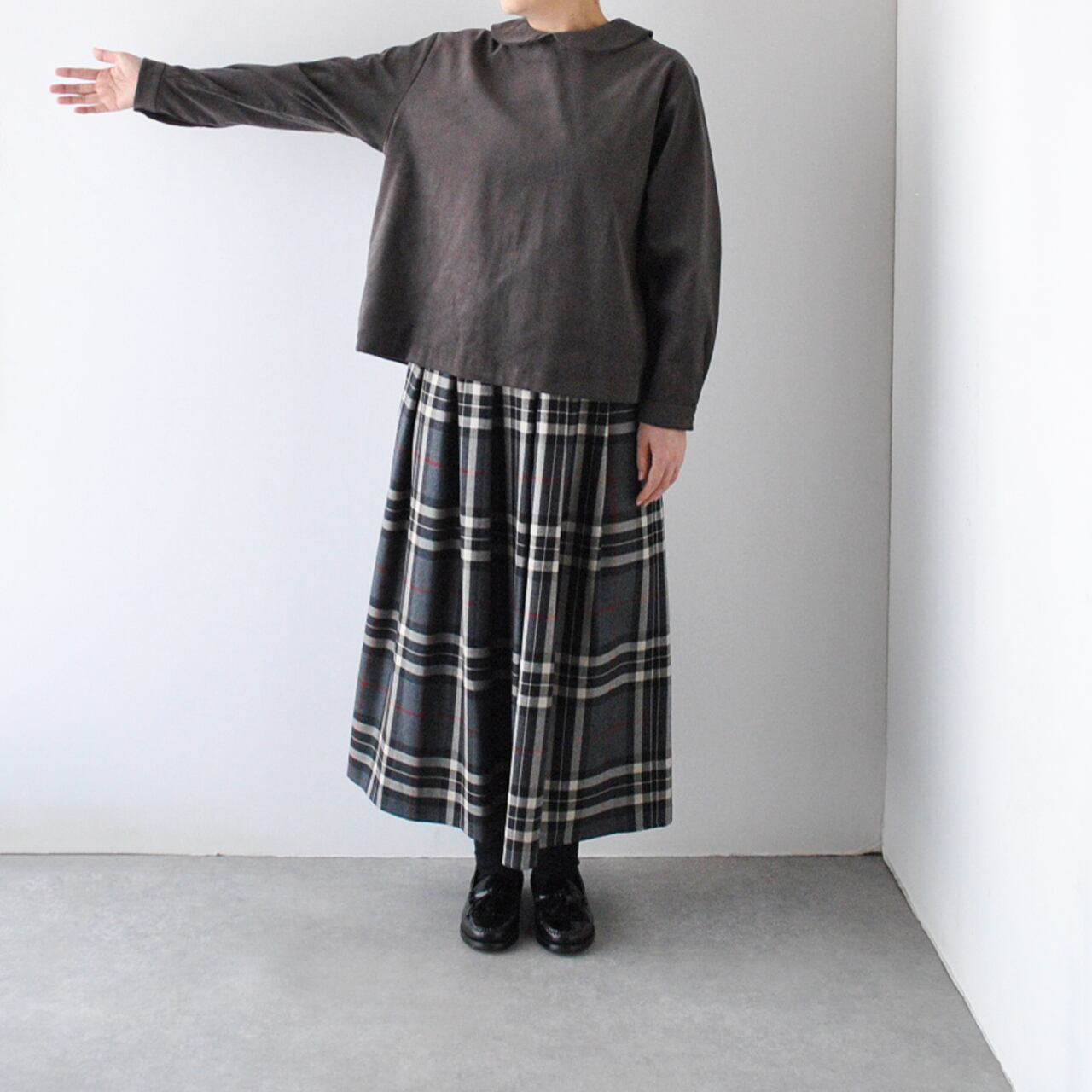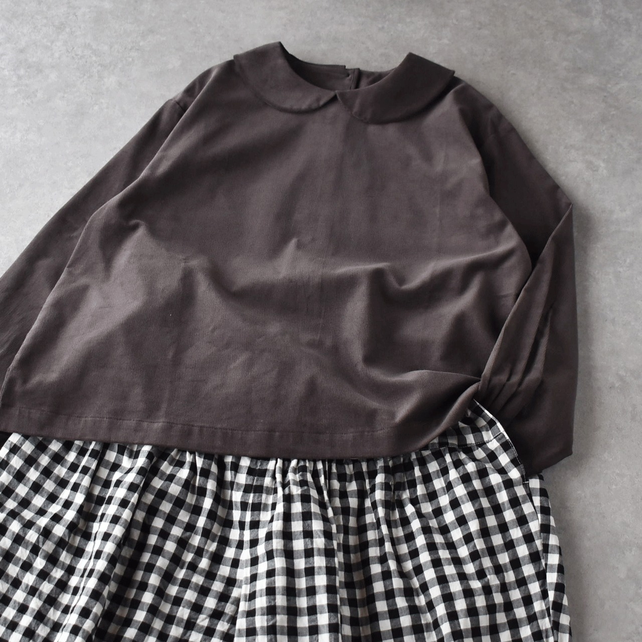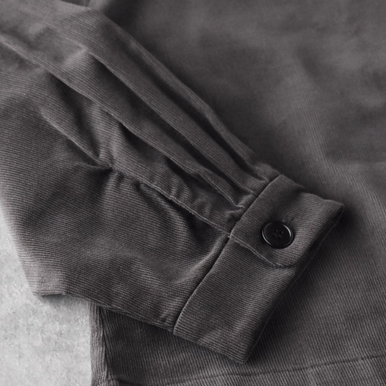 Cionからピッチの細かな細ウネのコーデュロイで仕立てたプルオーバーブラウスが届きました。コーデュロイにありがちな堅さがなく、程よい厚みのあるとってもしなやかな生地感ですよ。愛らしい丸襟もシックな色味で仕上げることで落ち着いた上品な印象。様々なボトムとシンプルに楽しんで頂ける一枚です。