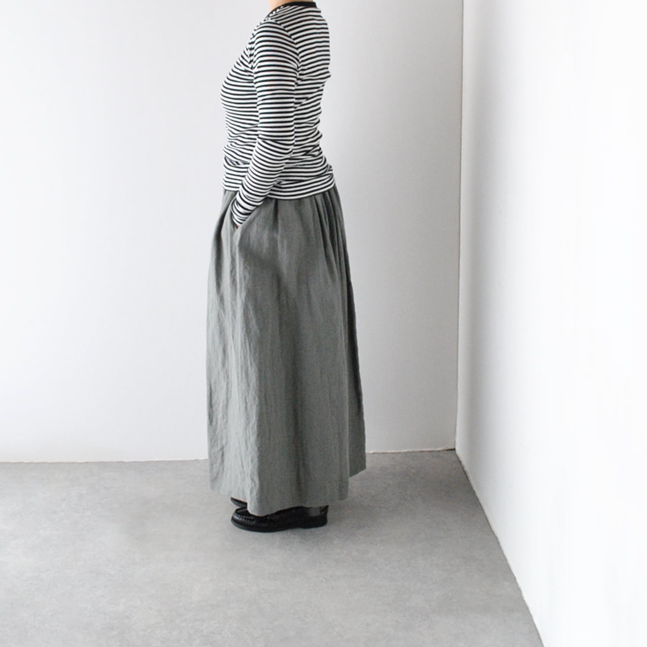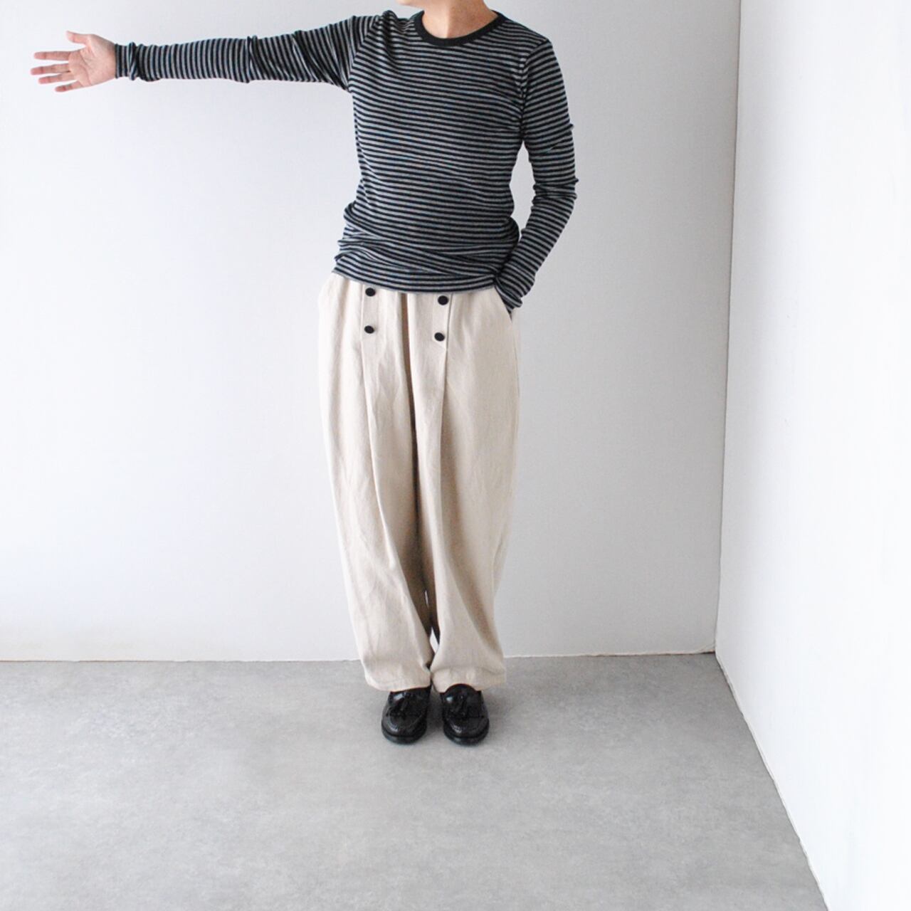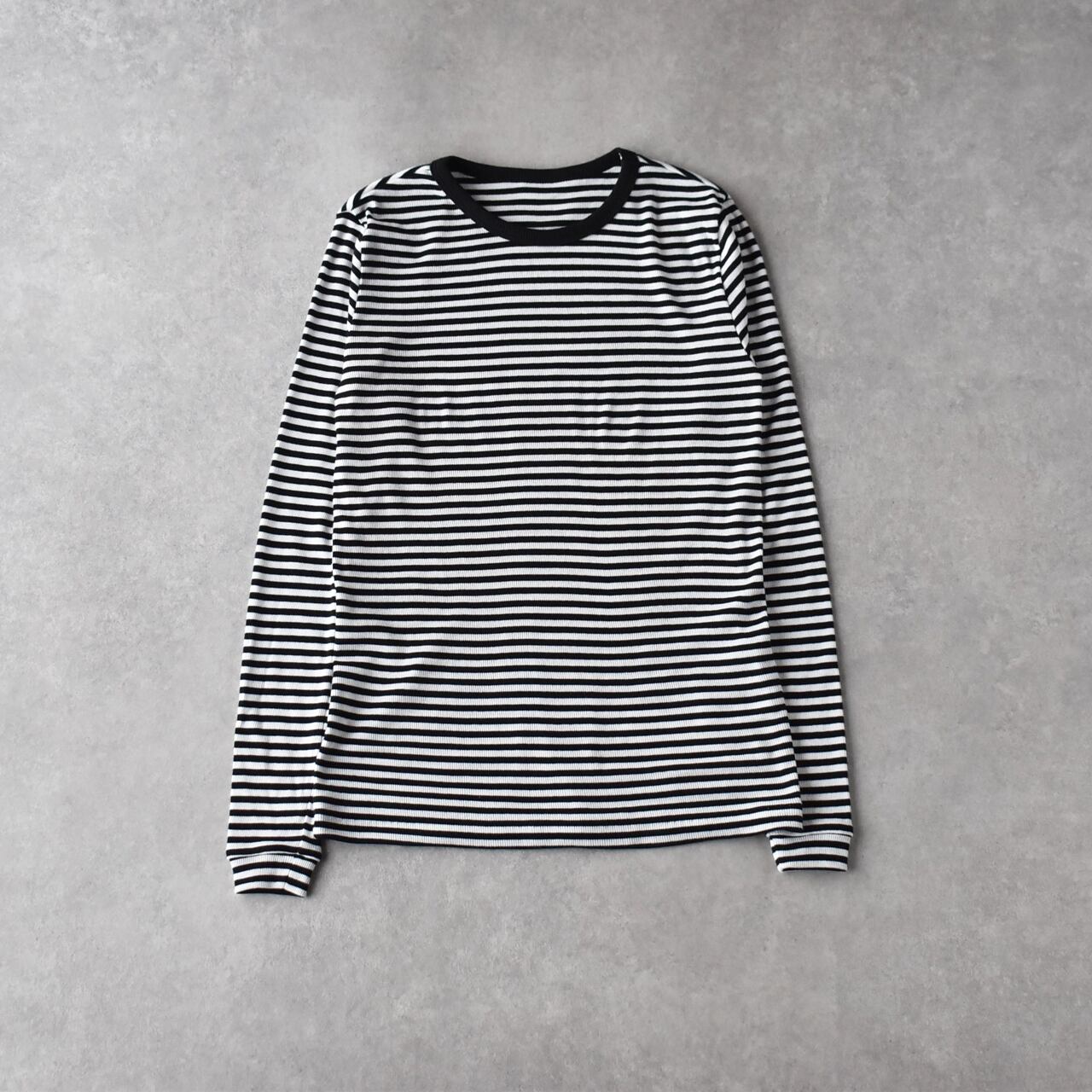 細ピッチのボーダーが使いやすい、Cionのコットンニットカットソー。伸びが良く、程よいフィット感で着心地抜群ですよ。様々なボトムとシンプルに合わせても絵になり、ジャケットやカーディガンのインナーとしてもコーディネートしやすいです。一枚あると本当に便利で、これからの季節についつい手が伸びる事間違いなしですよ。