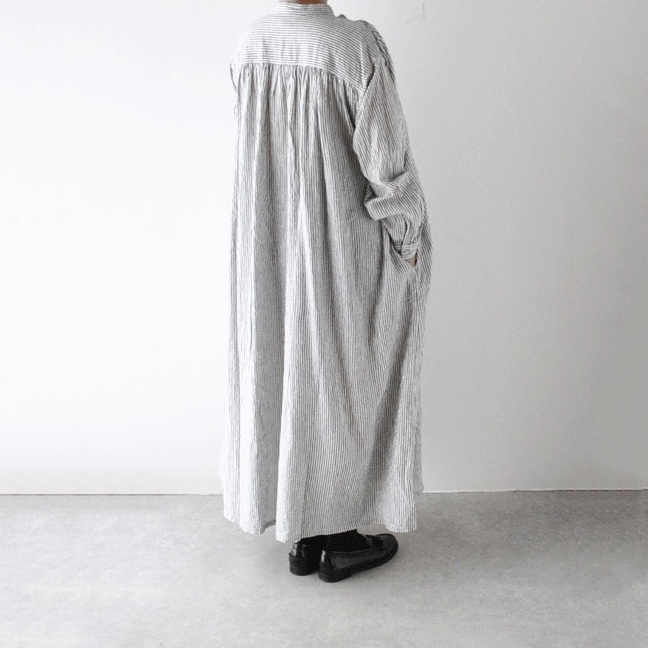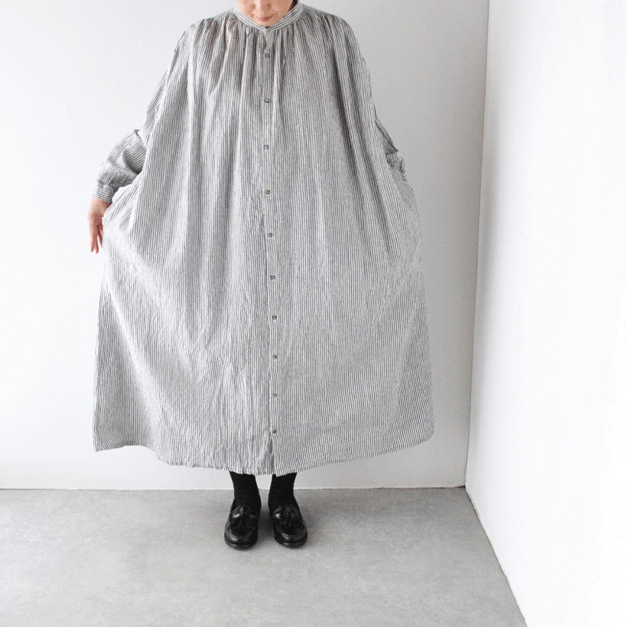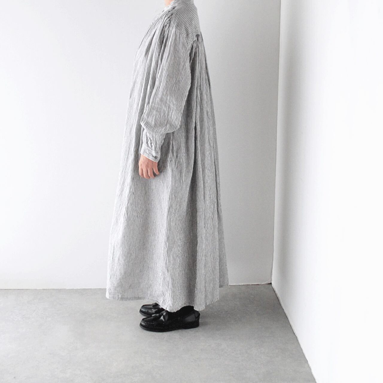ichi Antiquitesから、大人っぽい印象でゆったりと楽しめるリネンコットンのストライプワンピースが届きました。前後の肩口と襟元にたっぷりと寄せたギャザーが、流れる様なドレープを生み出すとても美しい一枚。程よい厚みとしっかりとしたコシのある生地感、ドライな質感で、長いシーズン着用頂けます。シンプルに一枚で、肌寒くなればアウターを重ねても、とても雰囲気のあるスタイルに仕上がりますよ。