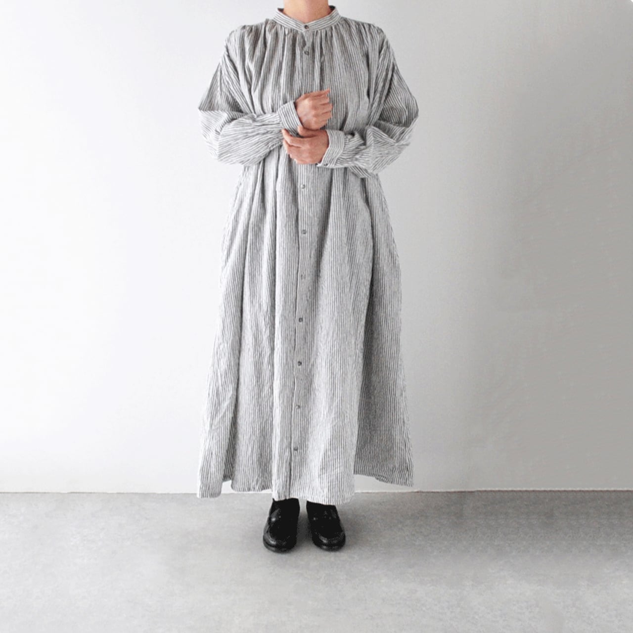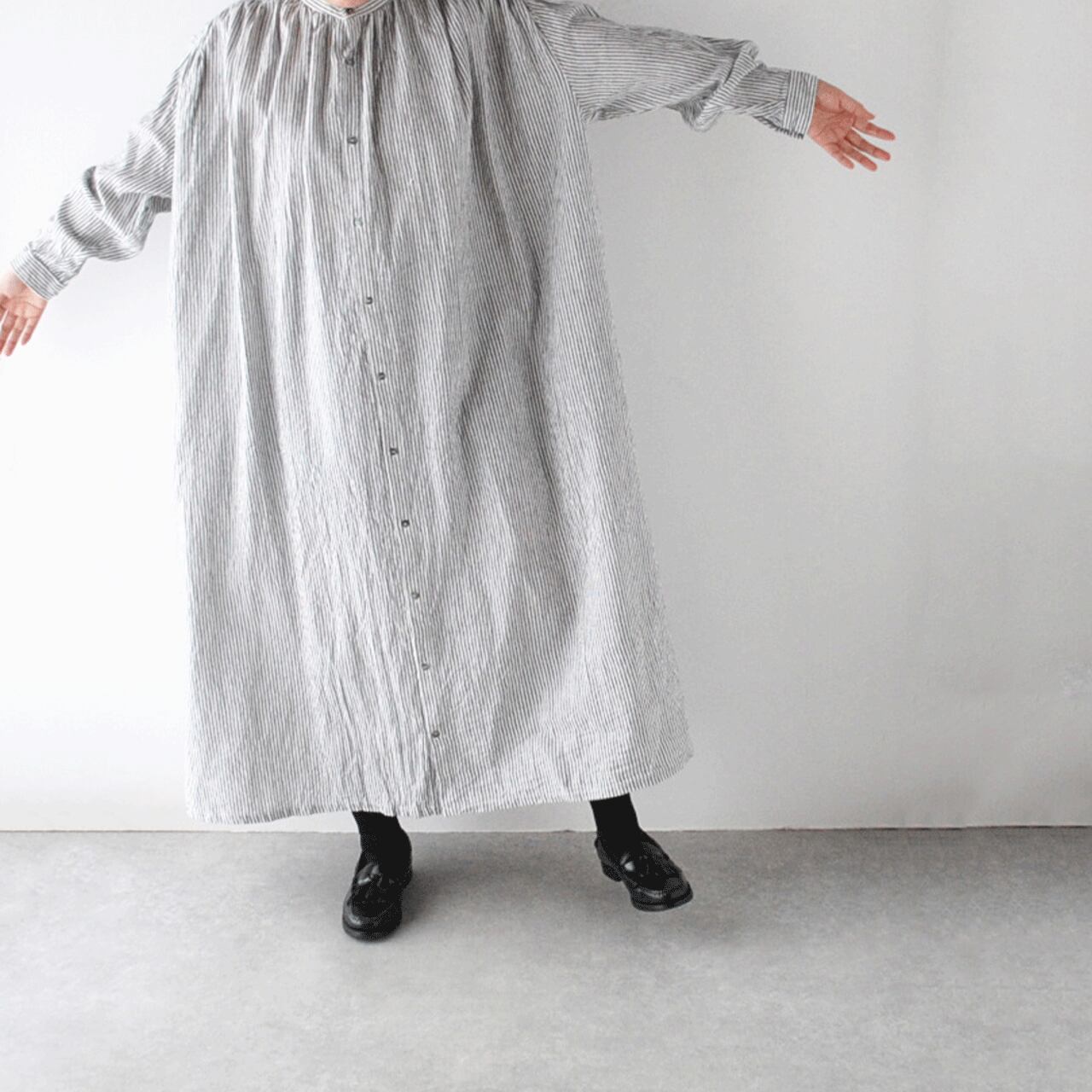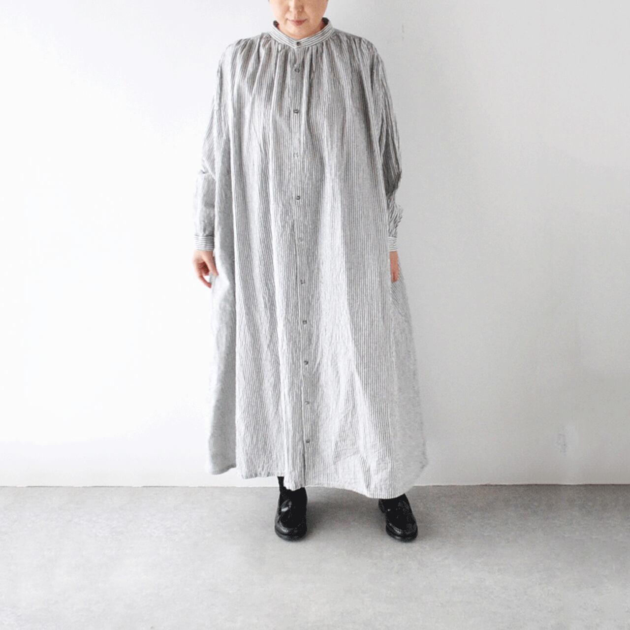 ichi Antiquitesから、大人っぽい印象でゆったりと楽しめるリネンコットンのストライプワンピースが届きました。前後の肩口と襟元にたっぷりと寄せたギャザーが、流れる様なドレープを生み出すとても美しい一枚。程よい厚みとしっかりとしたコシのある生地感、ドライな質感で、長いシーズン着用頂けます。シンプルに一枚で、肌寒くなればアウターを重ねても、とても雰囲気のあるスタイルに仕上がりますよ。
