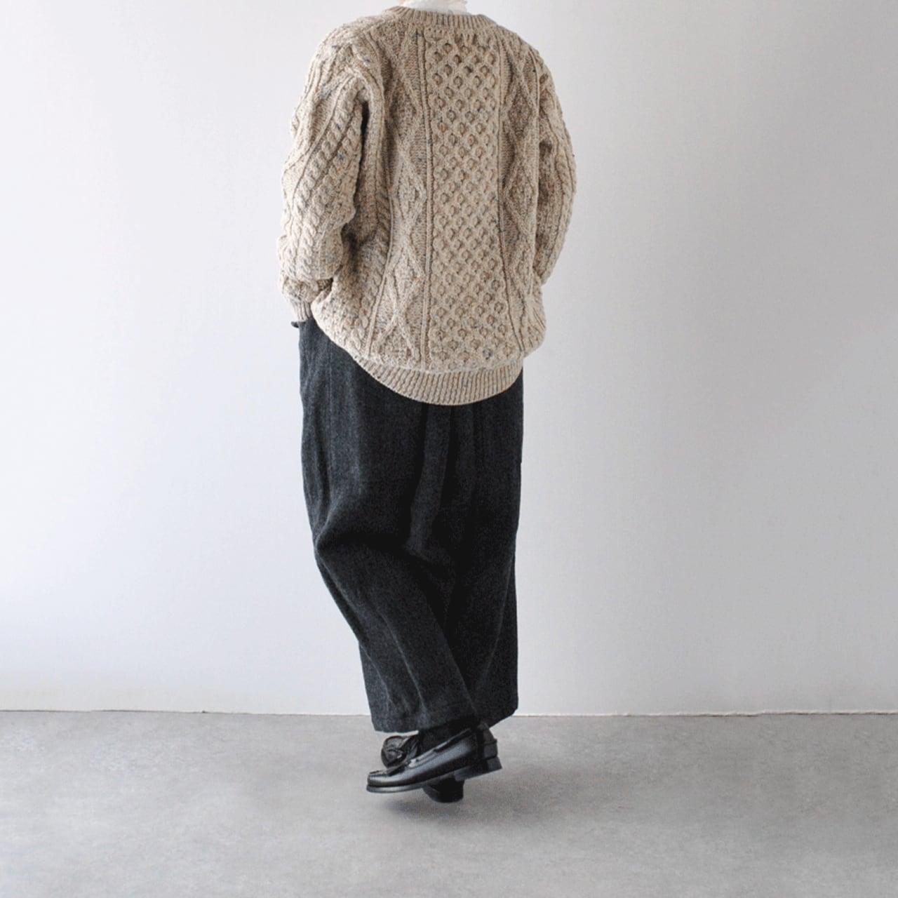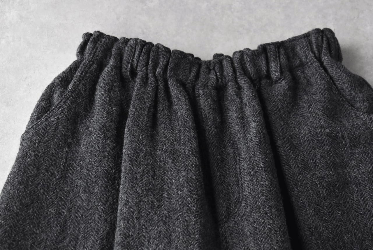 ichi Antiquitésから、ヘリンボン柄に織り上げたウールツィードが雰囲気の良いバギーパンツが届きました。ゆったりぽってりとした優しいシルエットは、見ているだけでほっこり和みますね。これからの季節はたっぷりとしたニットなどと合わせてゆる~いコーディネートで楽しんで頂くのがオススメ。Gジャンやジャケットなどとも相性がいいですよ。ふっくらとした生地感でとても温か。裏地付きなのも安心。ヒモ調節可能なゴムウエスト。ベルトループ有。