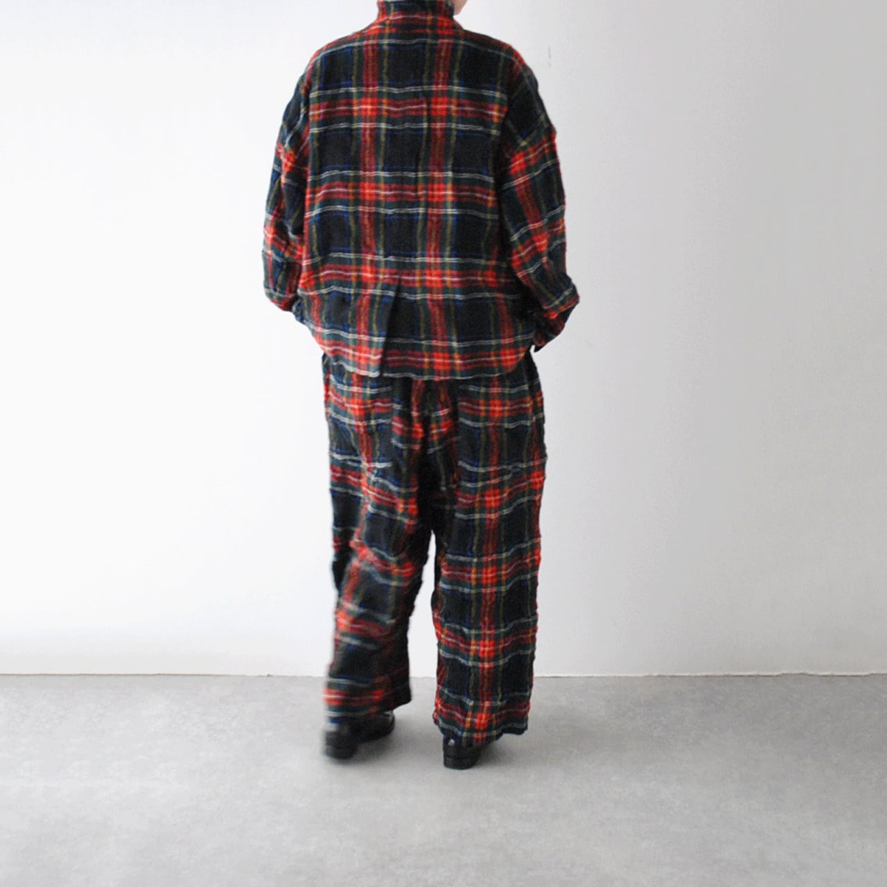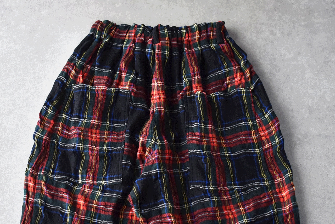 ichi Antiquitésから、タータンチェック柄が印象的なバギーパンツが届きました。ゆったりポッテリとした優しいシルエットは、見ているだけでほっこり和みますね。これからの季節はたっぷりとしたニットなどと合わせてゆる~いコーディネートで楽しんで頂くのがオススメ。Gジャンやジャケットなどとも相性がいいですよ。ウールとコットンの収縮差で生まれるウネのある生地感も温かな表情。同素材のジャケットとセットアップで楽しむのもオススメです。ヒモ調節可能なゴムウエスト。ベルトループ有。