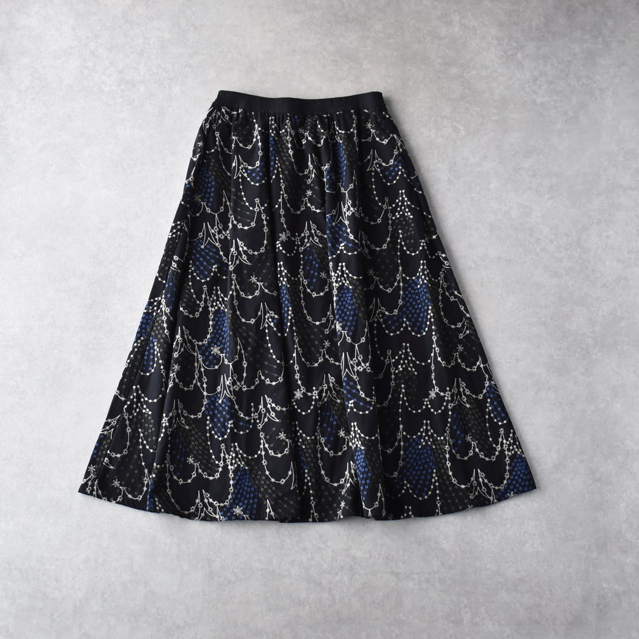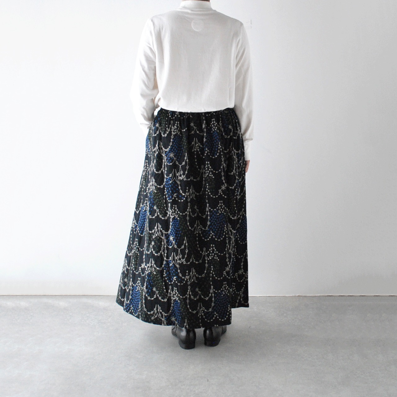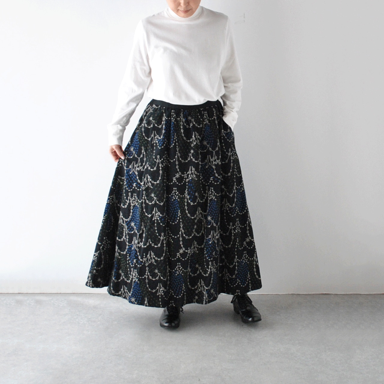 キラキラとした星のシャワーに浮かび上がるツバメが幻想的なmarble SUDの「EMB swallow」シリーズ。起毛感のある温かなコットン素材に総刺繡を施した華やかな印象で楽しんで頂けます。フレアスカートはウエストにギャザーを寄せたふんわりシルエットで、シンプルなトップスと合わせるだけでとても絵になる一枚ですよ。長めの丈感が大人っぽく、動く度に緩やかに揺れる姿も素敵。後ろウエストのみゴム仕様なので、ウエストインのスタイルもオススメ。裏地付き。