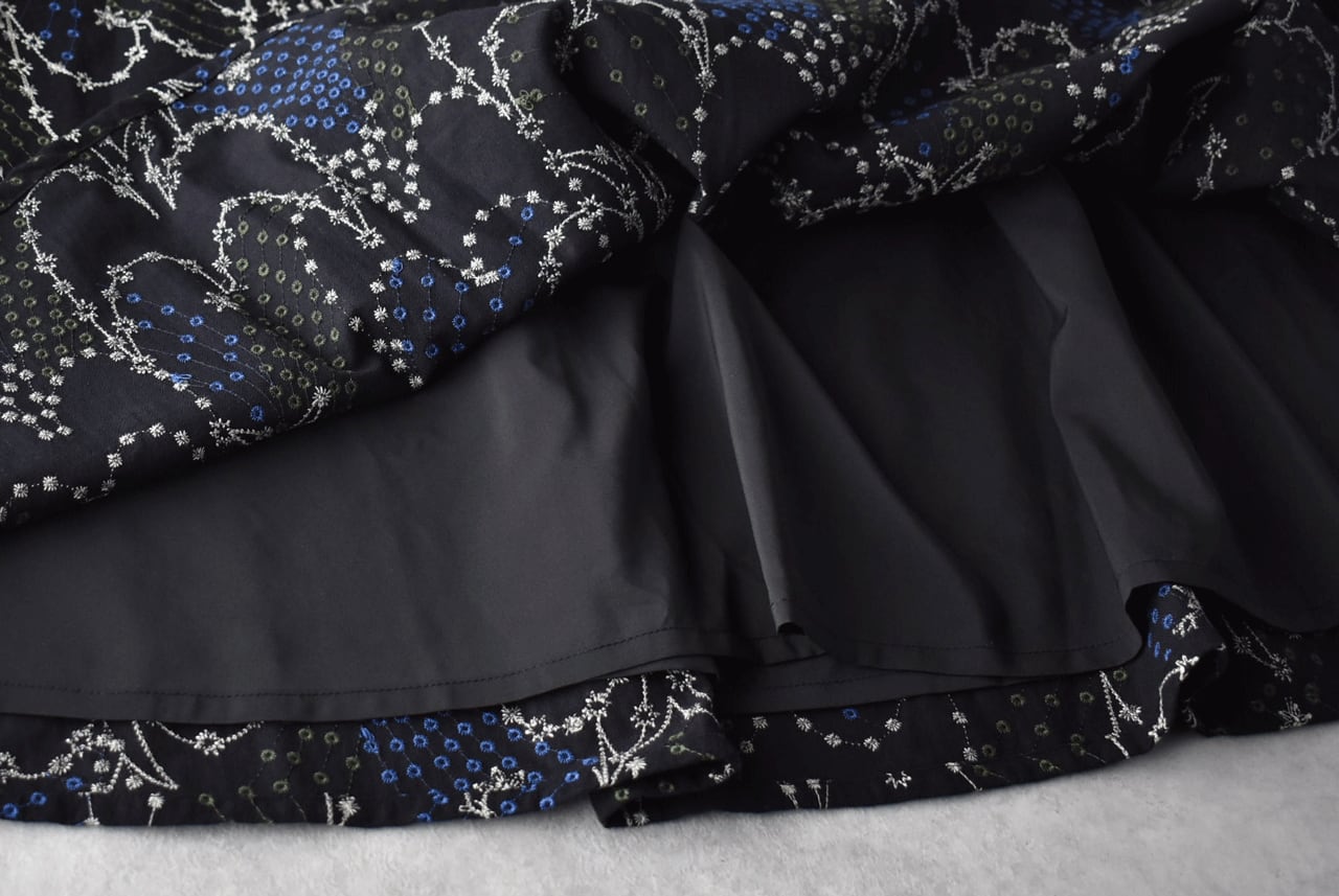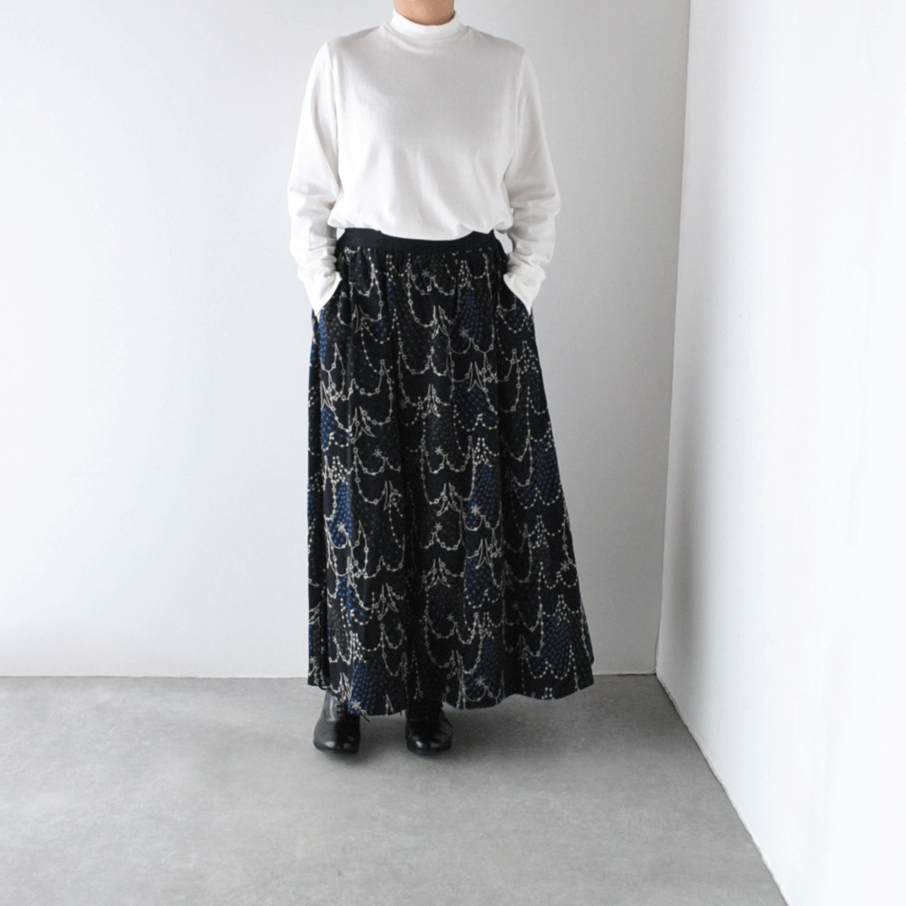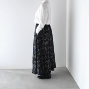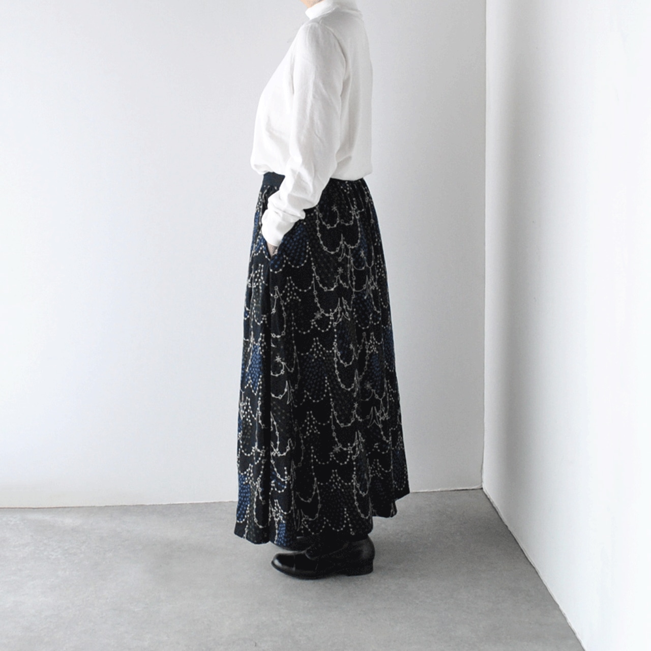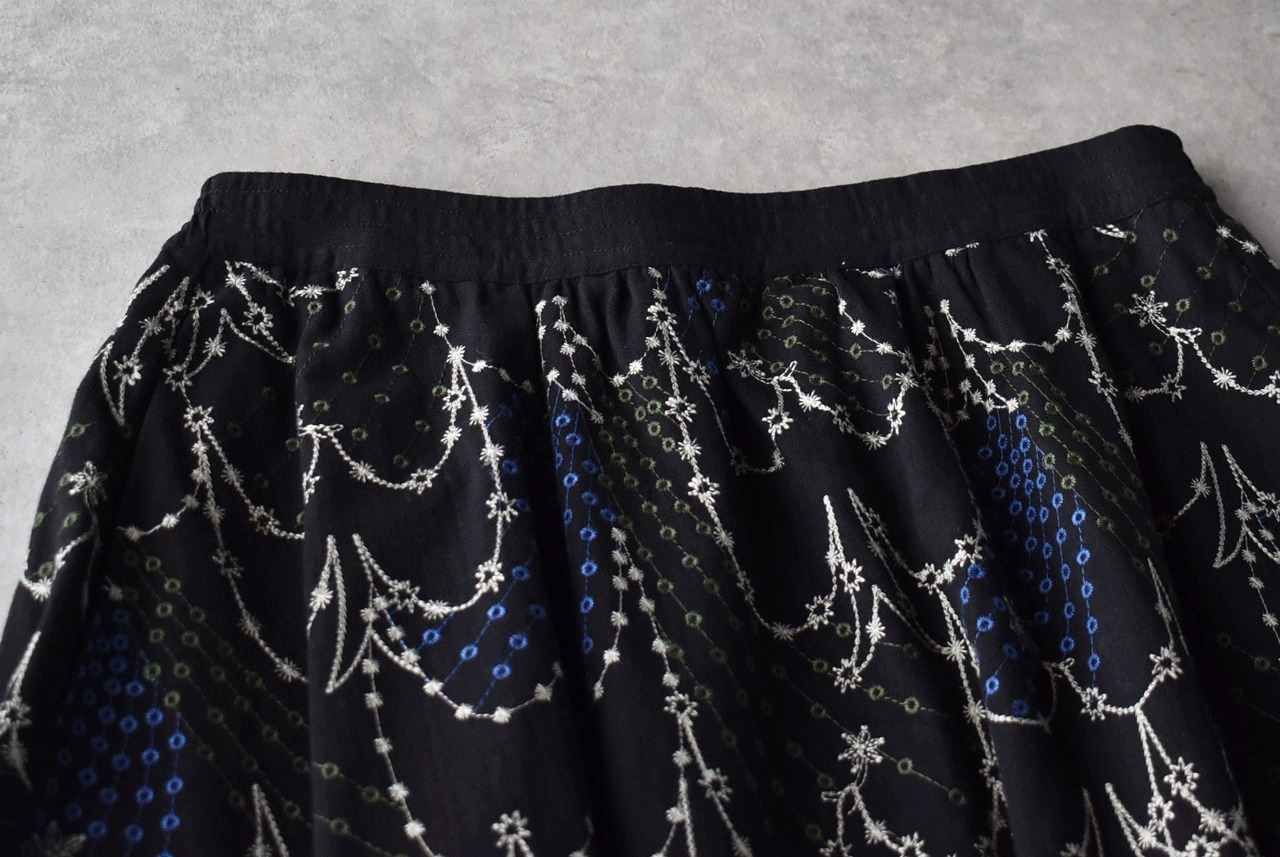 キラキラとした星のシャワーに浮かび上がるツバメが幻想的なmarble SUDの「EMB swallow」シリーズ。起毛感のある温かなコットン素材に総刺繡を施した華やかな印象で楽しんで頂けます。フレアスカートはウエストにギャザーを寄せたふんわりシルエットで、シンプルなトップスと合わせるだけでとても絵になる一枚ですよ。長めの丈感が大人っぽく、動く度に緩やかに揺れる姿も素敵。後ろウエストのみゴム仕様なので、ウエストインのスタイルもオススメ。裏地付き。