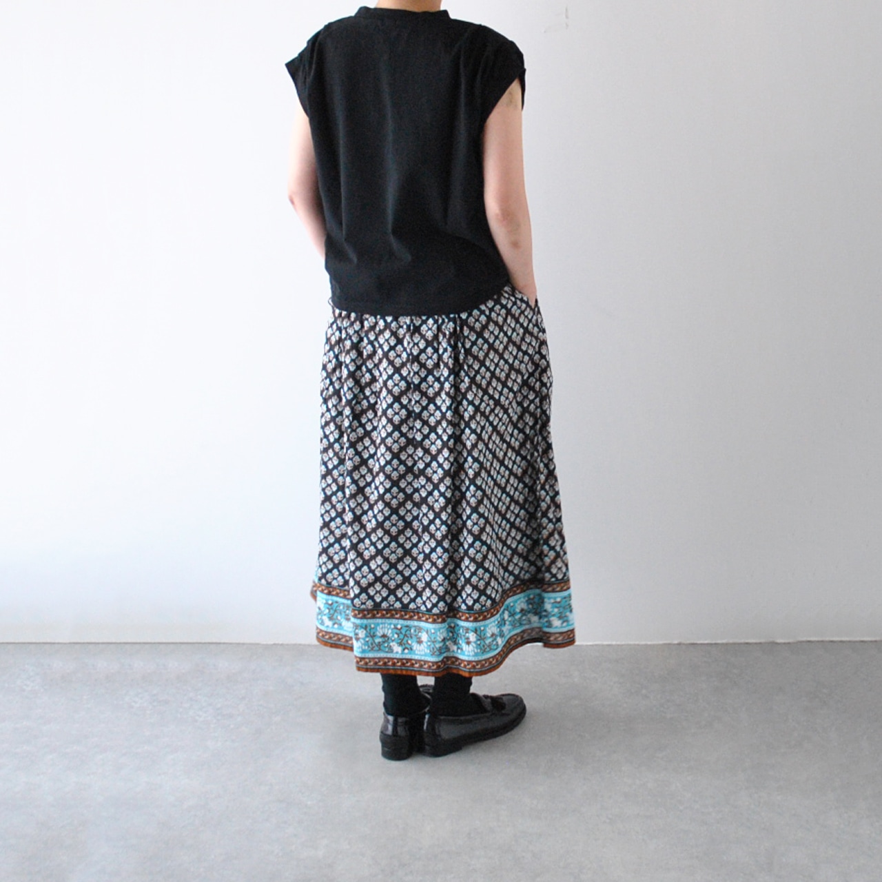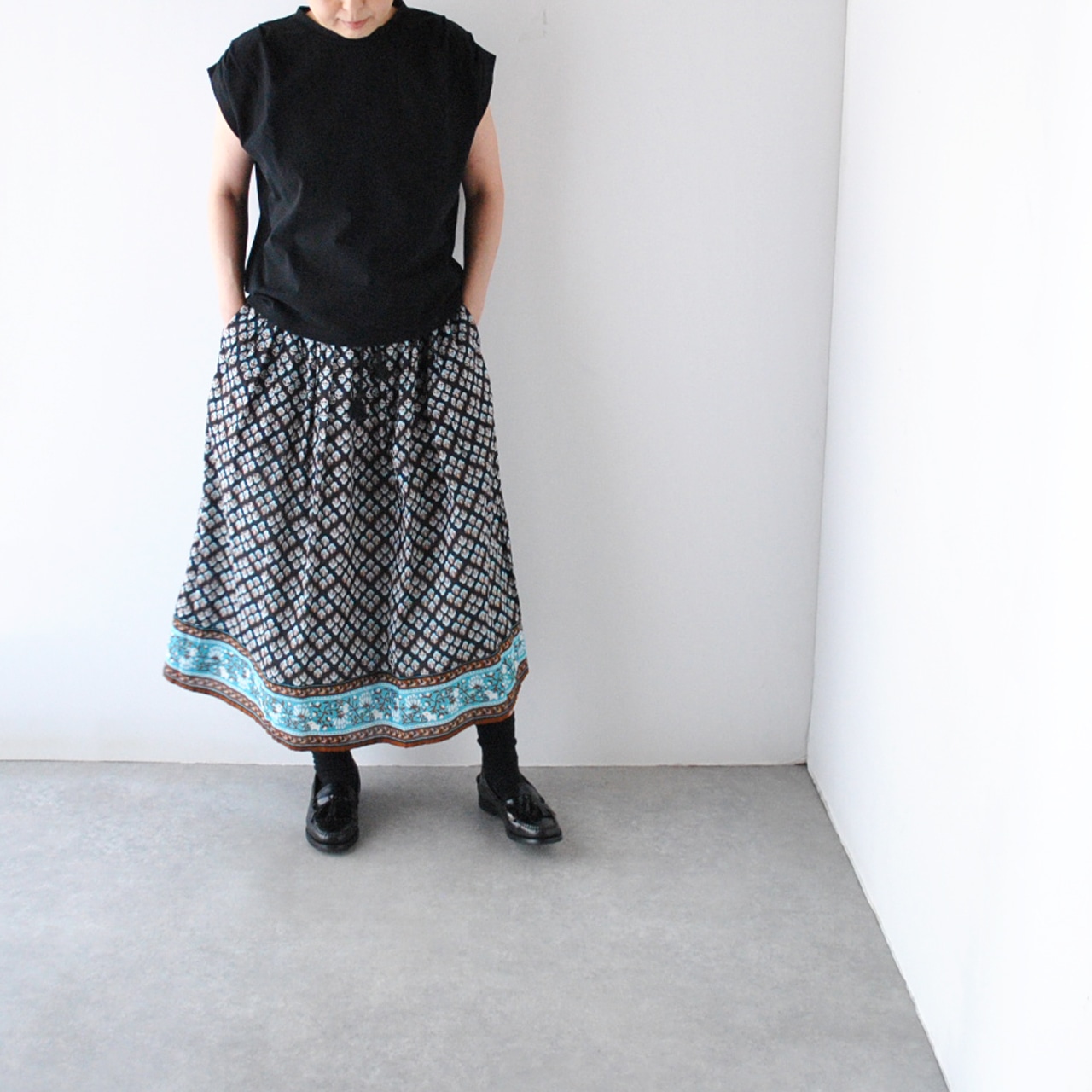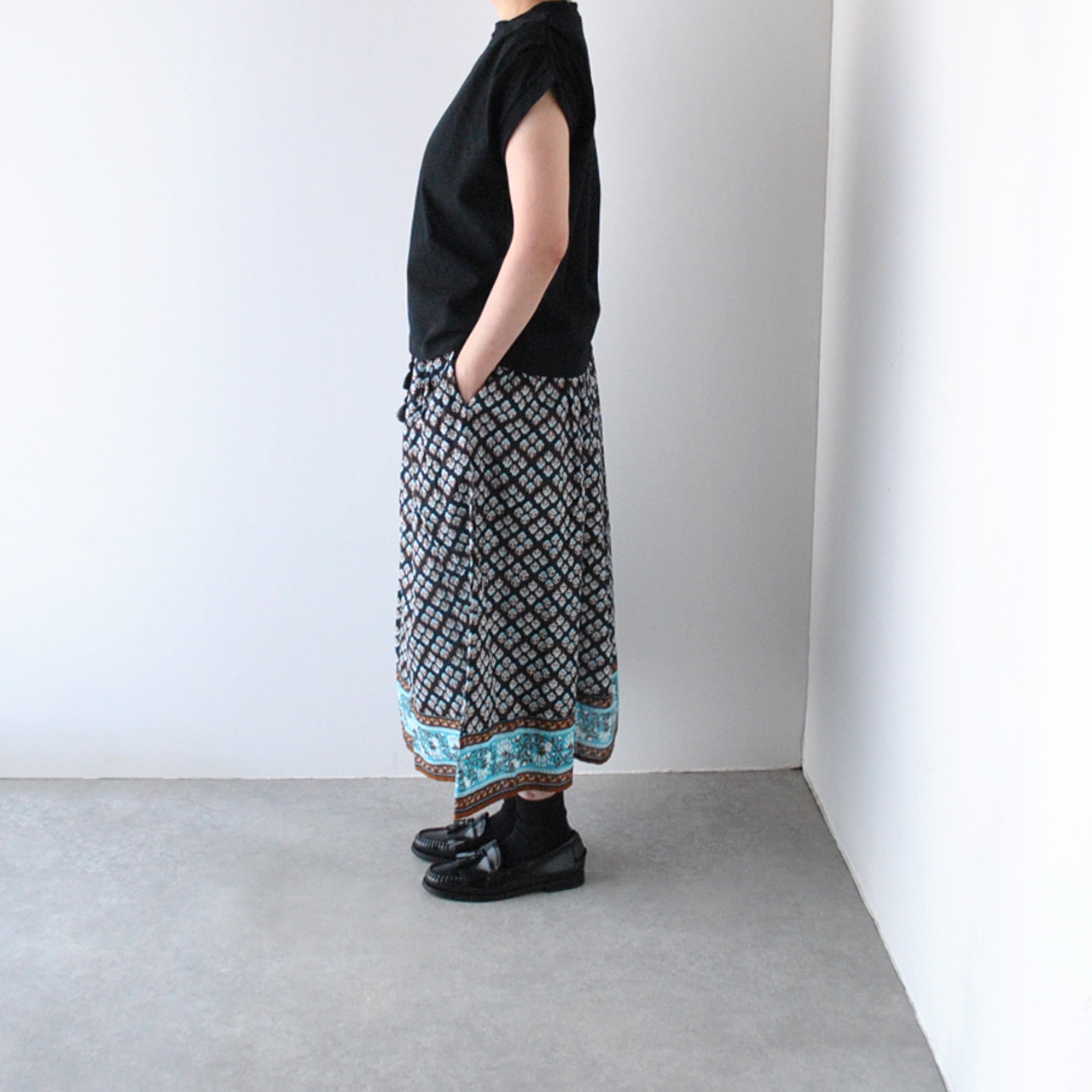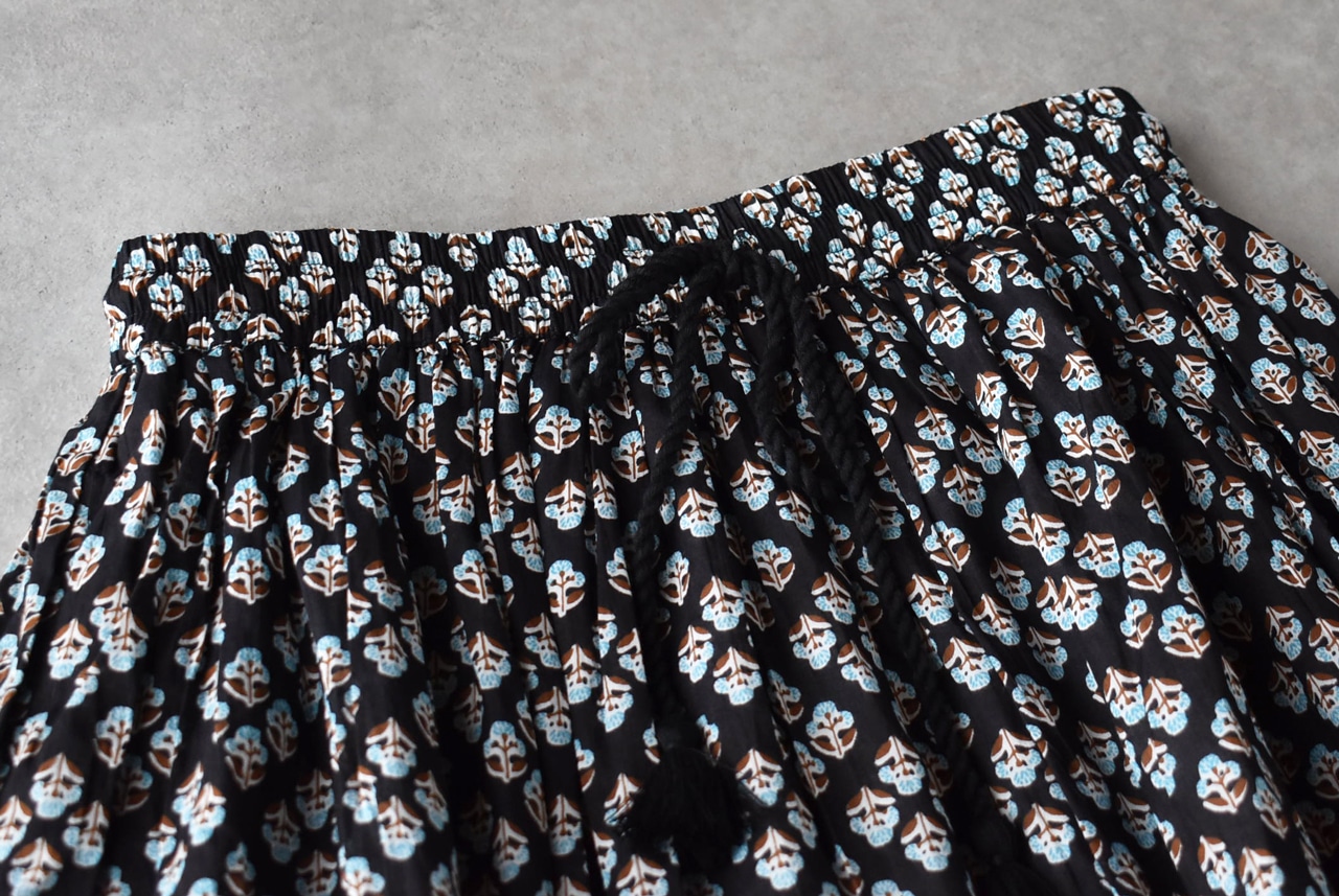 marble SUDから、涼やかなインド綿で仕立てた「choti kutta」シリーズのギャザースカートが届きました。ウエストにギャザーを寄せたふんわりシルエットと軽い着心地が魅力的な一枚。東欧の民族衣装を思わせるレトロな小花柄は、シンプルなトップスと合わせるだけで、夏のコーディネートを上品に仕上げてくれますよ。裏地付きなのも安心感がありますね。ヒンディー語で「小さな犬」を意味する名の通り、裾の柄切替部分にマーブルシュッドのマスコット犬「まめちゃん」がひっそりと描かれています。ヒモ調節可能なゴムウエスト。