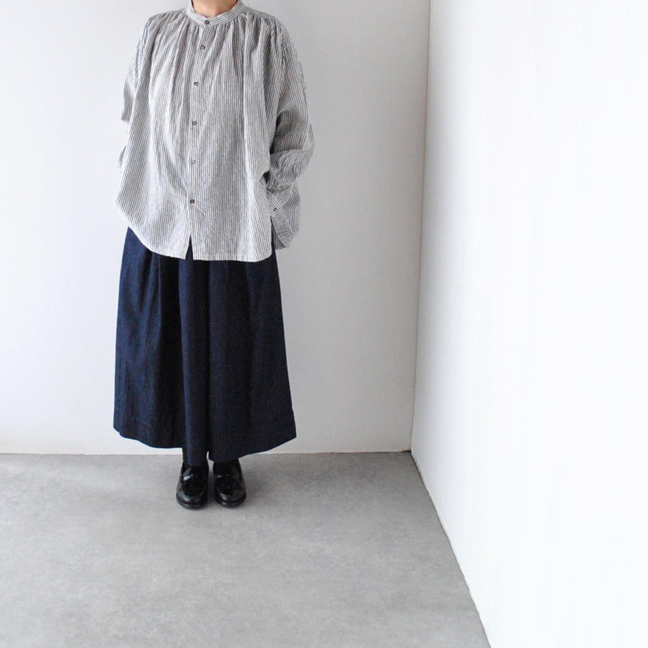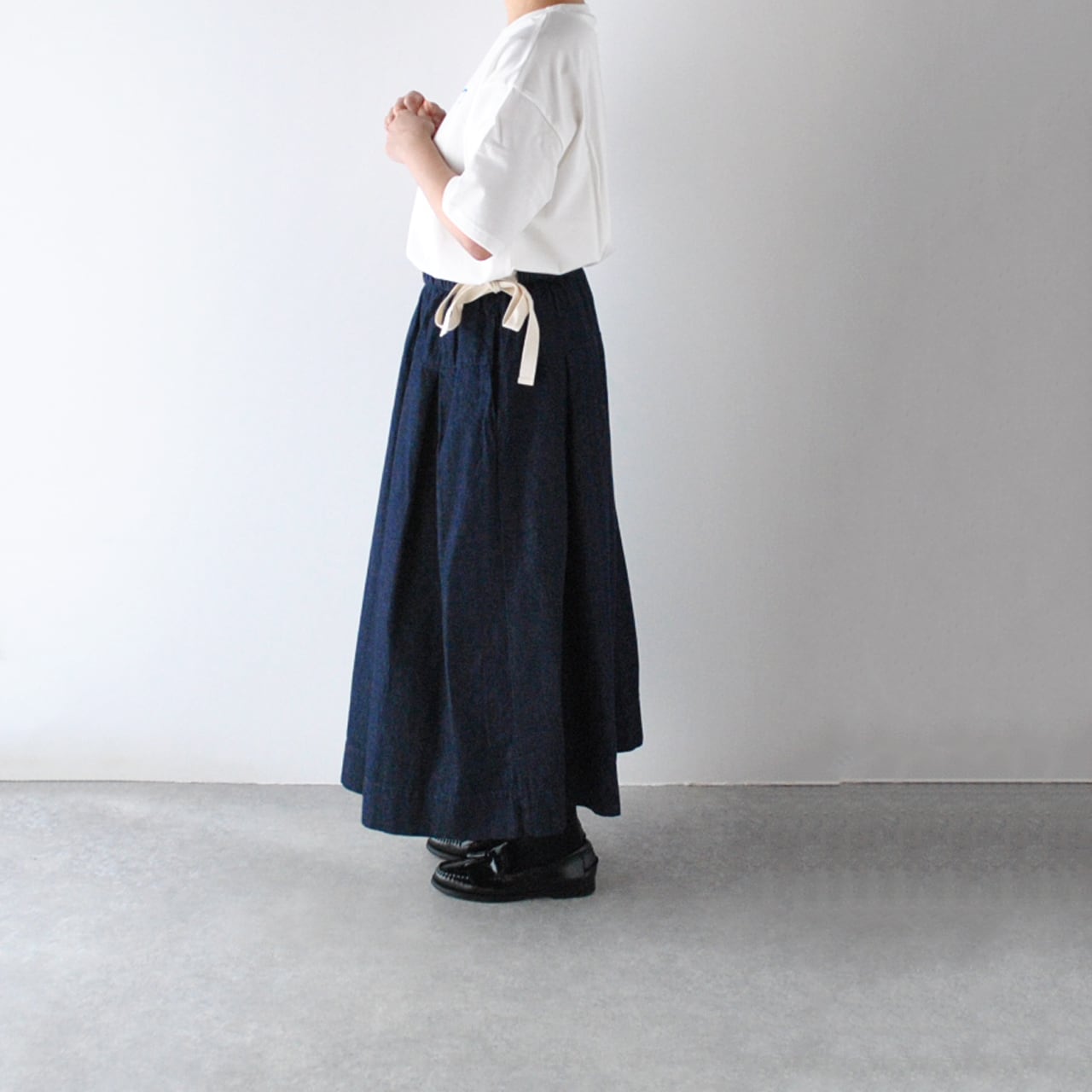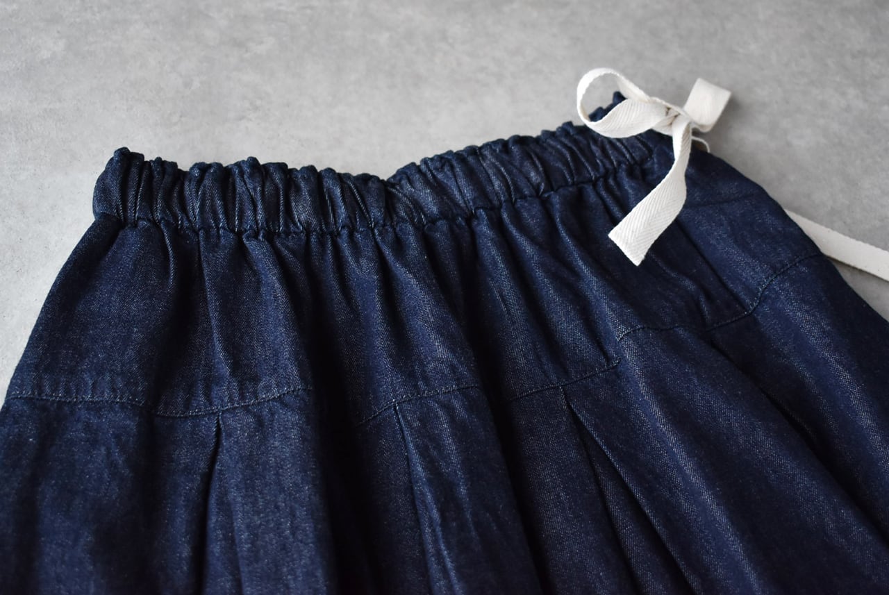 sasanqua by treesから、6オンスのカツラギデニムで仕立てた、軽い履き心地が嬉しいタックスカートが届きました。しっかりとデニム感がありながら、ふっくら柔らかくデニム特有の堅さや重さがないのでとっても快適ですよ。程よいボリューム、ゆったりとしたドレープ感のある美しいシルエットで、動く度に緩やかに揺れる姿が本当に綺麗。ブラウス、Tシャツ、ニットなどなど、季節のトップスと合わせて一年を通して大活躍間違いなしの一枚です。サイドリボンで調節可能なゴムウエスト。