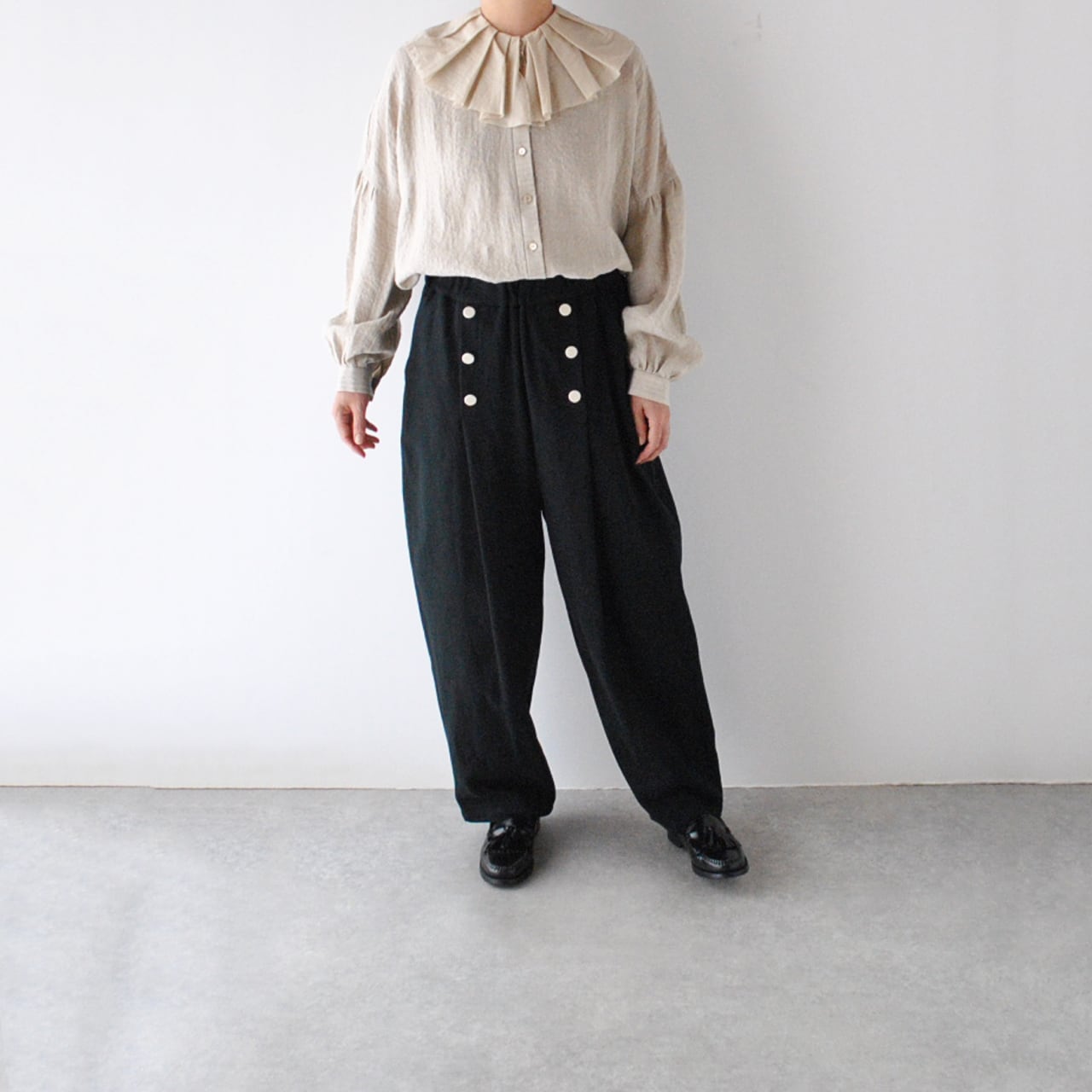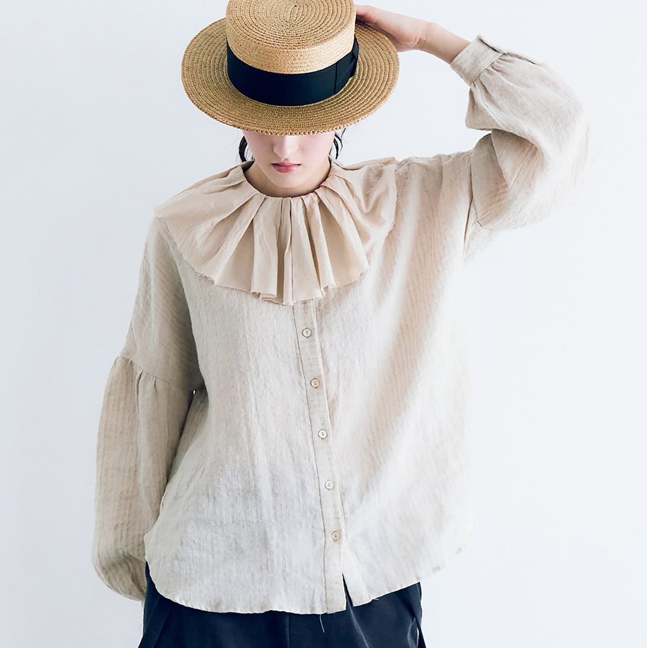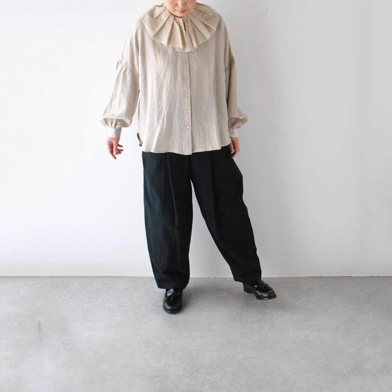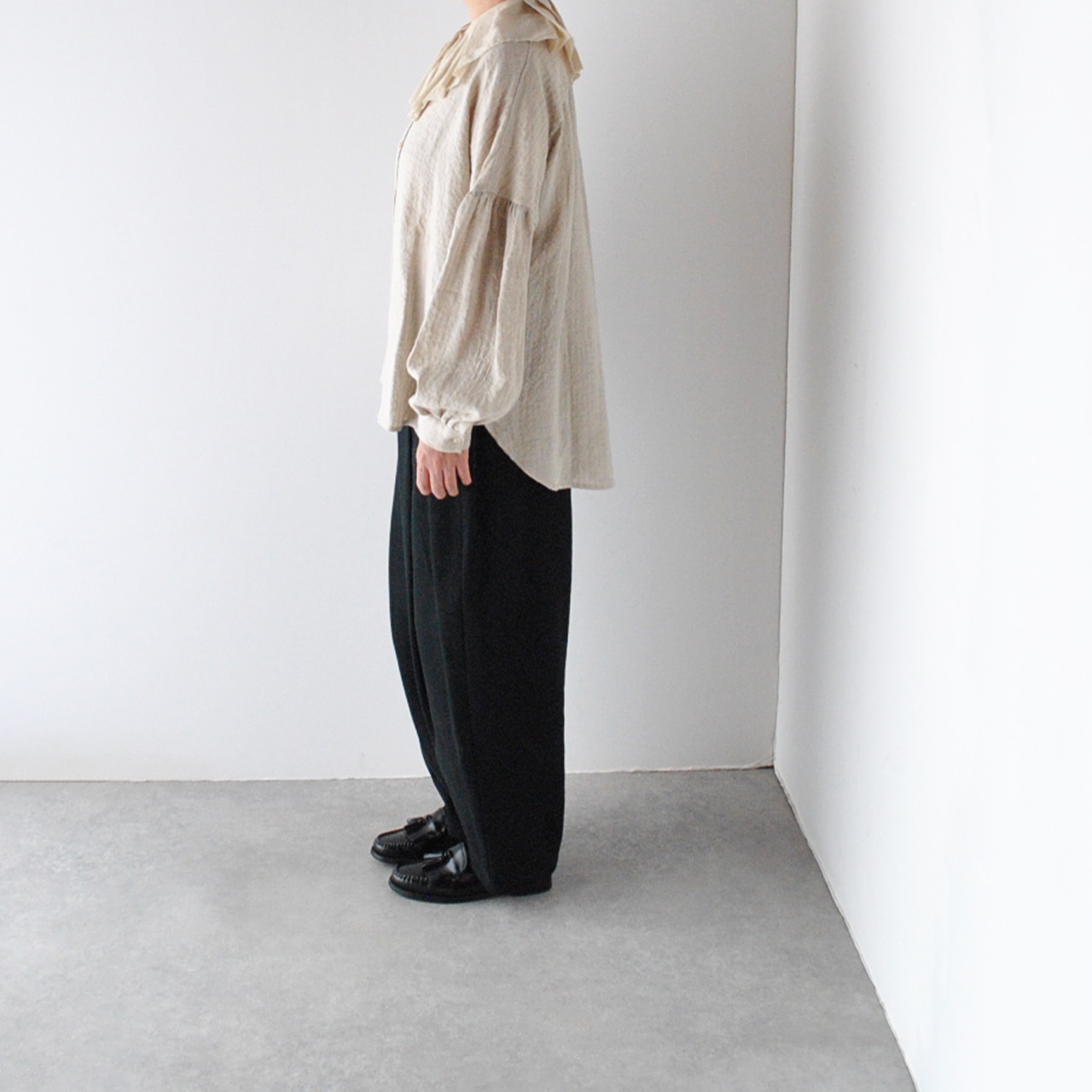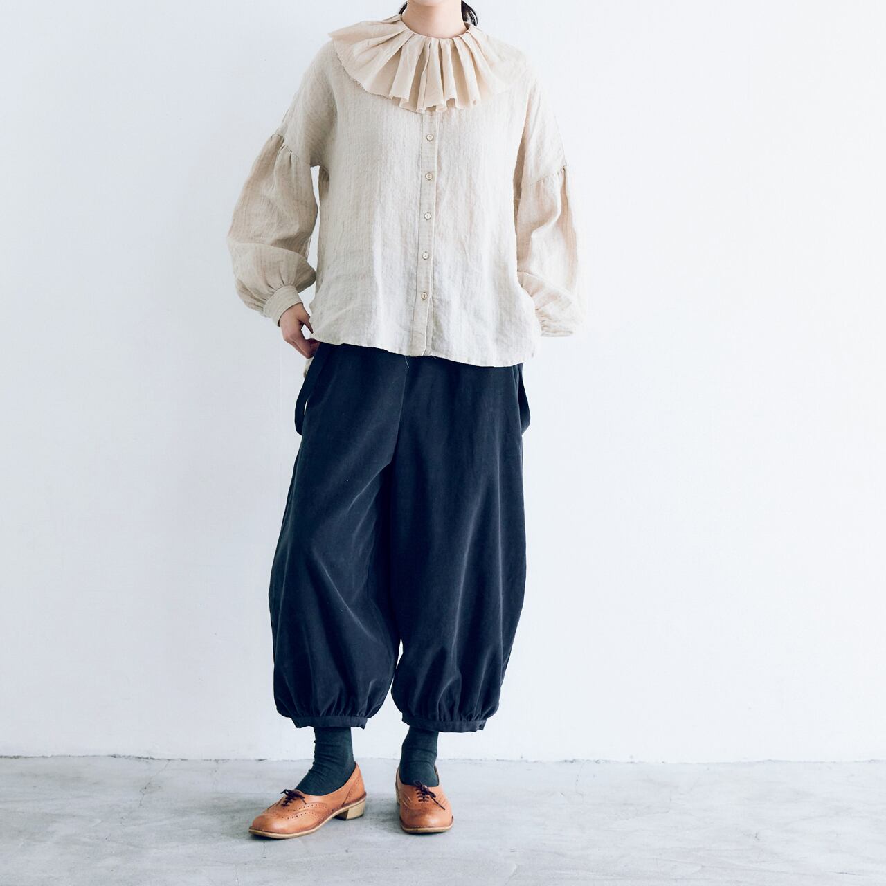 MAGALIからランダムにタックを寄せた切りっぱなしのフリルが愛嬌たっぷりのリネンブラウスが届きました。秋のオシャレが楽しくなる一枚ですね。使用しているのは一見無地に見えますがポコポコとしたウネのあるストライプの地模様が優しい表情のリネン。くたっとした風合いとドライな肌触りが心地よいです。程よくゆとりのある着心地ですが、スッキリとしたシルエットで着て頂けますよ。寒くなればフリルの襟をアウターから覗かせるコーディネートも楽しんで下さいね。