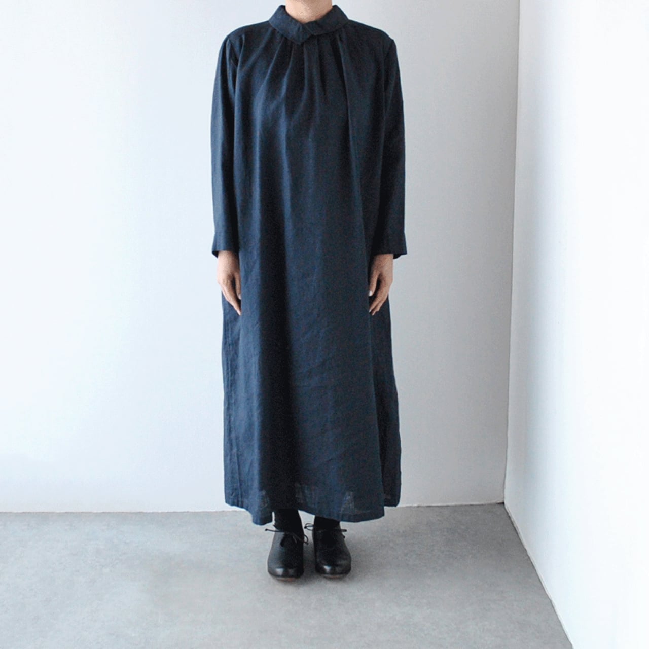 重なった小さな襟が印象的なfog linen workのシエナワンピース。シンプルな中にもどこか愛らしさを感じるフェミニンな一枚です。8分の袖丈がとっても軽やかで、少し袖をまくればまだ暑い今の時期から着て頂けますよ。シックなアルドワーズ(ネイビー系)もとても素敵です。