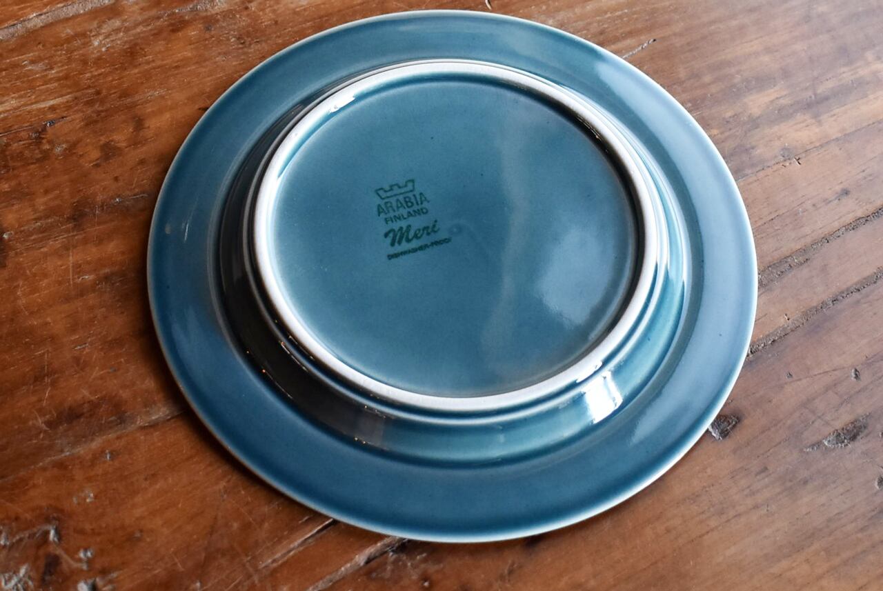 フィンランドARABIA社で1976~79年にかけて生産されたUlla ProcopeデザインのMeriシリーズです。絵付けはハンドペイントになります。フィンランドの海を感じさせる深いブルーがシックなデザインです。細かなカトラリー傷がありますが全体的にツヤ感のある綺麗なコンディションです。