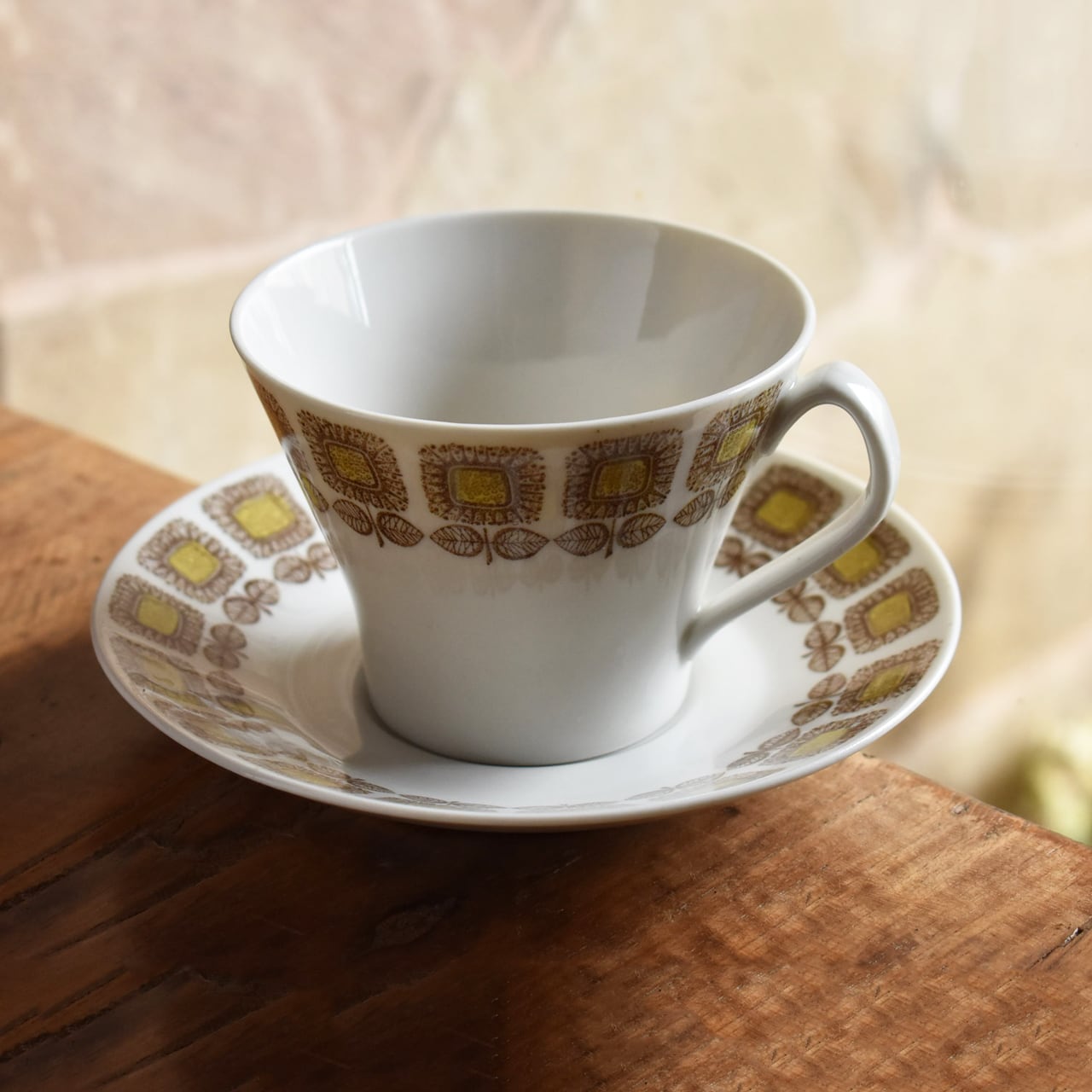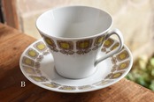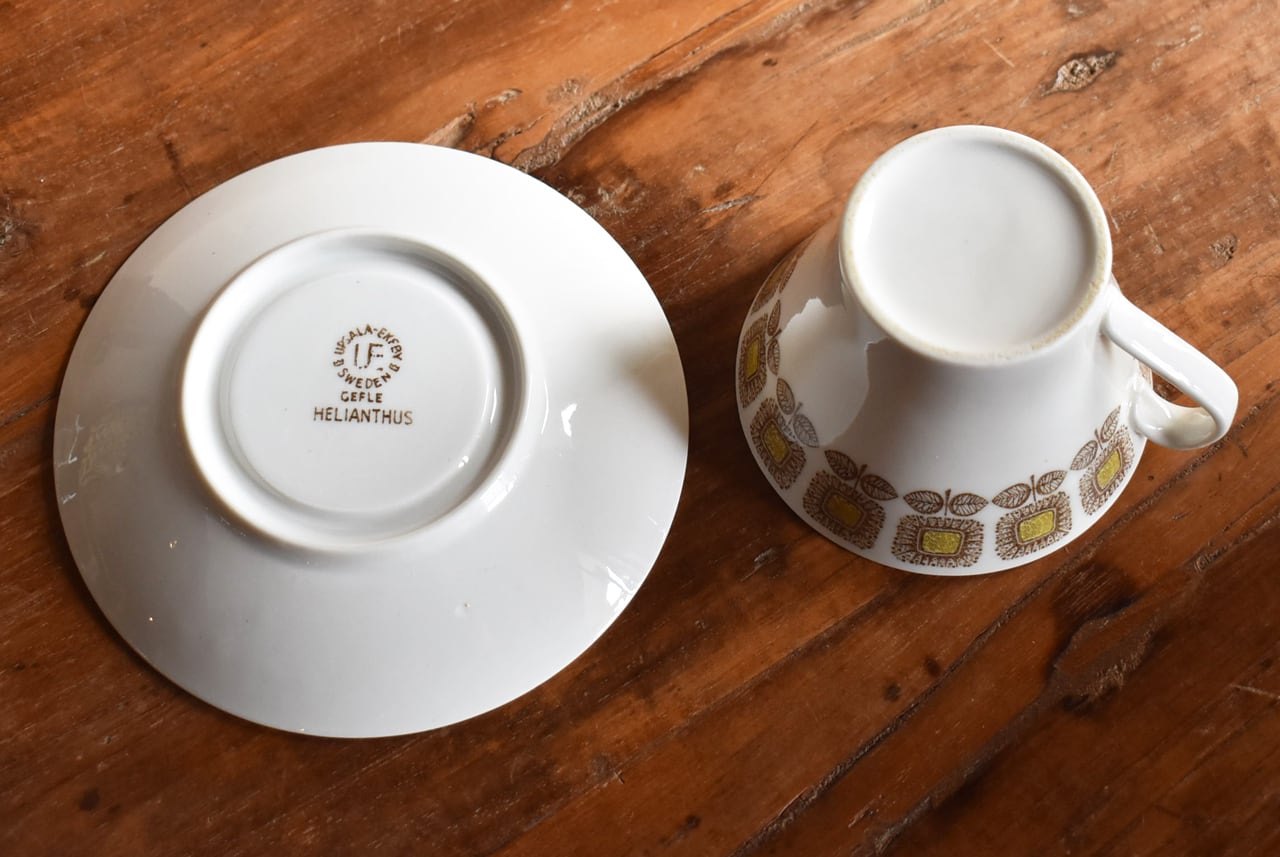 スウェーデンのGefle社で1960年~1970年にかけて生産されたGöran AnderssonデザインのHELIANTHUSシリーズです。四角いひまわりがぐるりと描かれた愛らしいシリーズです。ソーサーに微細なスレ傷を感じる以外は、使用感のないツヤのある非常に良いコンディション。A、Bそれぞれ画像のような、製造時についた黒い小さなインク飛びがございます。