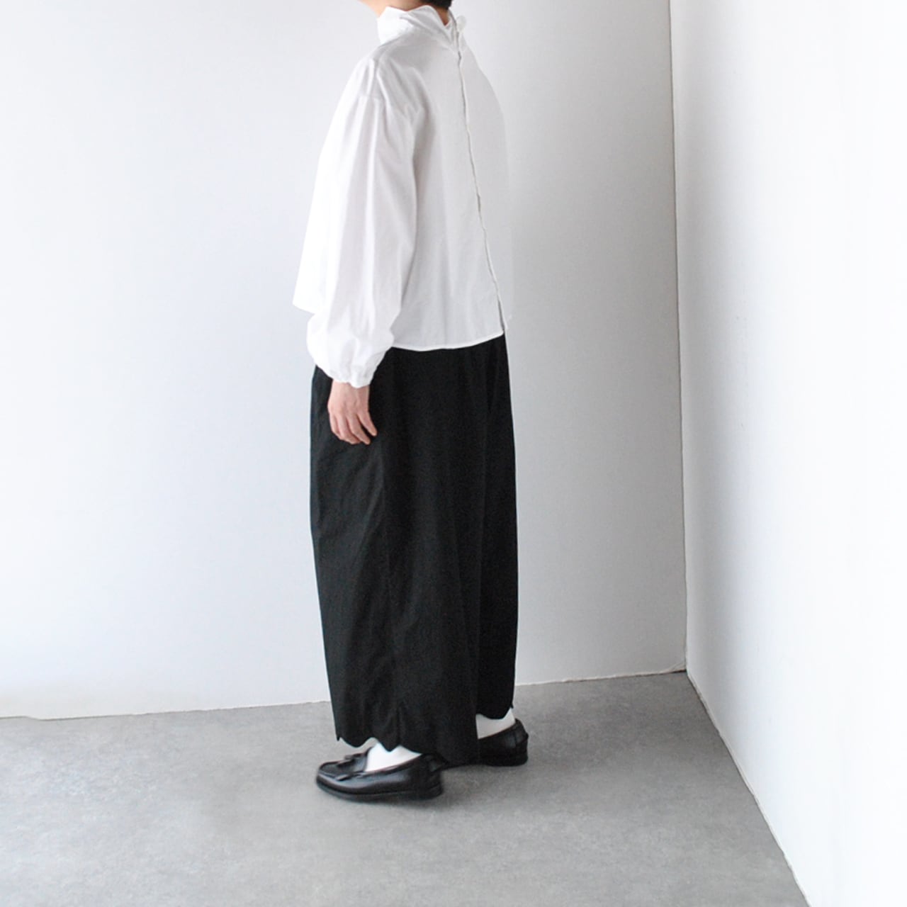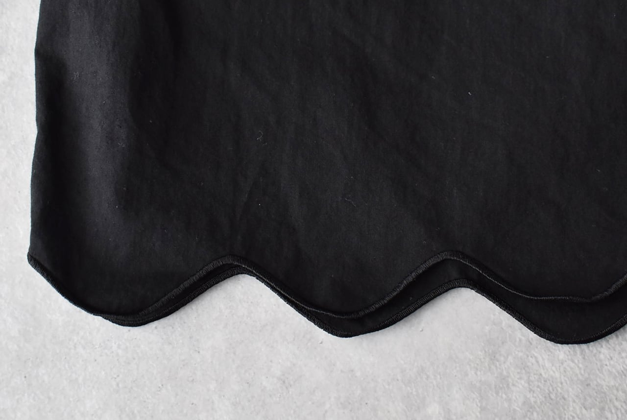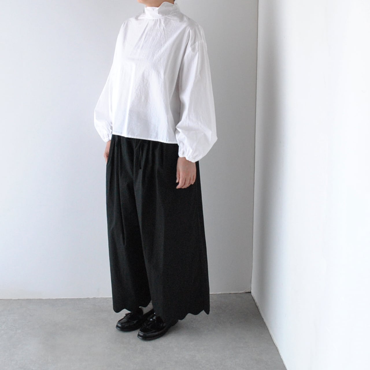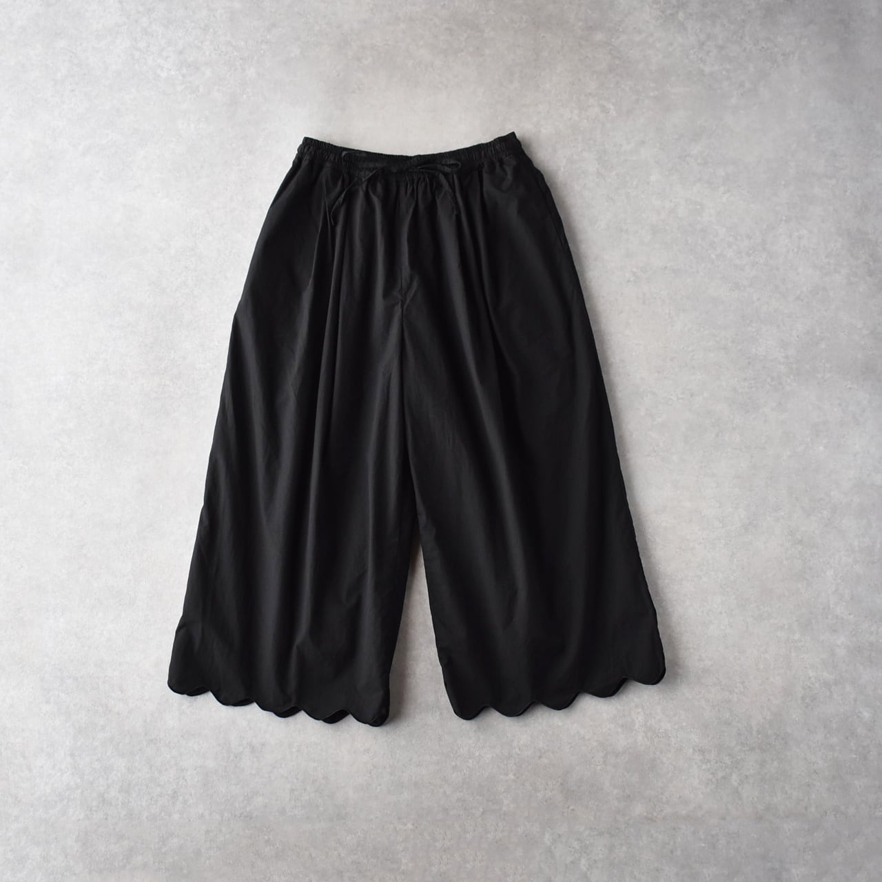ROBE de PEAUから、裾に波型のスカラップ刺繍を施したイージーパンツが届きました。ヨーロッパの素朴な人形が着ていた洋服をイメージしたROBE de PEAUらしい一枚ですね。ハリのあるコットン素材がふっくらとしたフォルムをキープしてくれるので、シンプルなトップスを合わせるだけで一年を通して印象的なコーディネートを楽しんで頂けますよ。裏地付きなのも安心。大人の女性に愛らしく楽しんで欲しいです。ヒモ調節可能なゴムウエスト。