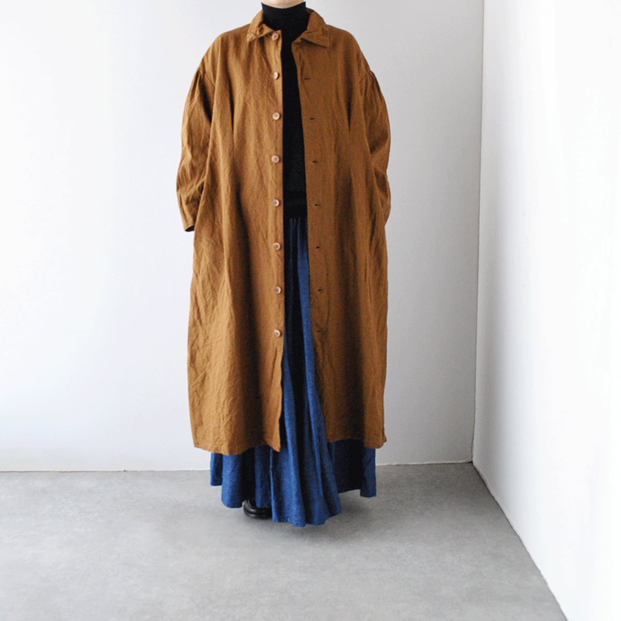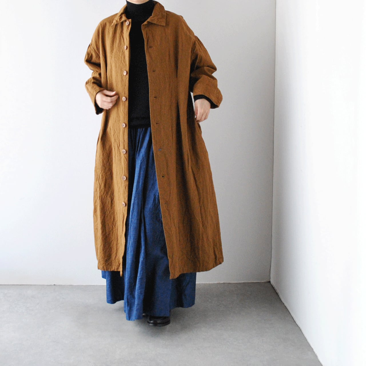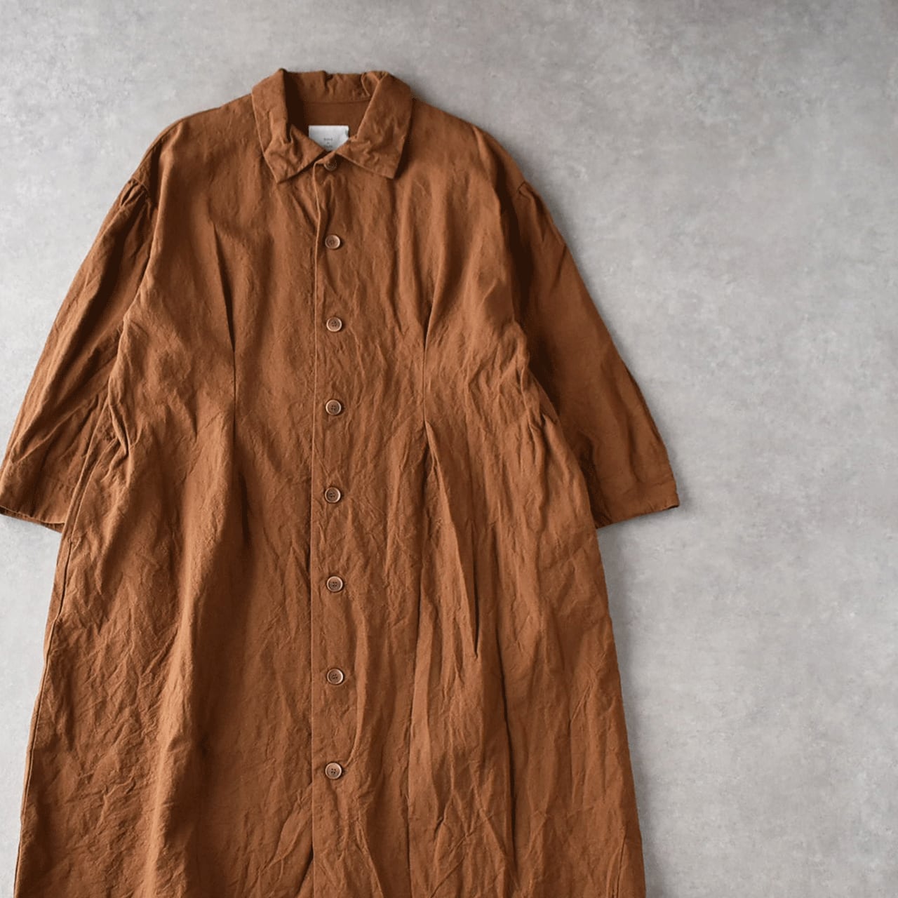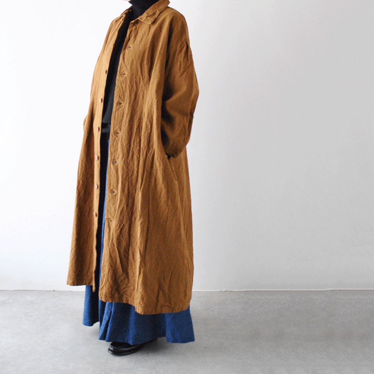 ROBE de PEAUから、秋口から春先まで長いシーズンとっても雰囲気よく楽しめる手頃なコートが届きました。こちらのコート、まず何より生地感がとてもいいんです。ざっくりと織り上げたコットンリネンは、所々にアタリやムラっ気があり、自然なシワ感と相まって本当に風合い豊か。しっかりと厚みがあるのにしなやかでとっても軽く、こっくりとしたアーモンド色も良い色味ですよ。デザインは前を開けて着ると程よくオーバーサイズ感のあるカッコいい雰囲気。前を留めれば、タックを入れて脇下を少しシェイプしているので野暮ったさのないスッキリと美しいフォルムになるんです。少し短めの袖丈も絶妙に可愛いです。下にニットを着てもゆったりと着れるので、本当に使い勝手の良いオススメの一枚です。