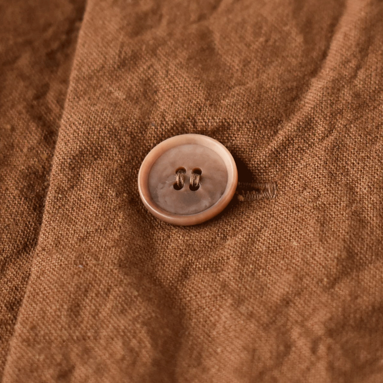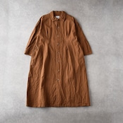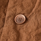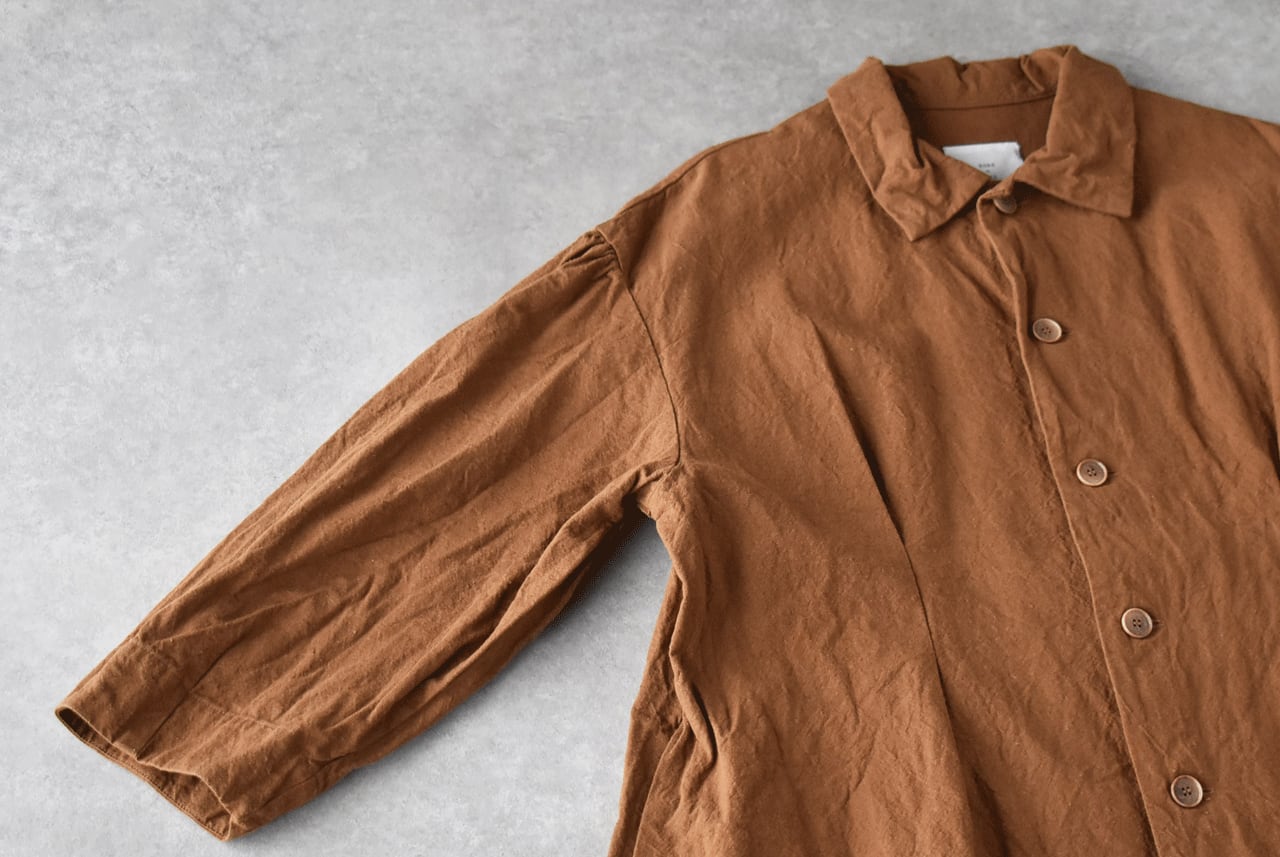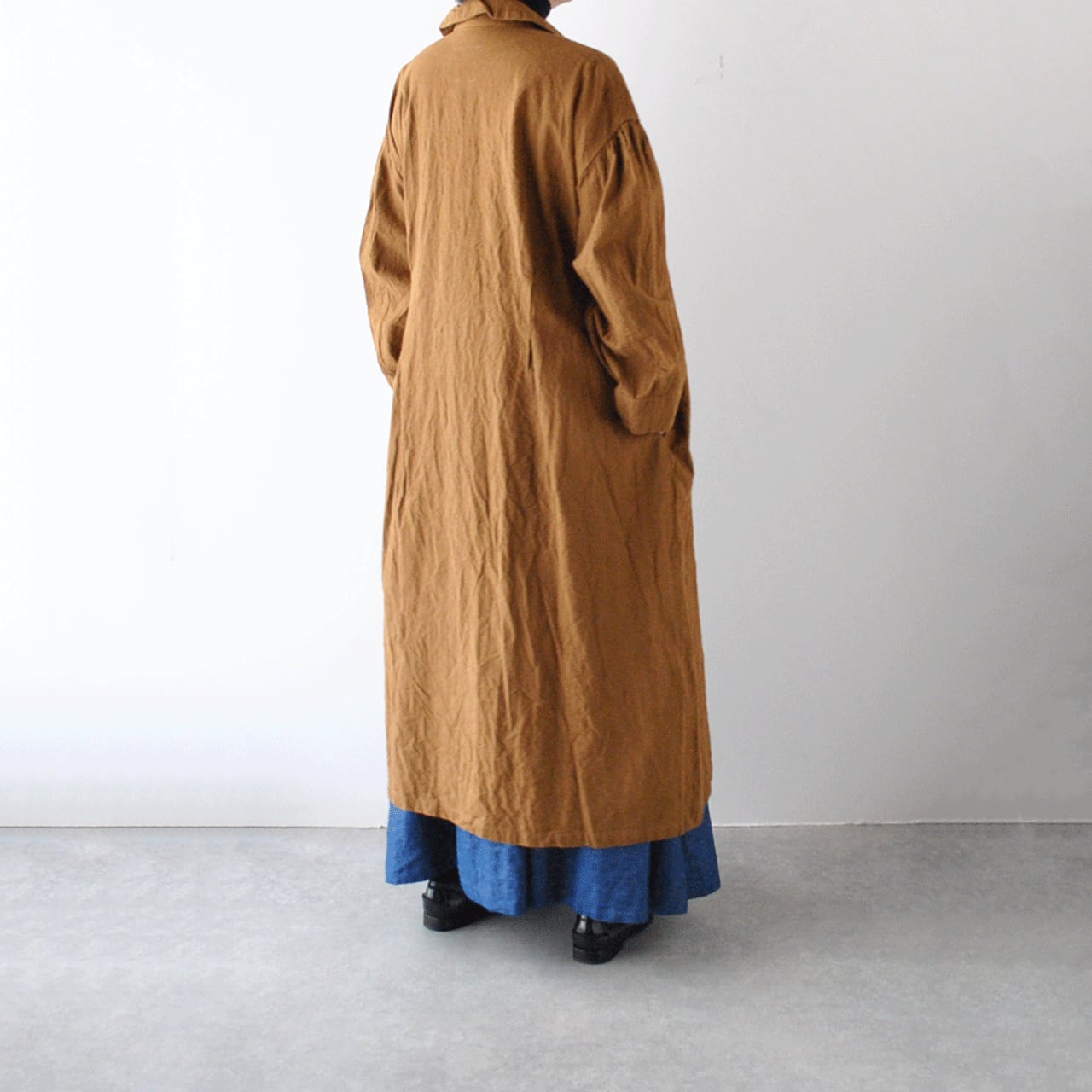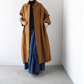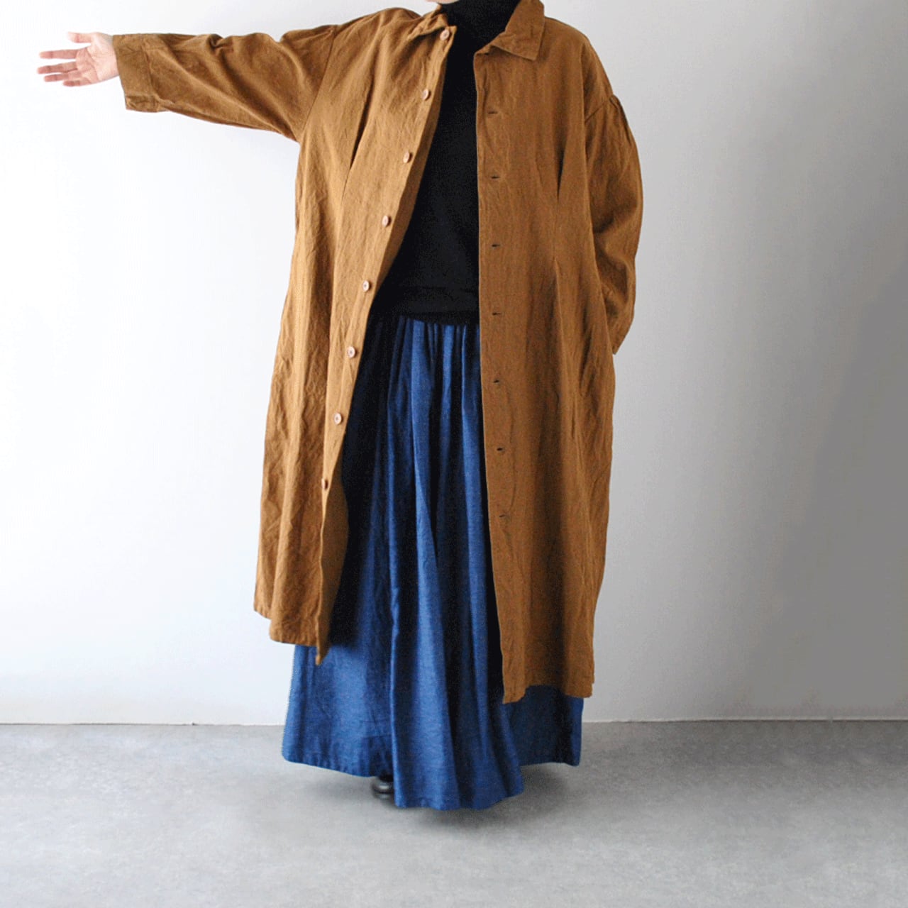 ROBE de PEAUから、秋口から春先まで長いシーズンとっても雰囲気よく楽しめる手頃なコートが届きました。こちらのコート、まず何より生地感がとてもいいんです。ざっくりと織り上げたコットンリネンは、所々にアタリやムラっ気があり、自然なシワ感と相まって本当に風合い豊か。しっかりと厚みがあるのにしなやかでとっても軽く、こっくりとしたアーモンド色も良い色味ですよ。デザインは前を開けて着ると程よくオーバーサイズ感のあるカッコいい雰囲気。前を留めれば、タックを入れて脇下を少しシェイプしているので野暮ったさのないスッキリと美しいフォルムになるんです。少し短めの袖丈も絶妙に可愛いです。下にニットを着てもゆったりと着れるので、本当に使い勝手の良いオススメの一枚です。