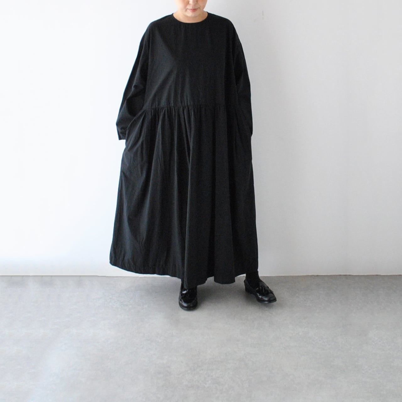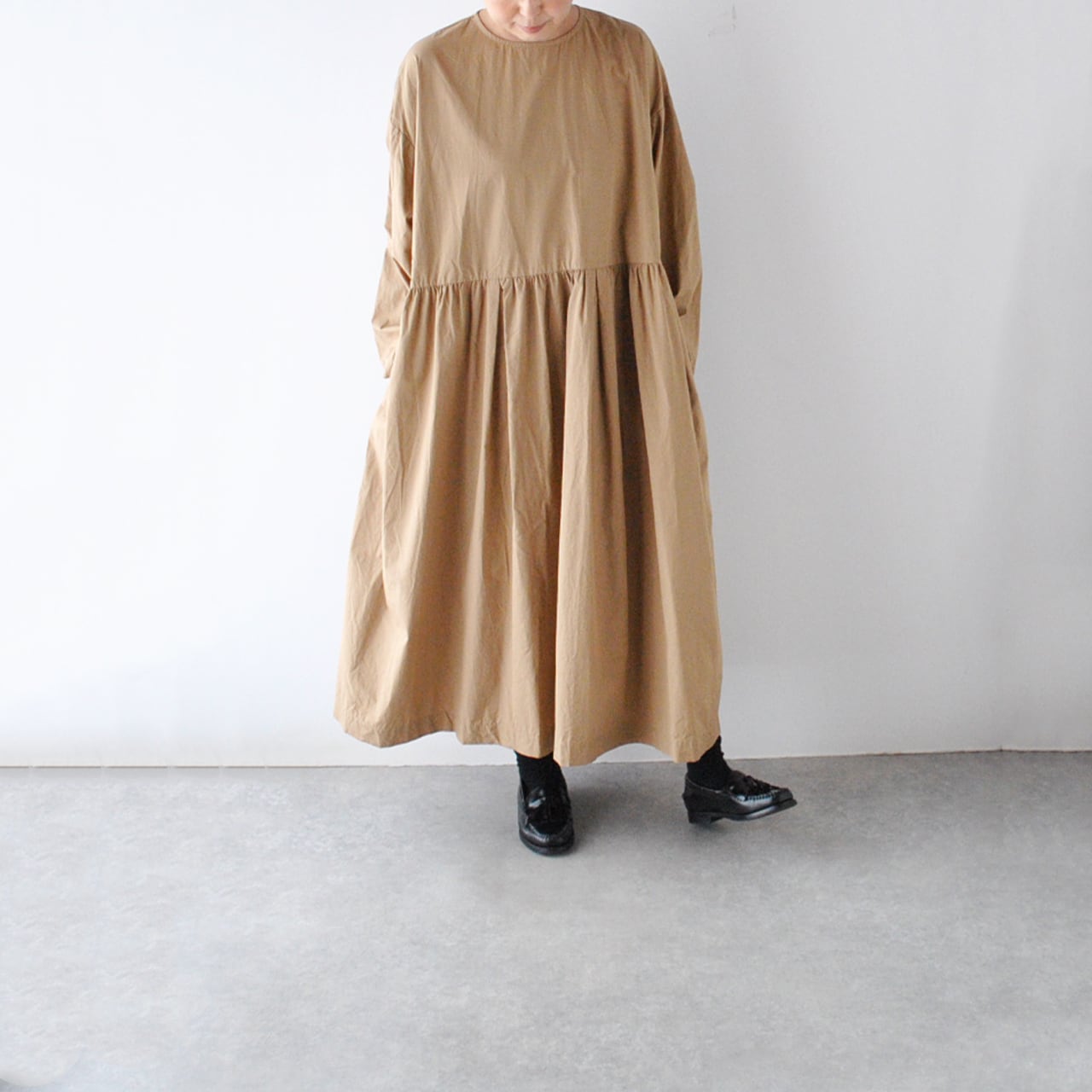 落ち着きのあるマットな質感のタイプライターコットンをたっぷりと使用した、一枚でとっても雰囲気よく着ていただけるGauze# のワンピース。ウエストの切替にたっぷりとギャザーを寄せた、ふんわり広がるシルエットが美しく、しっかり長めの丈感も本当に格好いいですよ。肌寒くなればインナーにタートルネックを合わせたコーディネートもオススメ。肩幅、身幅を広くとった、ゆったりとした着心地もとても快適です。無駄な装飾のないシンプルな美しさが際立つ一枚です。
