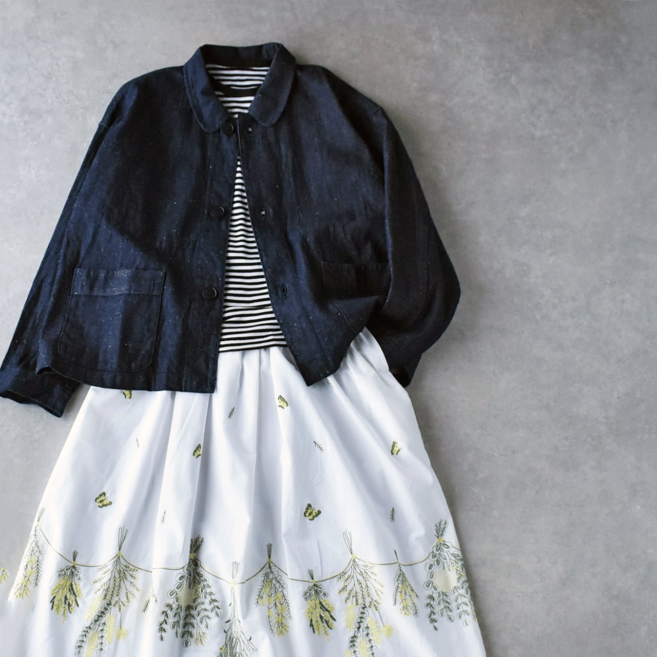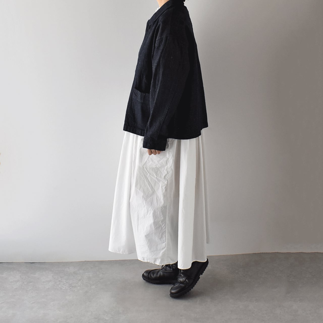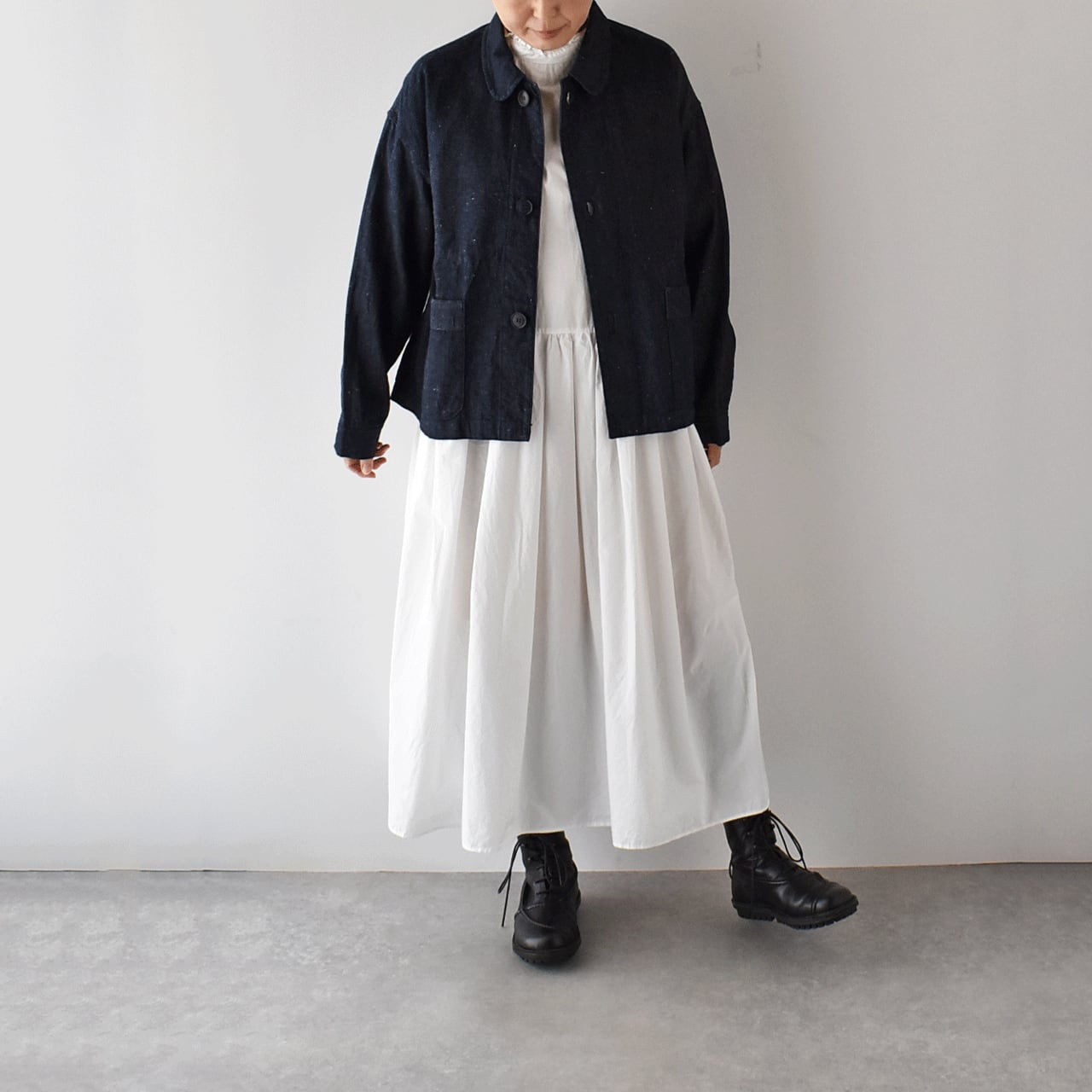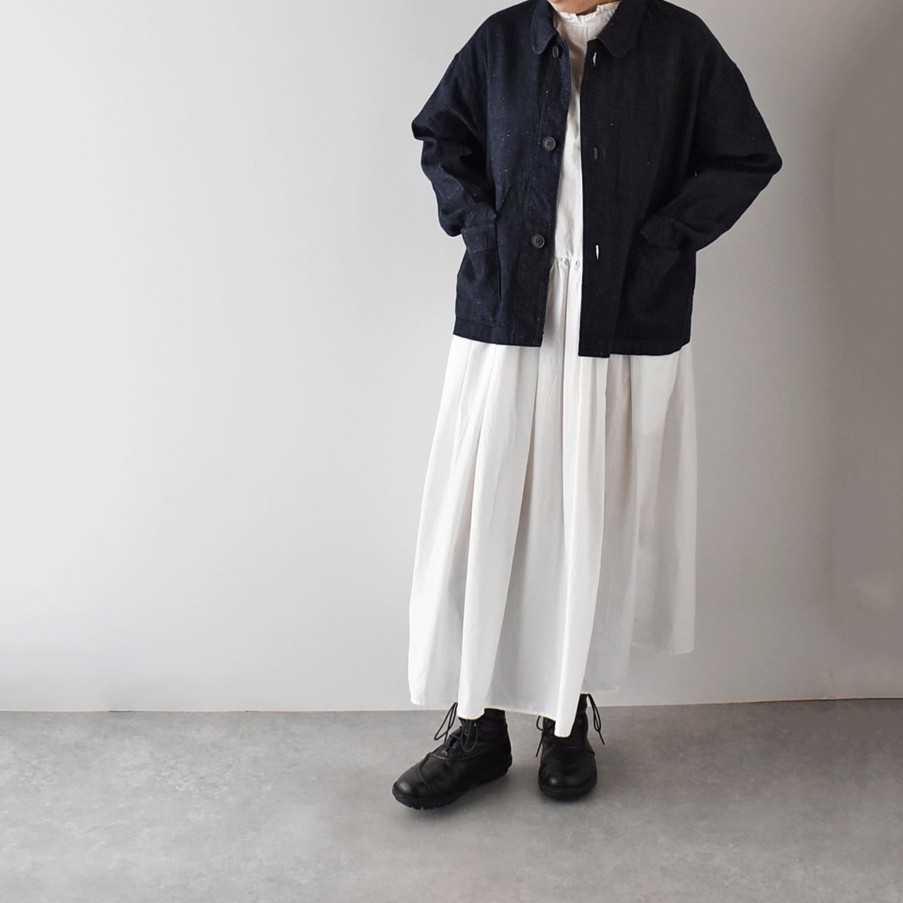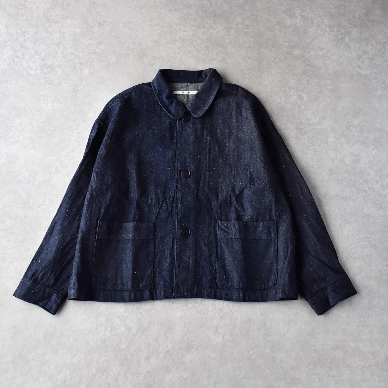 LABORATORYから、コットンリネンデニムで仕立てたシンプルな丸襟ジャケットが届きました。フランスのワークウェアの様にサッと羽織るだけで、洗練された着こなしが楽しめる一枚です。ワンピースに合わせてもとっても可愛いですよ。ネップが効いたコットンリネンデニムは風合い豊かで、程よいハリがありながらしなやかな生地感。着心地もとっても軽いので「Gジャンは重くて堅くて苦手」という方にもオススメです。