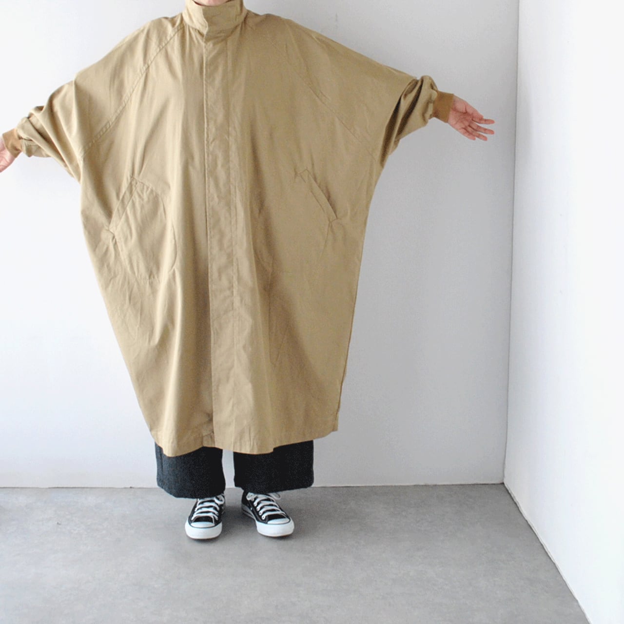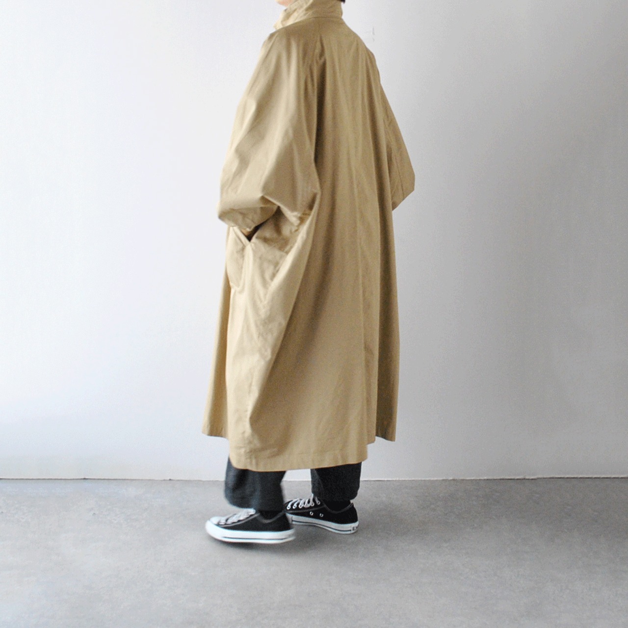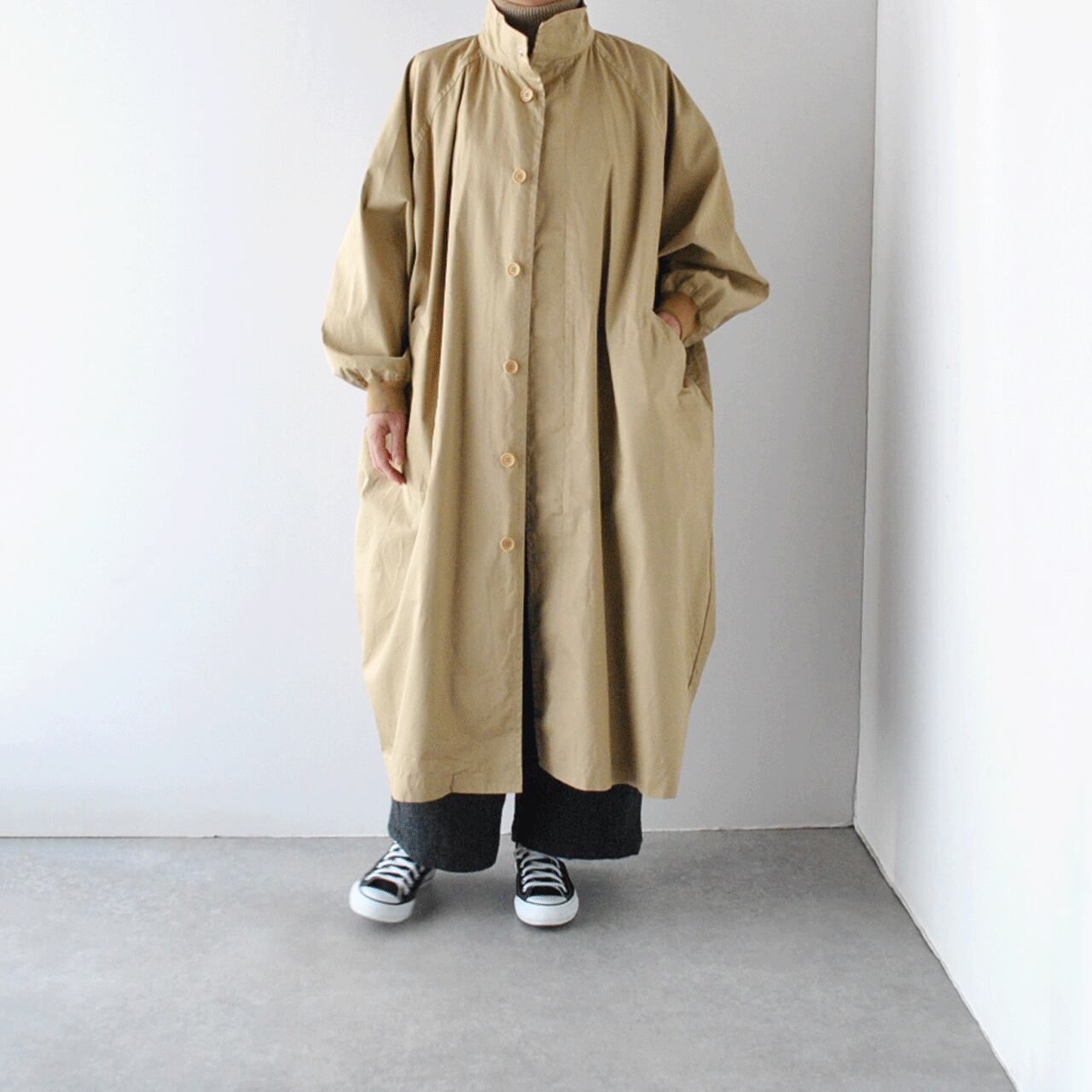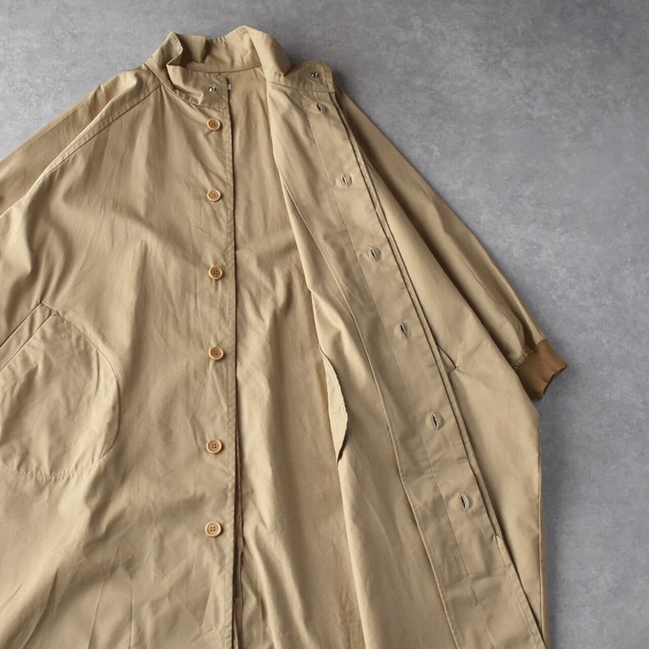 LABORATORYから、たっぷりの身幅と丈感がこなれた印象のスタンドカラーコートが届きました。ボディと袖が一体になったデザインで、名前の通り手を広げるとムササビの様なフォルムになるのが可愛く、遊び心のある一枚です。袖口がリブになっているので、袖がふっくらとしてメンズライクになりすぎないのがポイント。使用しているバーバリーコットンもハリがありながら滑らかで、風を通しにくい上質な生地感ですよ。中にたくさん着込んでもゆったりと楽しんで頂けます。
