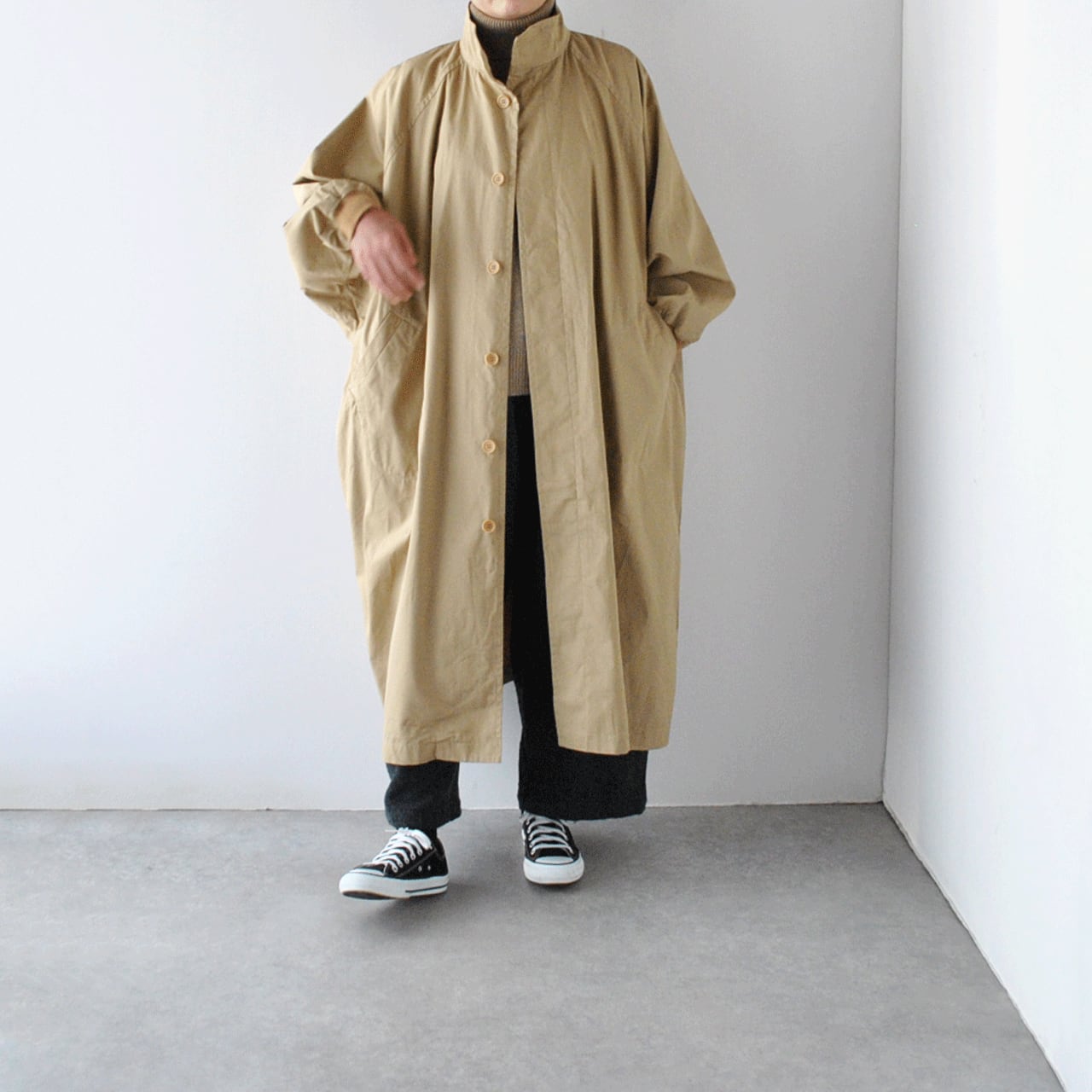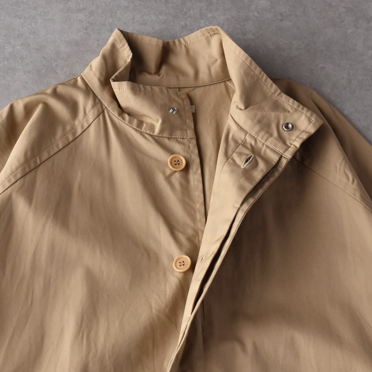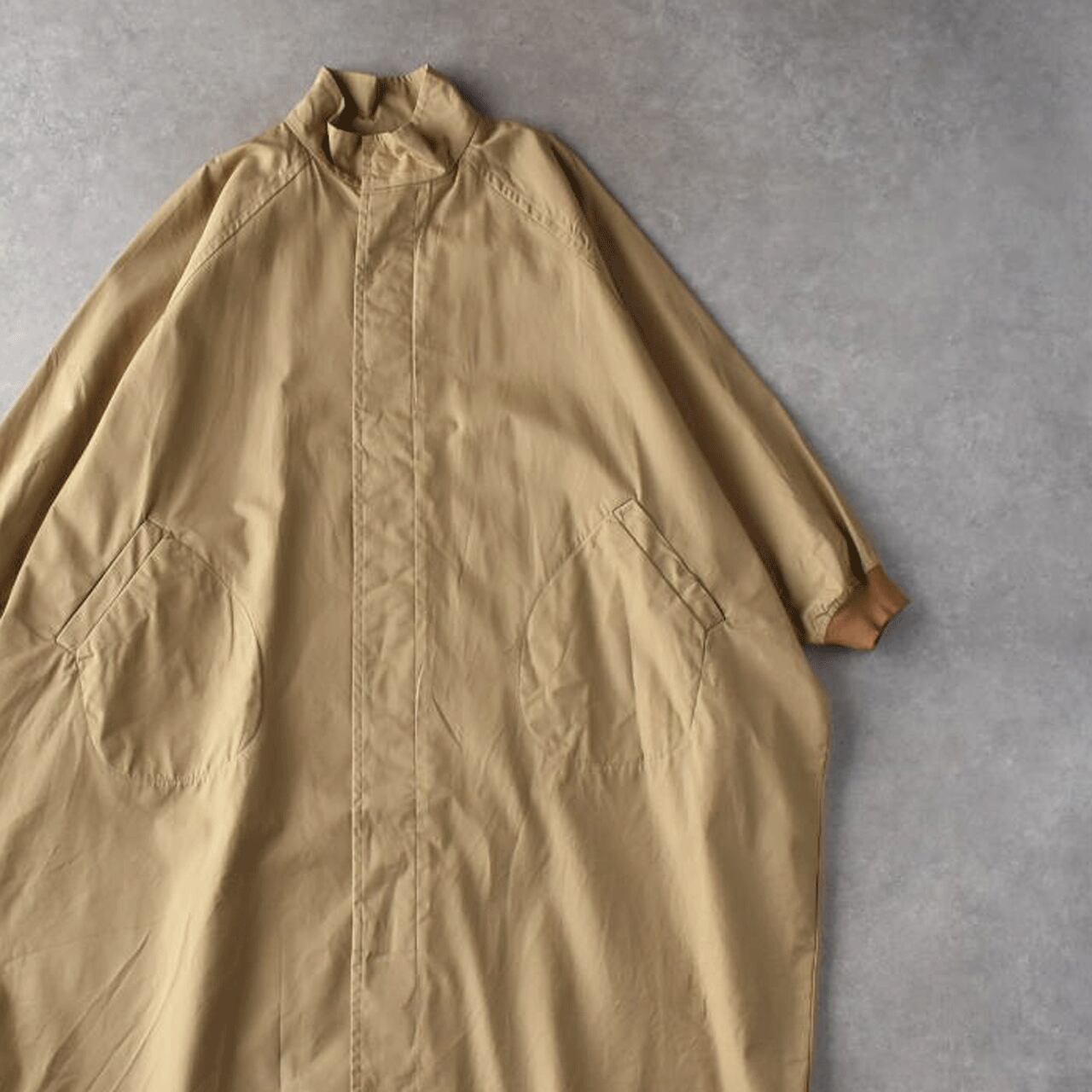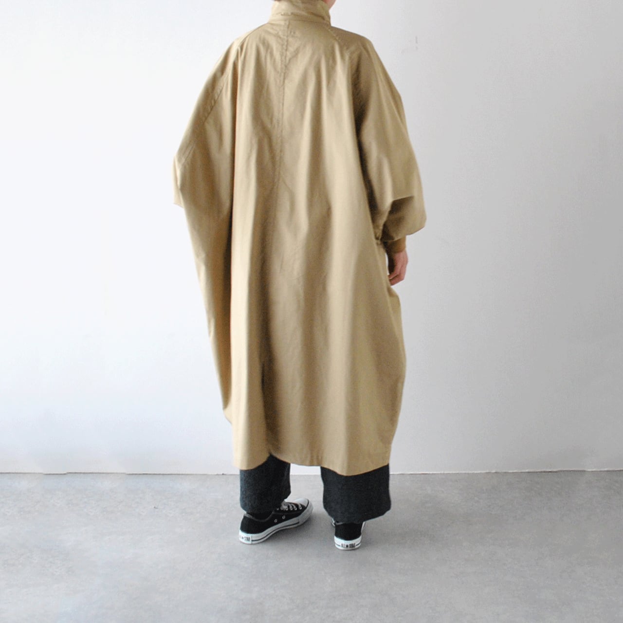 LABORATORYから、たっぷりの身幅と丈感がこなれた印象のスタンドカラーコートが届きました。ボディと袖が一体になったデザインで、名前の通り手を広げるとムササビの様なフォルムになるのが可愛く、遊び心のある一枚です。袖口がリブになっているので、袖がふっくらとしてメンズライクになりすぎないのがポイント。使用しているバーバリーコットンもハリがありながら滑らかで、風を通しにくい上質な生地感ですよ。中にたくさん着込んでもゆったりと楽しんで頂けます。