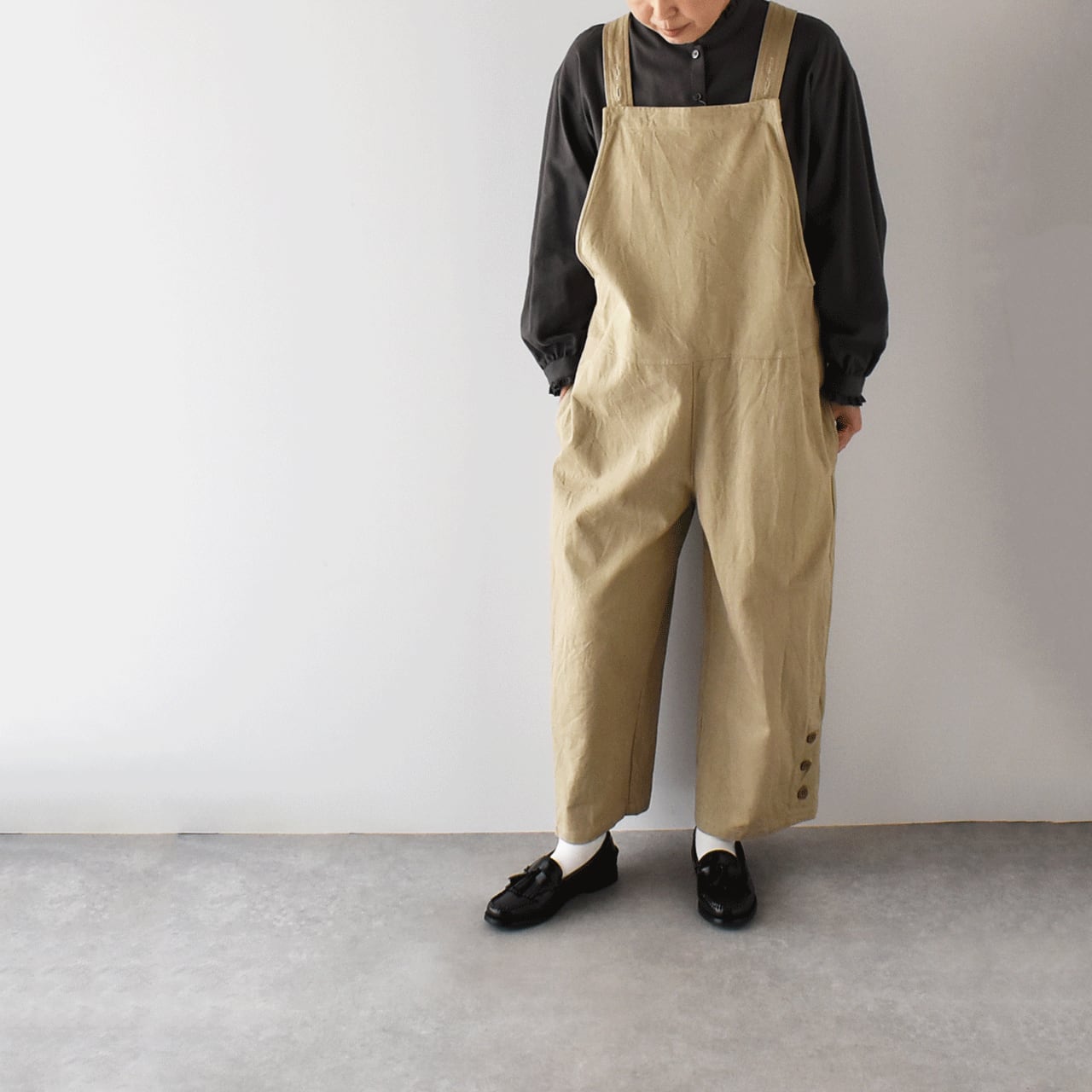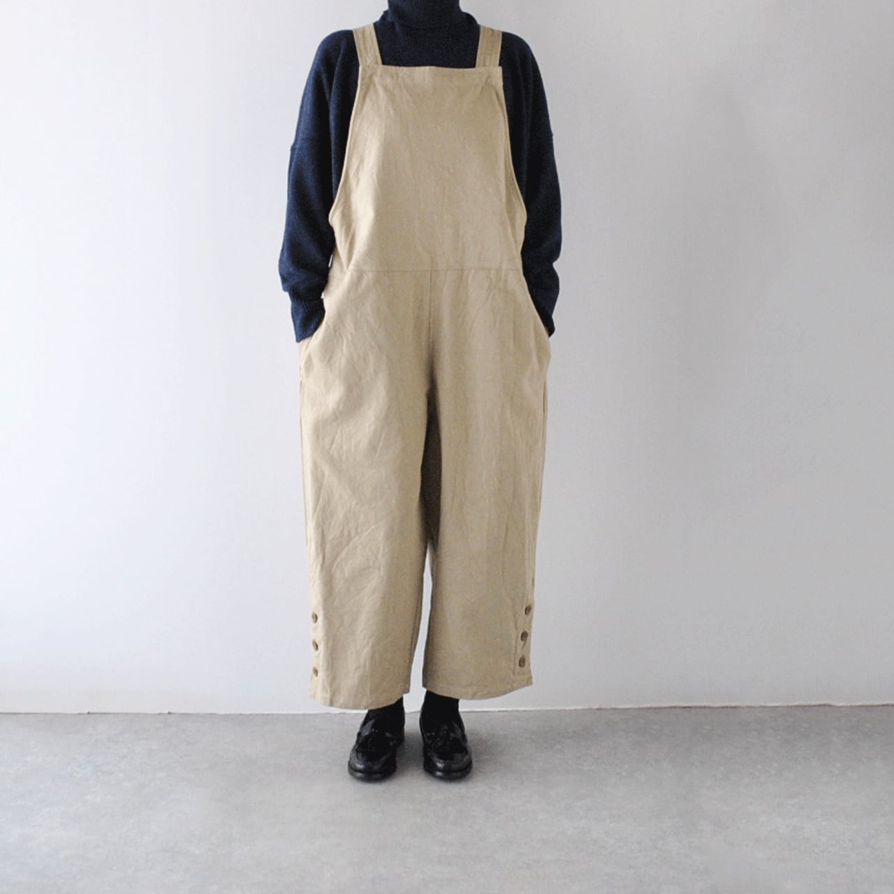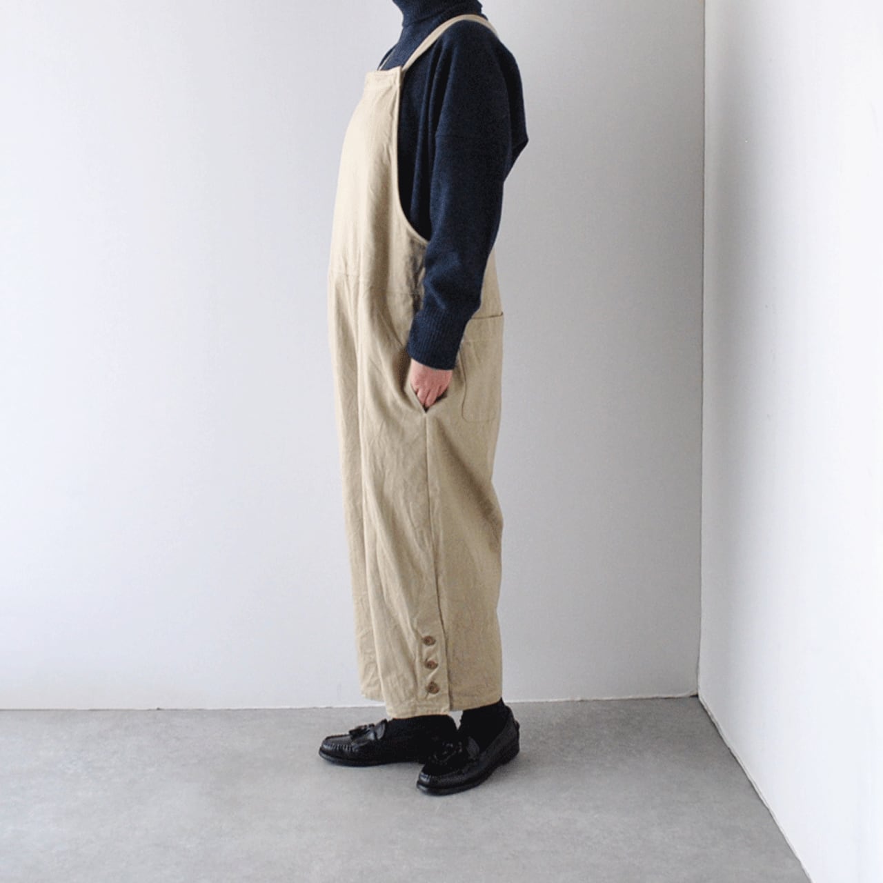 LABORATORYから、様々なインナーとコーディネートしてとっても可愛く楽しめるサロペットが届きました。甘くない、メンズライクなシルエットが素敵な一枚。冬はタートルニット、春になればブラウス、夏はTシャツと、一年を通して沢山楽しんで頂けますよ。程よい厚みのツイル織りコットンは、しっかりとしていながらもしなやかな生地感で、洗いざらして着て頂くとヴィンテージのような風合い。裾に並んだボタンが程よいアクセントになっています。肩紐の長さはボタンで3段階に調節出来ます。