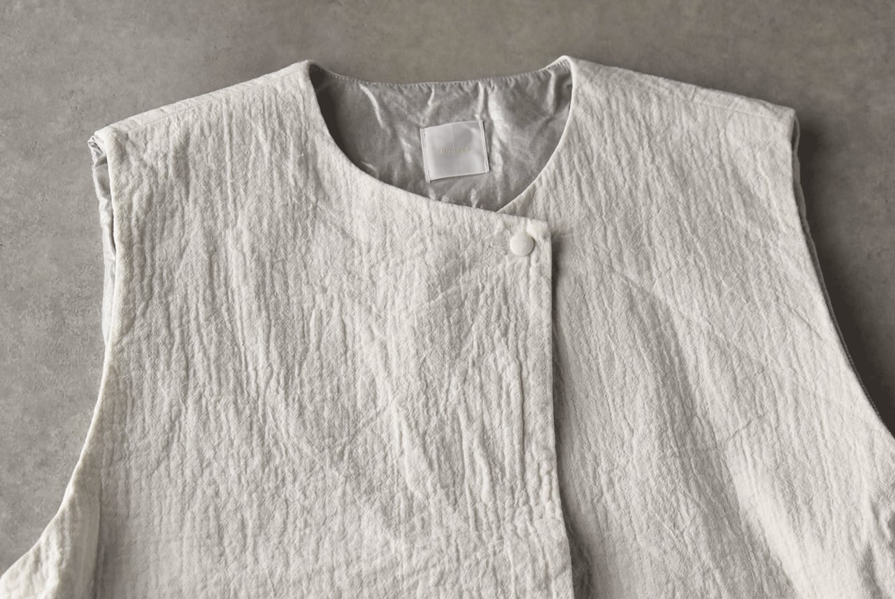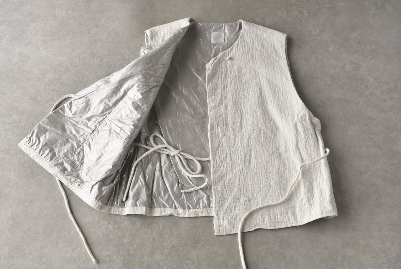 Gauze# から、カシュクールの様にリボンをキュッと結んで着用するキルト素材のベストが届きました。お気に入りのブラウスをはじめ、タートルネックやワンピースに合わせて雰囲気たっぷりに楽しめる一枚です。しっかりと厚みのあるオリジナルのキルト生地も自然なシワ感が豊かな風合いで、裏地には箔加工したコットンをあてがいました。いつものコーディネートにちょっとしたアクセントとしてぜひ一枚プラスしてみて下さいね。
