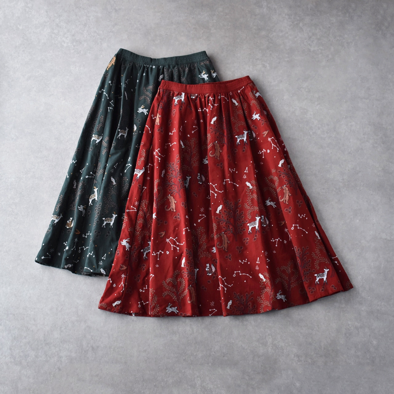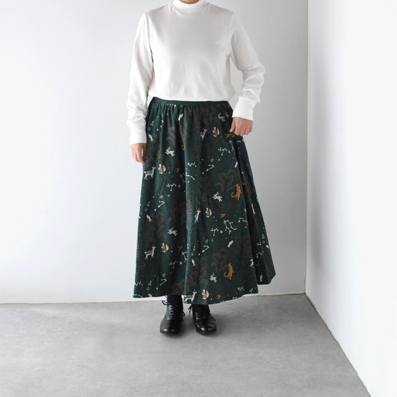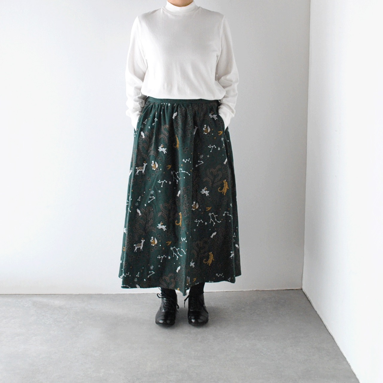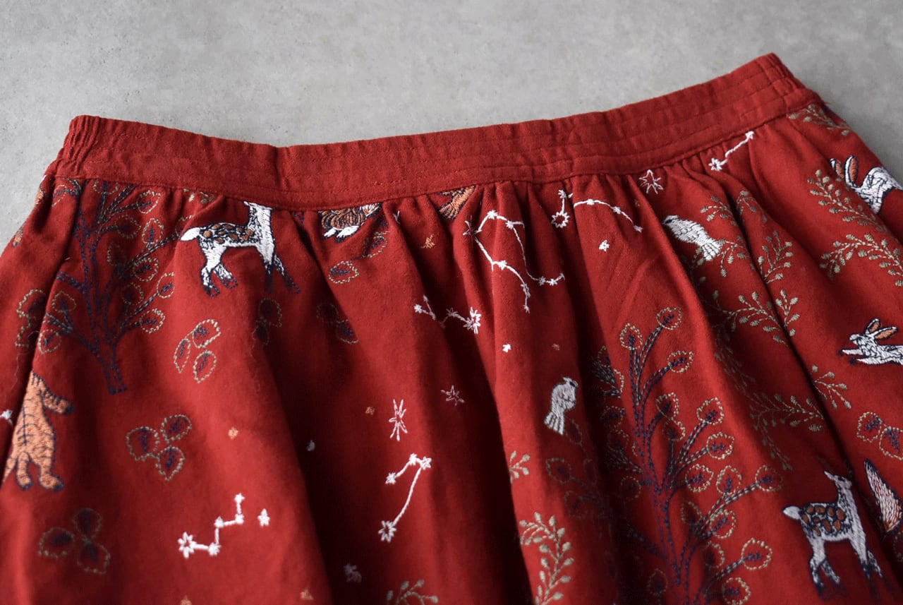 星座が輝く澄んだ冬の夜空の下、原生の森に暮らす生き物たちを総刺繍で表現したmarble SUDの「starry forest」シリーズ。起毛感のあるスウェードタッチのコットン素材は温かみがあり、鮮やかな色使いも冬の装いに華やかさを与えてくれます。フレアスカートはウエストにギャザーを寄せたふんわりシルエットで、シンプルなトップスと合わせるだけでとても絵になる一枚。動く度に緩やかに揺れる姿も素敵ですよ。後ろウエストのみゴム仕様なので、ウエストインも綺麗に決まります。裏地付き。