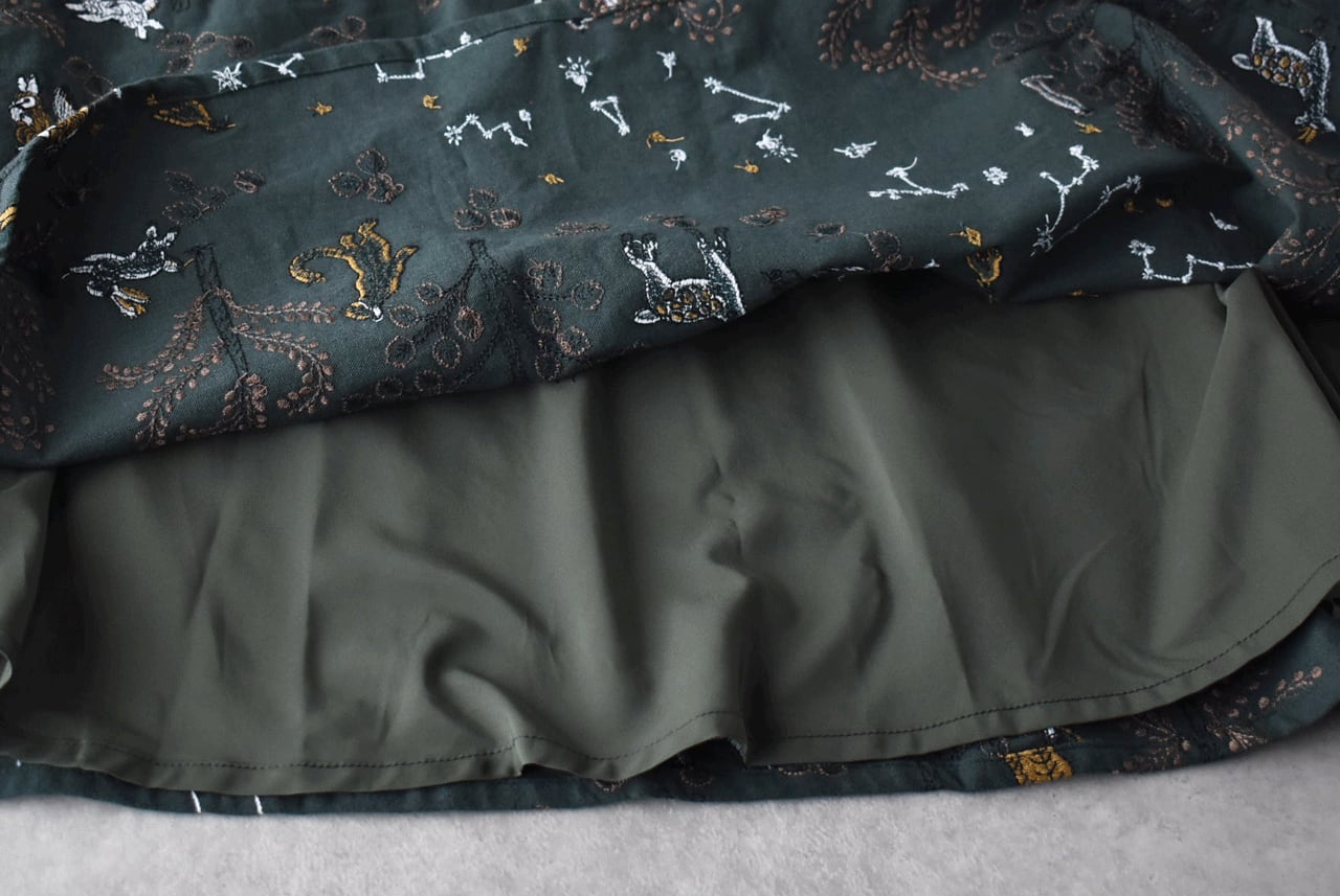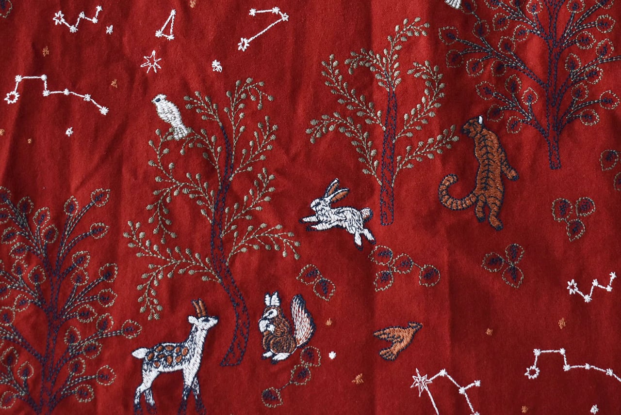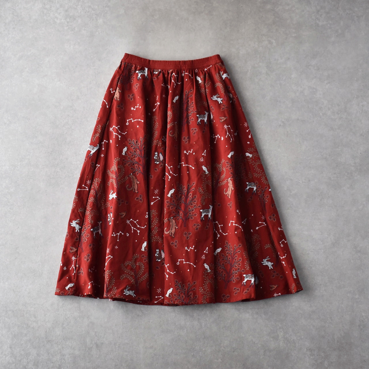 星座が輝く澄んだ冬の夜空の下、原生の森に暮らす生き物たちを総刺繍で表現したmarble SUDの「starry forest」シリーズ。起毛感のあるスウェードタッチのコットン素材は温かみがあり、鮮やかな色使いも冬の装いに華やかさを与えてくれます。フレアスカートはウエストにギャザーを寄せたふんわりシルエットで、シンプルなトップスと合わせるだけでとても絵になる一枚。動く度に緩やかに揺れる姿も素敵ですよ。後ろウエストのみゴム仕様なので、ウエストインも綺麗に決まります。裏地付き。