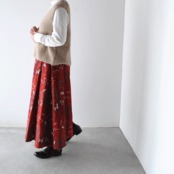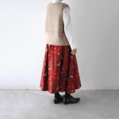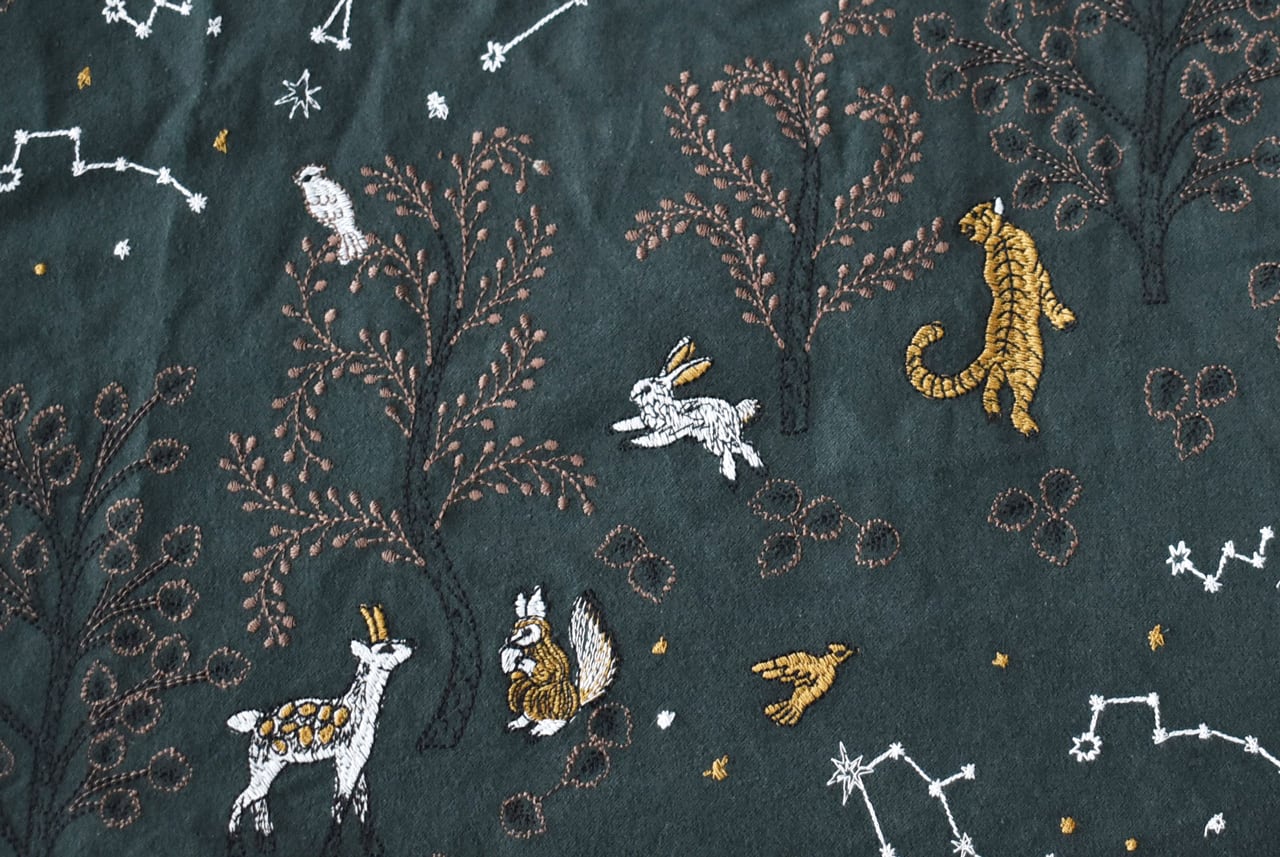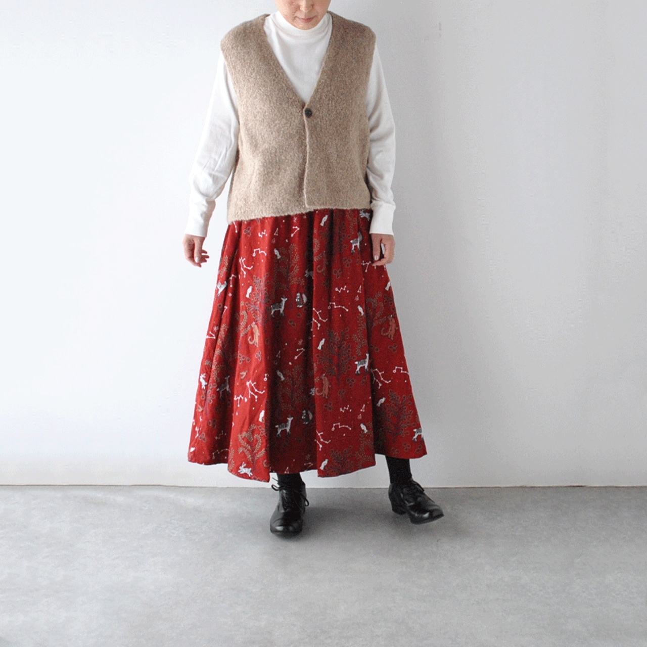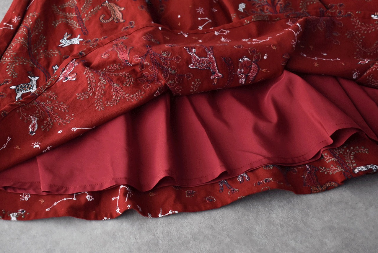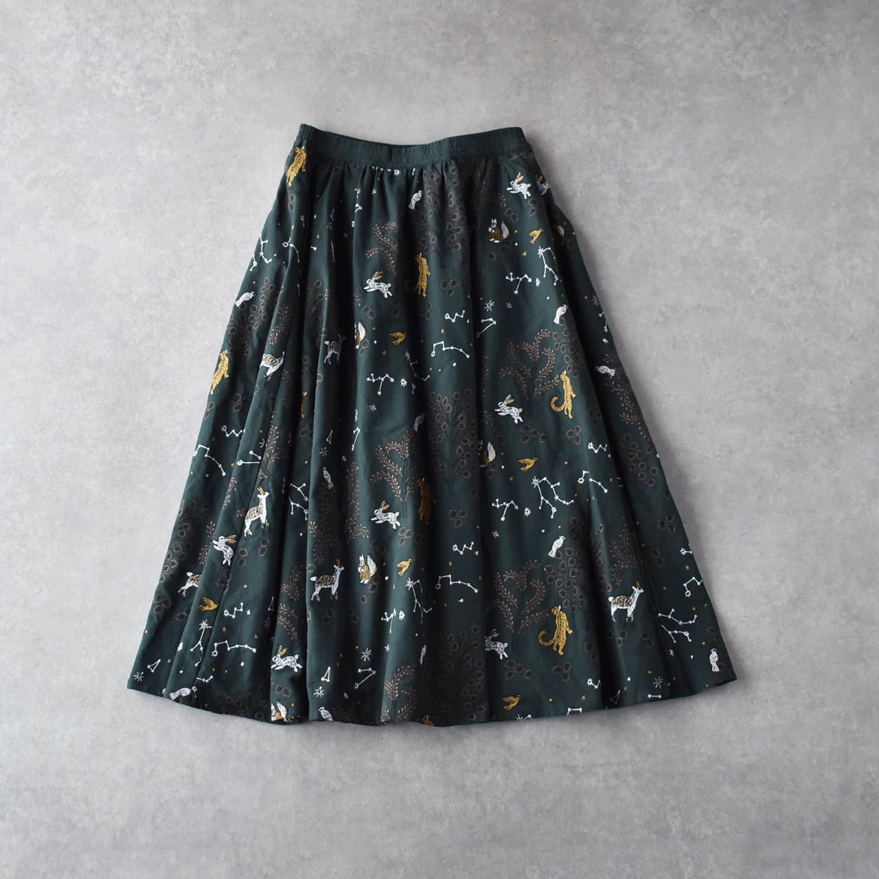 星座が輝く澄んだ冬の夜空の下、原生の森に暮らす生き物たちを総刺繍で表現したmarble SUDの「starry forest」シリーズ。起毛感のあるスウェードタッチのコットン素材は温かみがあり、鮮やかな色使いも冬の装いに華やかさを与えてくれます。フレアスカートはウエストにギャザーを寄せたふんわりシルエットで、シンプルなトップスと合わせるだけでとても絵になる一枚。動く度に緩やかに揺れる姿も素敵ですよ。後ろウエストのみゴム仕様なので、ウエストインも綺麗に決まります。裏地付き。