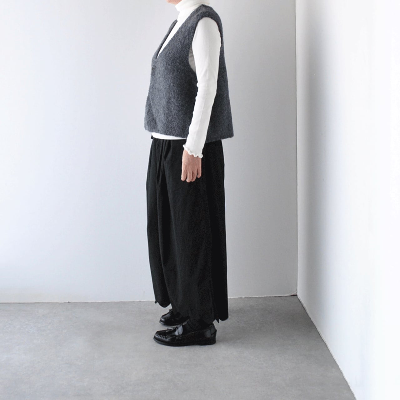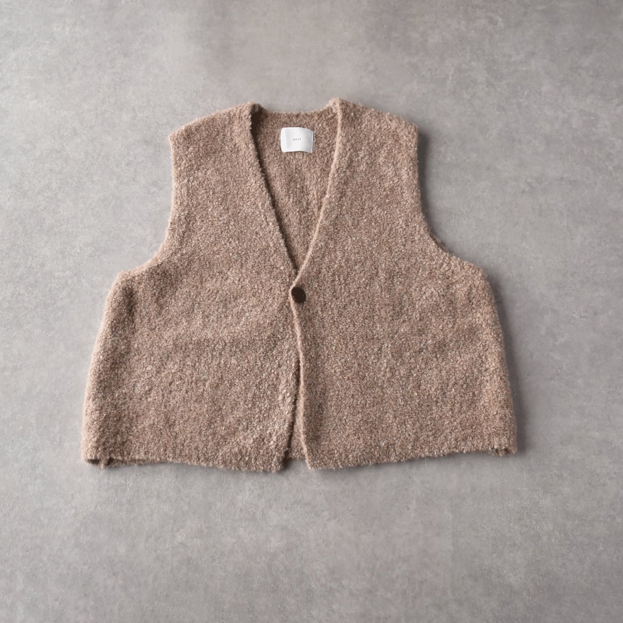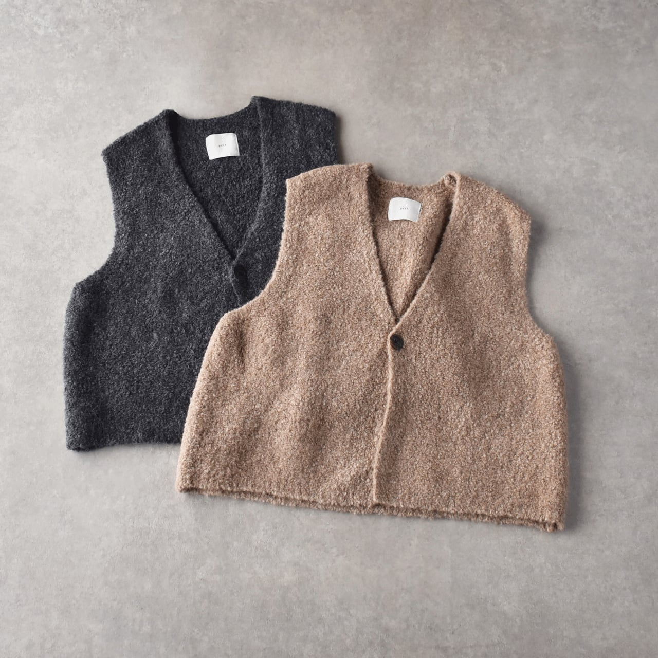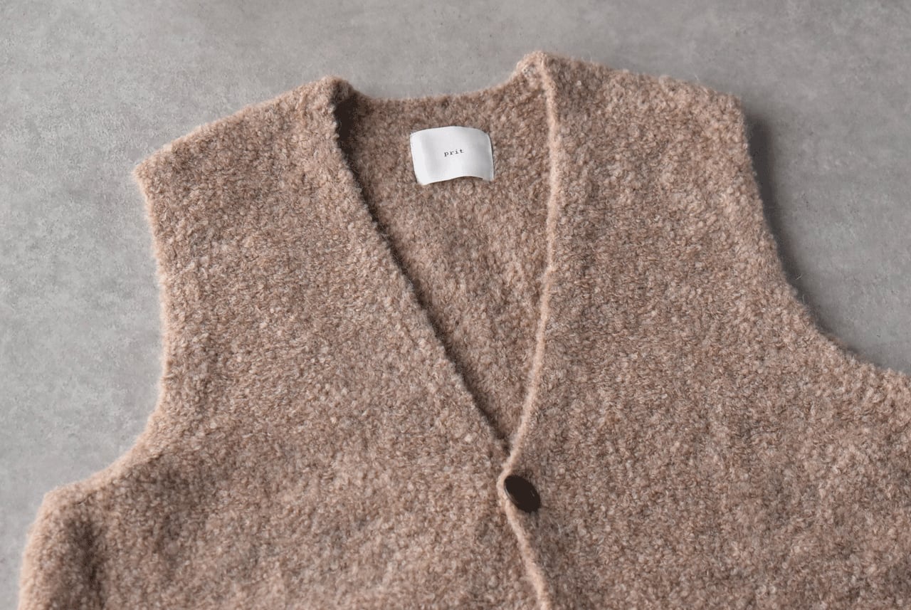 pritから、ふっくらもちもちに編み上げたとっても風合いの良いニットベストが届きました。表面がポコポコとしていて、まるで子犬を撫でているような優しい肌触りが本当に心地いいですよ。シンプルなアイテムですが、ブラウスやワンピースにサッと合わせるだけで、グッと雰囲気よく仕上げてくれる頼もしい一枚。軽くてとても温かいですよ。
