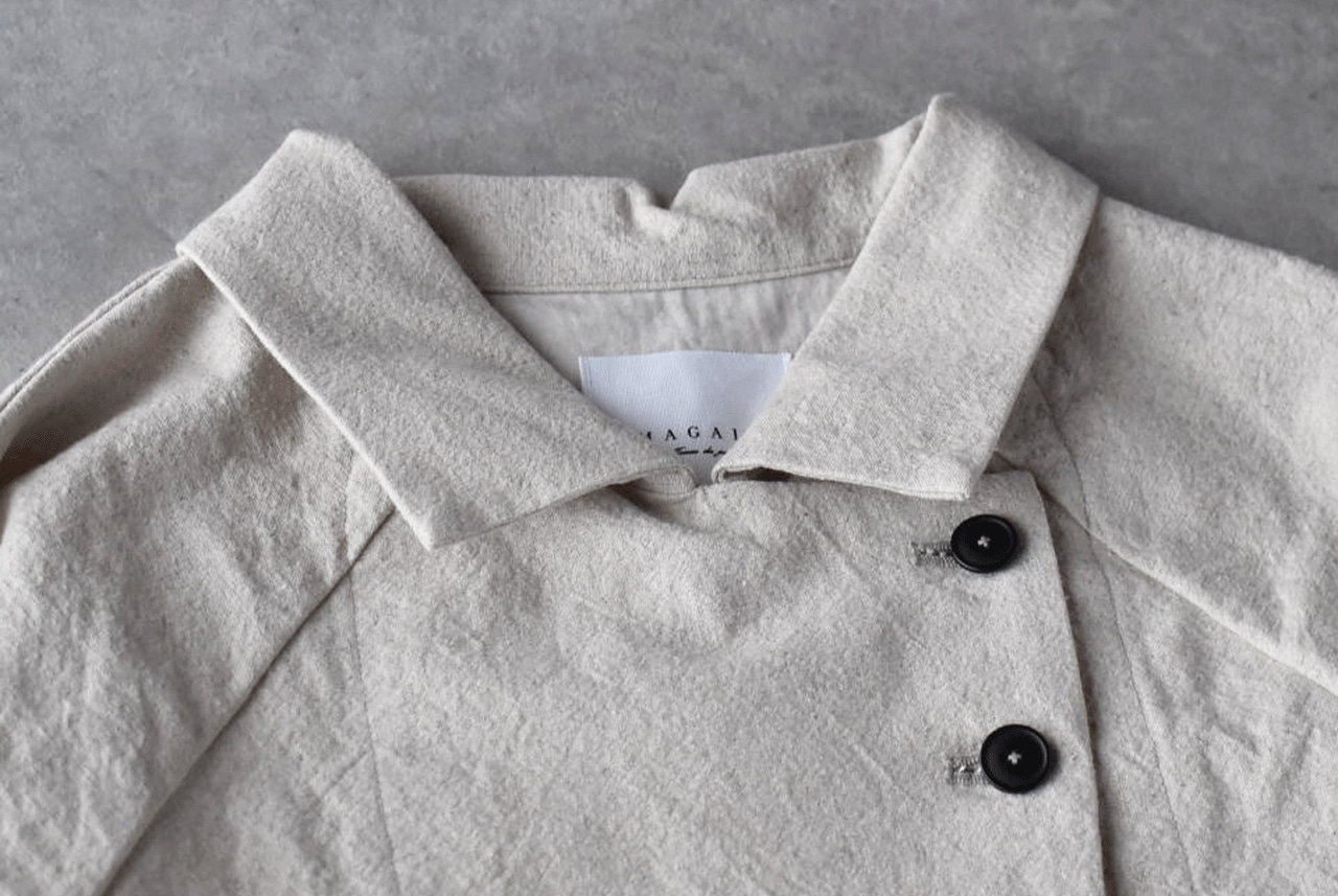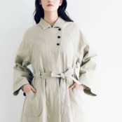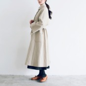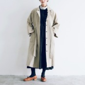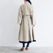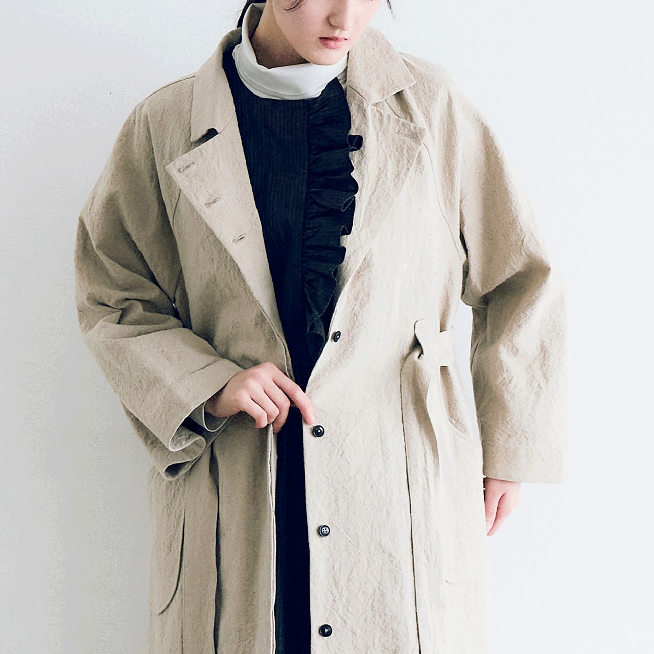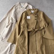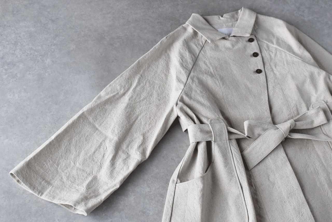 MAGALIから、ウエストリボンをキュッと結んで生まれるシルエットが本当に美しいトレンチコートが届きました。不規則に並んだ胸元のボタン、緩やかに広がる袖、ベルトループと一体になった両サイドの大きなポケットなど、MAGALIらしい素敵ポイントがいっぱい詰まった一枚ですよ。前ボタンはきちっと留めても、開けて折り返して着ても、どちらも本当に素敵に決まります。コットンリネンの生地も上質で重厚な雰囲気があり、着れば着るほど体に馴染み風合いが増していきそう。手に持つと少し重みは感じますが、着用頂くと重みを感じないラクチンな着心地ですよ。その日の気候や気分に合わせて色んな着こなしを楽しんでくださいね。