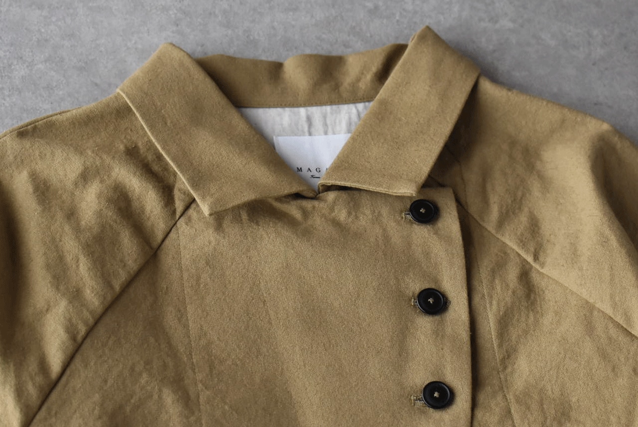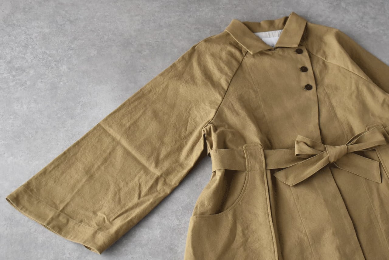 MAGALIから、ウエストリボンをキュッと結んで生まれるシルエットが本当に美しいトレンチコートが届きました。不規則に並んだ胸元のボタン、緩やかに広がる袖、ベルトループと一体になった両サイドの大きなポケットなど、MAGALIらしい素敵ポイントがいっぱい詰まった一枚ですよ。前ボタンはきちっと留めても、開けて折り返して着ても、どちらも本当に素敵に決まります。コットンリネンの生地も上質で重厚な雰囲気があり、着れば着るほど体に馴染み風合いが増していきそう。手に持つと少し重みは感じますが、着用頂くと重みを感じないラクチンな着心地ですよ。その日の気候や気分に合わせて色んな着こなしを楽しんでくださいね。
