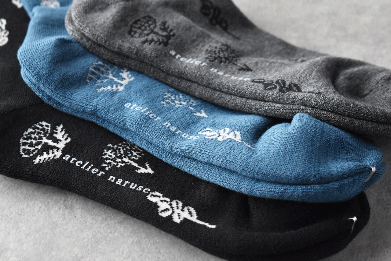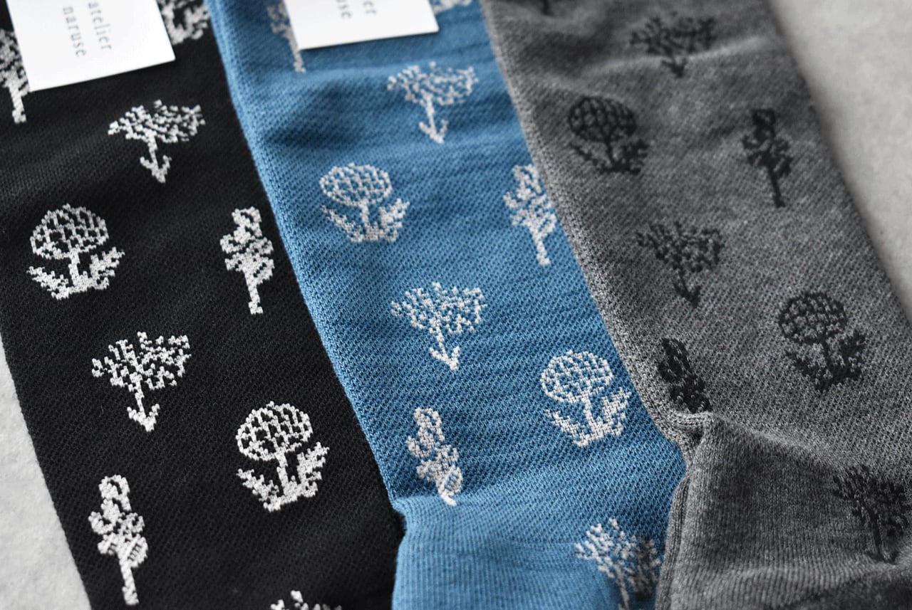 アトリエナルセから、とにかく温かく履ける機能性にこだわり、ここ数シーズンとてもご好評頂いている「着圧」ソックスが入荷しました。今年の柄はナルセオリジナル柄の~monotone flower~ 。間違いない可愛さですよ。着圧ソックスとは、足首からふくらはぎに適度な圧を加えることで、下半身から上半身まで血の巡りが良くなって身体全体をポカポカと温めてくれる効果が見込めるソックスの事。冷え性のナルセさんが「とにかく温かい靴下を!」という熱い思いから製作が実現したそうです。足底は厚みのあるパイル仕様になっていて、フカフカとした履き心地もとても心地よいですよ。
