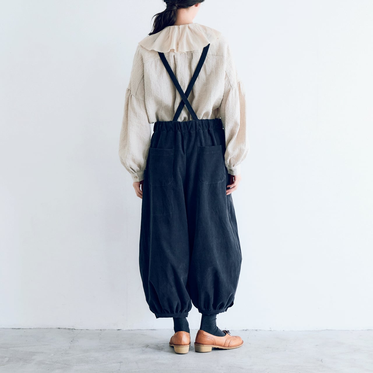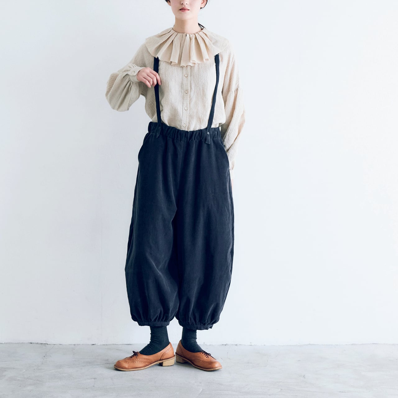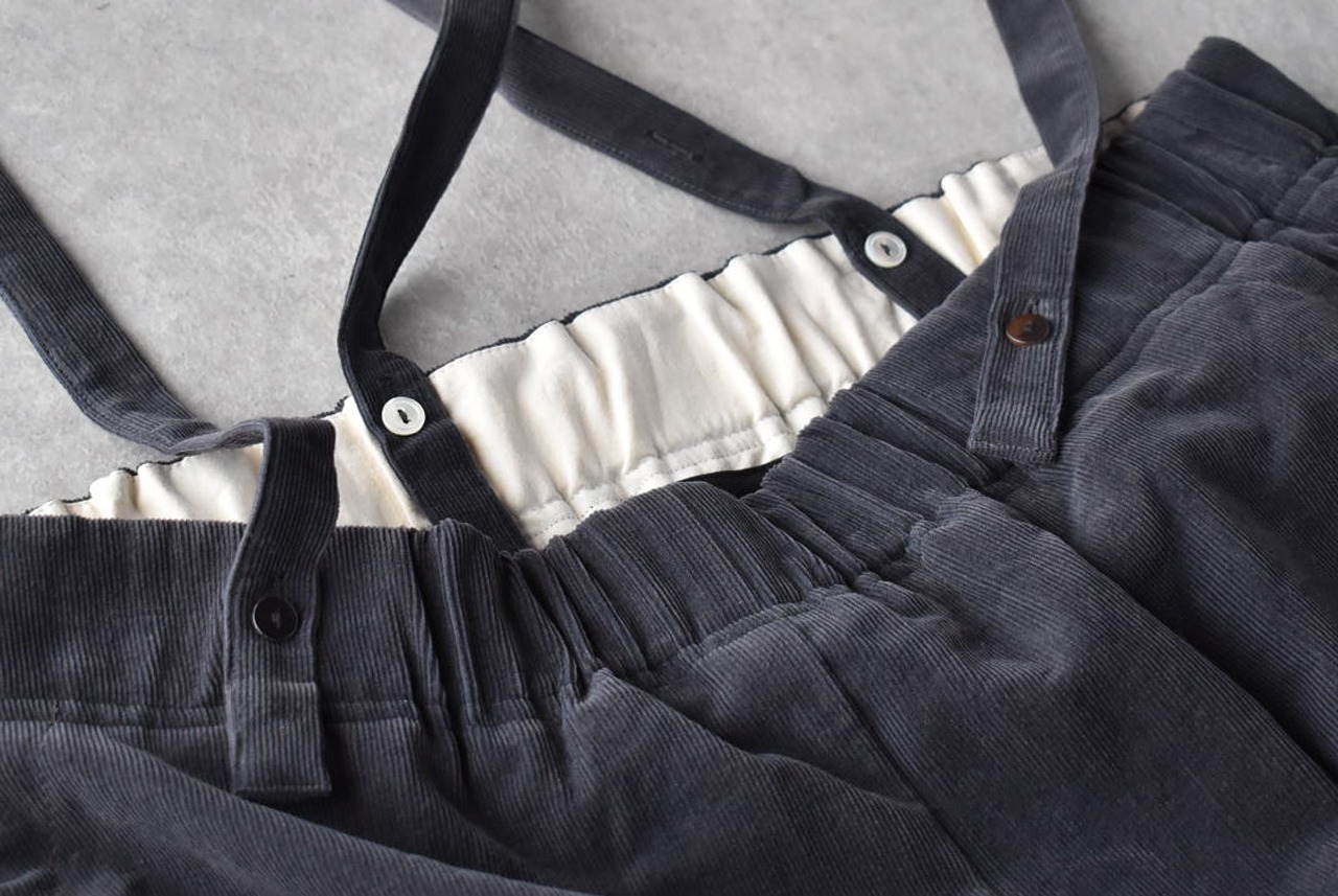 MAGALIから、ヨーロッパの古い絵葉書きに写る少年をイメージしてデザインされたサスペンダー・バルーンパンツが届きました。春夏にもコットンリネン素材でご好評頂いたこちらのパンツ。秋冬のコーデュロイ素材もとても雰囲気よく仕上がっていますよ。ウエストと裾にたっぷりとギャザーを寄せた、空気を含んだようなシルエットは間違いのない可愛さです。股上が深く包み込まれるような軽い履き心地で、コットンの裏地付きなのも安心感があります。細ウネのコーデュロイは堅さがなく、とても柔らかで上品な手触り。サスペンダーの肩紐は3段階の調節が可能で、取り外す事も出来ますので、色んなスタイルで楽しんで下さいね。ヒモ調節可能なゴムウエスト。