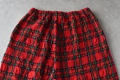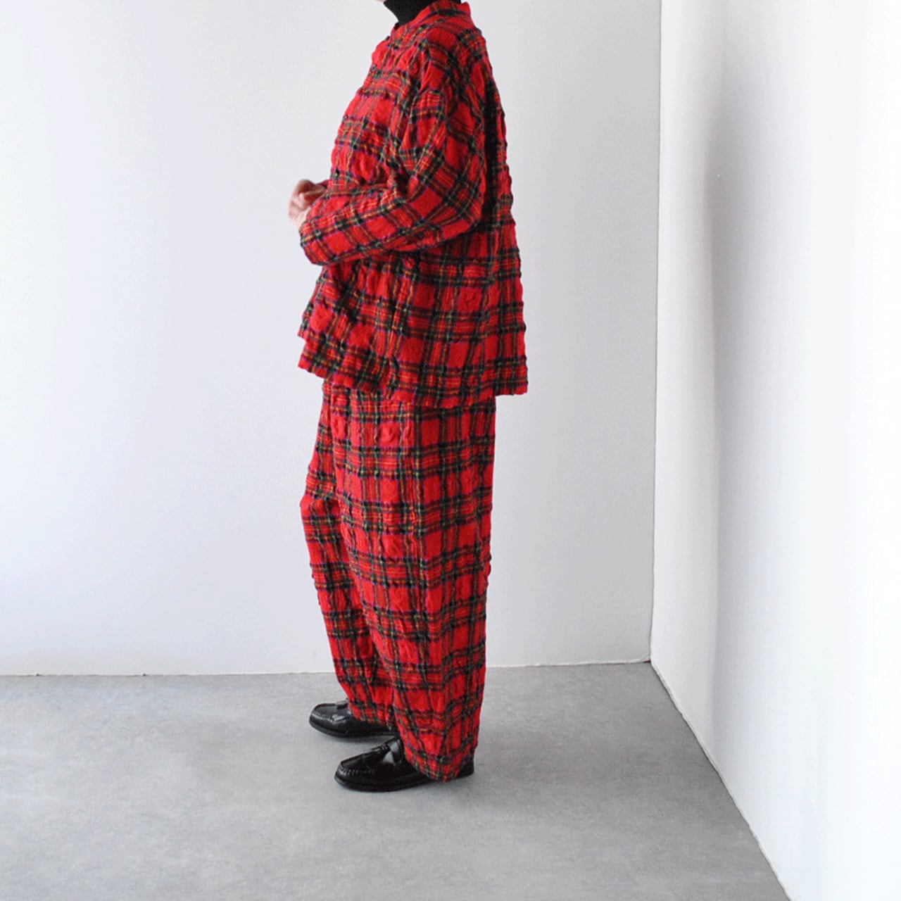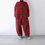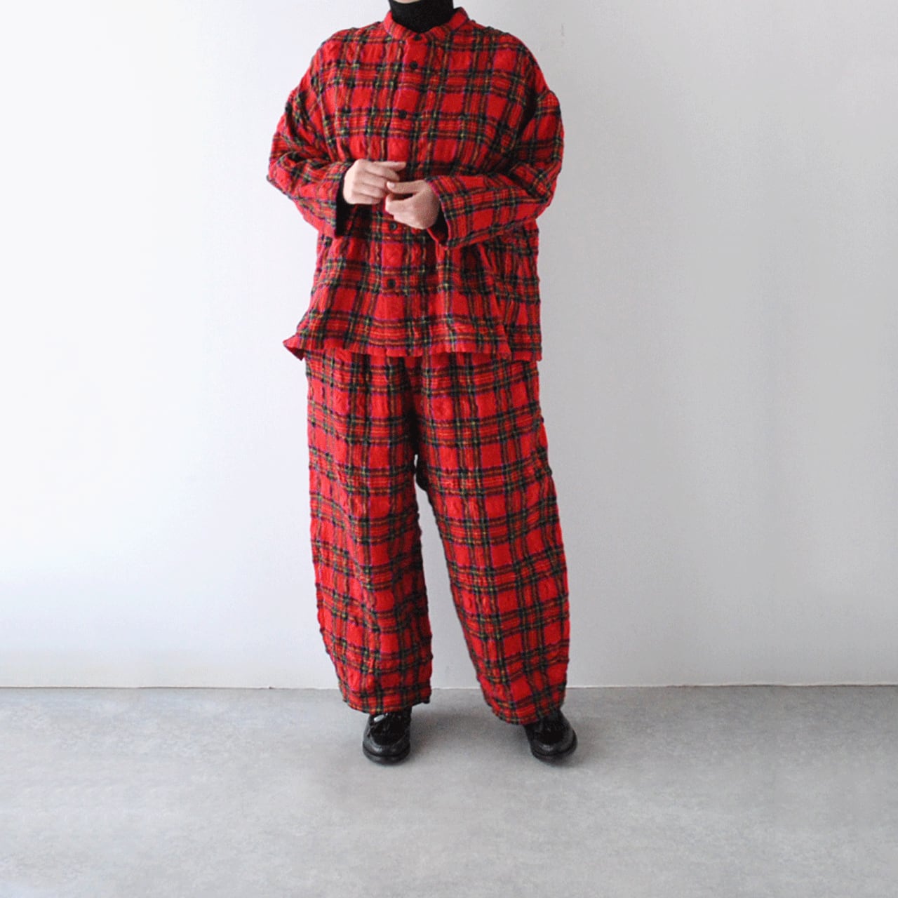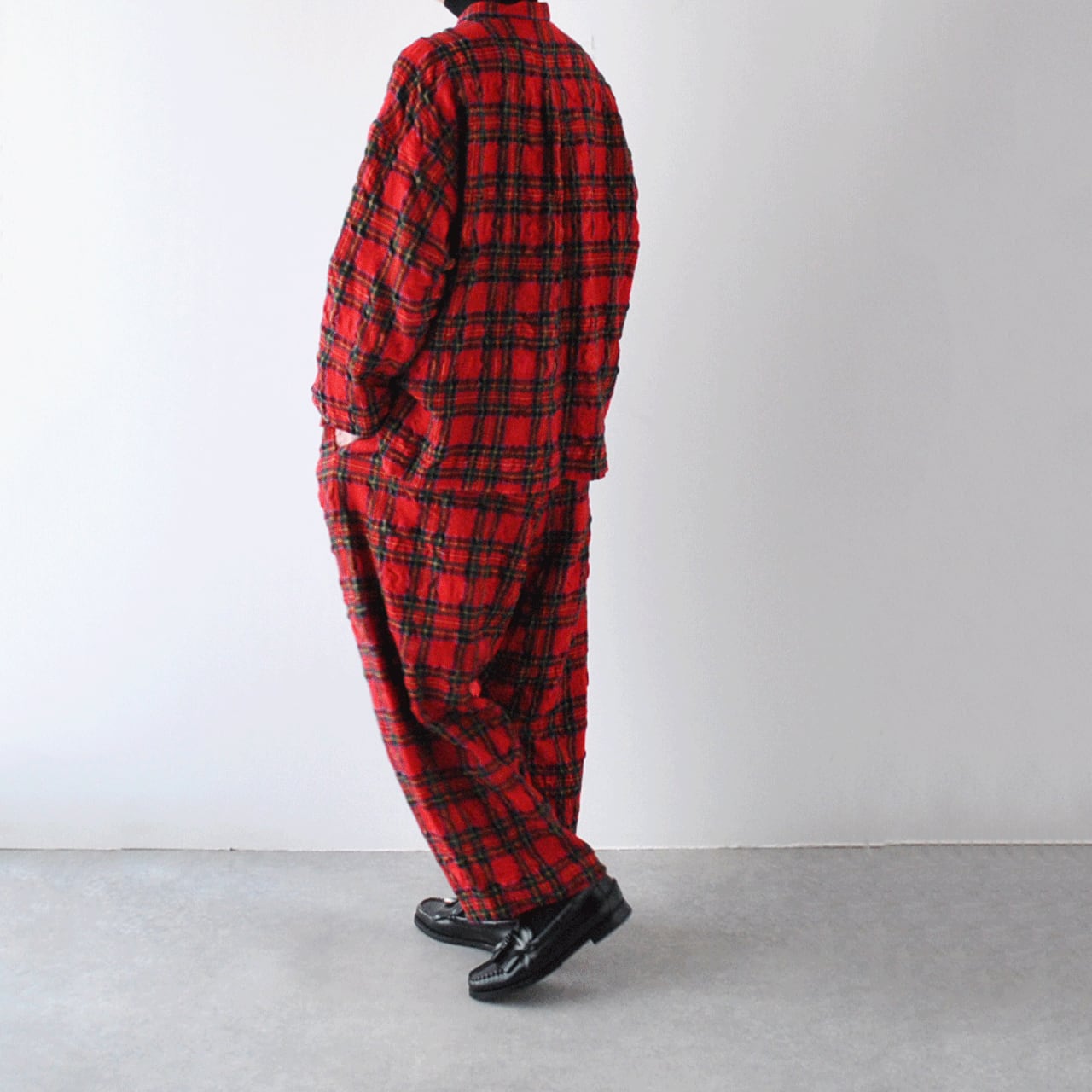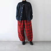 pritから、赤いタータンチェック柄が印象的なバギーパンツが届きました。ゆったりポッテリとした優しいシルエットは、見ているだけでほっこり和みますね。これからの季節はたっぷりとしたニットなどと合わせてゆる~いコーディネートで楽しんで頂くのがオススメ。Gジャンやジャケットなどとも相性がいいですよ。ウールとコットンの収縮差で生まれるウネのある立体的な生地感も温かな表情。同素材のオーバーサイズシャツとセットアップで楽しむのもオススメです。
